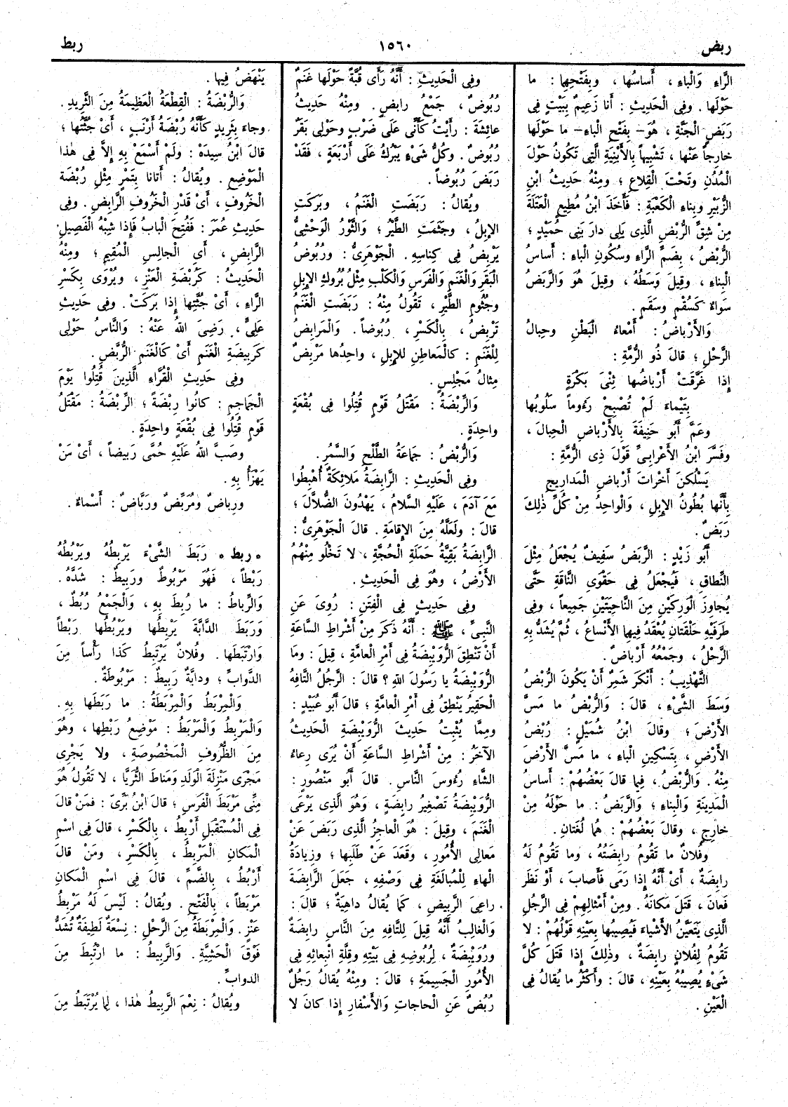 ( * قتل مكانه هكذا في الأصل ولعله أراد أنه قتل المصاب أو المعين في مكانه ) ومن أَمثالهم في الرجل الذي يتعين الأَشياء فيصيبها بعينه قولهم لا تقومُ لفلان رابضةٌ وذلك إِذا قتل كل شيءٍ يصيبه بعينه قال وأَكثر ما يقال في العين وفي الحديث أَنه رأَى قُبَّةً حولها غنم رُيُوضٌ جمع رابض ومنه حديث عائشة رأَيت كأَني على ضَرْبٍ وحَوْلي بقر رُبُوضٌ وكل شيءٍ يبرك على أَربعة فقد رَبَضَ رُبُوضاً ويقال رَبَضَتِ الغنم وبركت الإِبل وجَثَمَتِ الطير والثور الوحشي يَرْبِضُ في كِناسِه الجوهري ورُبُوضُ البَقَرِ والغَنمِ والفَرسِ والكلب مثلُ بُروكِ الإِبل وجُثُومِ الطير تقول منه رَبَضَتِ الغنمُ تَرْبِضُ بالكسر رُبُوضاً والمَرابِضُ للغنم كالمَعاطِنِ للإِبل واحدها مَرْبِض مثال مَجْلِس والرِّبْضةُ مَقْتَلُ قوم قُتِلُوا في بُقْعَةٍ واحدة والرُّبْضُ جماعة الطَّلْحِ والسَّمُرِ وفي الحديث الرَّابِضةُ ملائكة أُهْبِطُوا مع آدم عليه السلام يَهْدُونَ الضُّلاَّلَ قال ولعله من الإِقامة قال الجوهري الرابِضةُ بَقِيَّةُ حَمَلَةِ الحجة لا تخلو منهم الأَرضُ وهو في الحديث وفي حديث في الفتن روي عن النبي صلّى اللّه عليه وسلّم أَنه ذكرَ من أَشراط الساعة أَنْ تَنْطقَ الرُّوَيْبِضَةُ في أَمْرِ العامّةِ قيل وما الرويبضة يا رسول اللّه ؟ قال الرجل التافه الحقير ينطق في أَمْرِ العامّةِ قال أَبو عبيد ومما يثبت حديث الرُّوَيْبِضَة الحديثُ الآخرُ من أَشراطِ الساعة أَن تُرَى رعاءُ الشاءِ رُؤوسَ الناسِ قال أَبو منصور الرُّبَيْضةُ تصغير رابضةٍ وهو الذي يرعى الغنم وقيل هو العاجز الذي رَبَضَ عن معَالي الأُمور وقَعَد عن طَلبها وزيادة الهاء للمبالغة في وصفه جعل الرابِضَة راعِيَ الرَّبِيض كما يقال داهية قال والغالب أَنه قيل للتافه من الناس رابضة ورويبضة لربوضه في بيته وقلة انبعاثه في الأُمور الجسيمة قال ومنه يقال رجل رُبُضٌ عن الحاجات والأَسْفار إِذا كان لا يَنْهَضُ فيها والرُّبْضةُ القِطْعةُ العظيمة من الثَّريدِ وجاء بثريد كأَنه رُبْضةُ أَرْنب أَي جُثَّتُها قال ابن سيده ولم أَسمع به إِلا في هذا الموضع ويقال أَتانا بتمر مثل رُبْضةِ الخَرُوفِ أَي قدر الخروف الرابض وفي حديث عمر ففتح الباب فإِذا شبه الفَصِيل الرابض أَي الجالس المقيم ومنه الحديث كَرُبْضةِ العَنْزِ ويروى بكسر الراء أَي جثتها إِذا بركت وفي حديث علي رضي اللّه عنه والناسُ حَوْلي كَرَبِيضةِ الغنم أَي كالغنم الرُّبَّضِ وفي حديث القُرّاءِ الذين قُتِلُوا يومَ الجماجِم كانوا رِبْضة الرِّبْضةُ مَقْتَلُ قوم قتلوا في بقعة واحدة وصبّ اللّه عليه حُمَّى رَبِيضاً أَي من يَهْزَأُ به ورِباضٌ ومُرَبِّضٌ ورَبَّاضٌ أَسماءٌ
