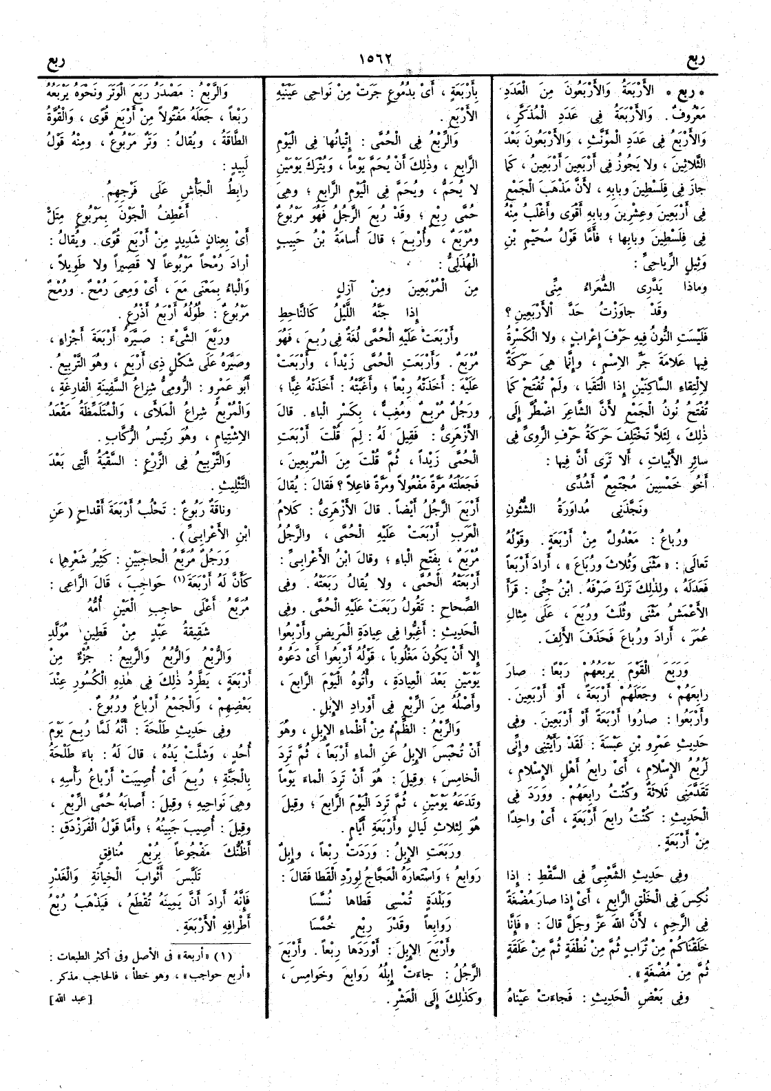 فليست النون فيه حرف إِعراب ولا الكسرة فيها علامة جرِّ الاسم وإِنما هي حركة لالتقاء الساكنين إِذا التقيا ولم تفتح كما تفتح نون الجمع لأَن الشاعر اضطُرَّ إِلى ذلك لئلا تختلف حركة حرف الرويّ في سائر الأَبيات أَلا ترى أَن فيها أَخُو خَمْسِينَ مُجتمِعٌ أَشُدِّي ونَجَّذَني مُداوَرَةُ الشُّؤُونِ ورُباعُ معدول من أَربعة وقوله تعالى مَثْنَى وثُلاثَ ورُباعَ أَراد أَربعاً فعدَله ولذلك ترك صرْفه ابن جني قرأَ الأَعمش مَثْنَى وثُلَثَ ورُبَعَ على مثال عُمر أَراد ورُباع فحذف الأَلف ورَبَعَ القومَ يَرْبَعُهم رَبْعاً صار رابِعَهم وجعلهم أَربعة أَو أَربعين وأَربَعُوا صاروا أَربعة أَو أَربعين وفي حديث عمرو بن عَبْسةَ لقد رأَيْتُني وإِنِّي لرُبُعُ الإِسلام أَي رابِعُ أَهل الإِسلام تقدَّمني ثلاثةٌ وكنت رابعهم وورد في الحديث كنت رابِعَ أَربعة أَي واحداً من أَربعة وفي حديث الشعبي في السَّقْط إِذا نُكِس في الخلق الرابع أَي إِذا صار مُضْغة في الرَّحِم لأَن الله عز وجل قال فإِنا خلقناكم من تُراب ثم من نطفة ثم من علَقة ثم من مُضْغة وفي بعض الحديث فجاءت عيناه بأَربعة أَي بدُموع جرَتْ من نواحي عينيه الأَربع والرِّبْعُ في الحُمَّى إِتيانُها في اليوم الرابع وذلك أَن يُحَمَّ يوماً ويُتْرَك يومين لا يُحَمّ ويُحَمّ في اليوم الرابع وهي حُمَّى رِبْعٍ وقد رُبِع الرجل فهو مَرْبوع ومُرْبَع وأُرْبِعَ قال أُسامةُ بن حبيب الهذلي مِن المُرْبَعِينَ ومن آزِلٍ إِذا جَنَّه الليلُ كالناحِطِ وأَرْبَعَت عليه الحُمَّى لغة في رُبِعَ فهو مُرْبَع وأَربَعَت الحُمّى زيداً وأَرْبَعَت عليه أَخذَته رِبعاً وأَغَبَّتْه أَخذته غِبًّا ورجل مُرْبِعٌ ومُغِبٌّ بكسر الباء قال الأَزهري فقيل له لم قلت أَرْبَعَتِ الحُمَّى زيداً ثم قلت من المُرْبِعين فجعلته مرة مفعولاً ومرة فاعلاً ؟ فقال يقال أَرْبَعَ الرجل أَيضاً قال الأَزهري كلام العرب أَربعت عليه الحمى والرجل مُرْبَع بفتح الباء وقال ابن الأَعرابي أَرْبَعَتْه الحمى ولا يقال رَبَعَتْه وفي الصحاح تقول رَبَعَتْ عليه الحُمّى وفي الحديث أَغِبُّوا في عيادة المريض وأَرْبِعُوا إِلا أَن يكون مغلوباً قوله أَرْبِعُوا أَي دَعُوه يومين بعد العيادة وأْتوه اليوم الرابع وأَصله من الرِّبْع في أَورادِ الإِبل والرِّبْعُ الظِّمْء من أَظْماء الإِبل وهو أَن تُحْبَس الإِبلُ عن الماء أَربعاً ثم تَرِدَ الخامس وقيل هو أَن ترد الماءَ يوماً وتَدَعَه يومين ثم تَرِدَ اليوم الرابع وقيل هو لثلاث ليال وأَربعة أَيام ورَبَعَت الإِبلُ وَرَدتْ رِبعاً وإِبلٌ رَوابِعُ واستعاره العَجَّاج لوِرْد القطا فقال وبَلْدةٍ تُمْسِي قَطاها نُسَّسا رَوابِعاً وقَدْرَ رِبْعٍ خُمَّسا وأَرْبَعَ الإِبلَ أَوردها رِبْعاً وأَرْبعَ الرجلُ جاءت إِبلُه رَوابعَ وخَوامِس وكذلك إِلى العَشْر والرَّبْعُ مصدر رَبَعَ الوَترَ ونحوه يَرْبَعه رَبْعاً جعله مفتولاً من أَربع قُوًى والقوة الطاقةُ ويقال وَتَرٌ مَرْبوعٌ ومنه قول لبيد رابِطُ الجأْشِ على فَرْجِهِمُ أَعْطِفُ الجَوْنَ بمرْبوعٍ مِتَلِّ أَي بعنان شديد من أَربع قُوًى ويقال أَراد رُمْحاً مَرْبوعاً لا قصيراً ولا طويلاً والباء بمعنى مع أَي ومعيَ رُمْح ورمح مربوع طوله أَرْبَعُ أَذْرُعٍ وربَّع الشيءَ صيره أَربعةَ أَجزاء وصيره على شكل ذي أَربع وهو التربيع أَبو عمرو الرُّومِيُّ شِراعُ السفينة الفارغة والمُرْبِعُ شِراعُ المَلأَى والمُتَلَمِّظةُ مَقْعدُ الاشْتِيام وهو رَئيسُ الرُّكابِ والتربيعُ في الزرع السَّقْية التي بعد التثليث وناقة رَبوعٌ تَحْلُبُ أَربعة أَقداح عن ابن الأَعرابي ورجل مُرَبَّعُ الحاجبين كثير شعرهما كأَنَّ له أَربعة حَواجبَ قال الراعي مُرَبَّع أَعلى حاجبِ العينِ أُمُّه شَقيقةُ عَبْدٍ من قَطينٍ مُوَلَّدِ والرُّبْع والرُّبْع والرَّبيعُ جزء من أَربعة يَطَّرد ذلك في هذه الكسور عند بعضهم والجمع أَرباعٌ ورُبوعٌ وفي حديث طلحة أَن