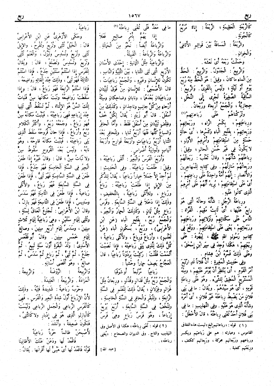 ( * قوله « رباعاتهم إلخ » ليست هذه اللغة في القاموس وعبارته هم على رباعتهم ويكسر ورباعهم وربعاتهم محركة وربعاتهم ككتف وربعتهم كعنبة ) ورِباعَتِهم بكسر الراء ورَبَعاتهم ورَبِعاتِهم بفتح الباء وكسرها أَي حالةٍ حسَنةٍ من اسْتقامتهم وأَمْرِهم الأَوَّل لا يكون في غير حسن الحال وقيل رِباعَتُهم شَأْنُهم وقال ثعلب رَبَعاتُهم ورَبِعاتُهم مَنازِلُهم وفي كتابه للمهاجرين والأَنصار إِنهم أُمَّة واحدة على رِباعتهم أَي على استقامتهم يريد أَنهم على أَمرهم الذي كانوا عليه ورِباعةُ الرجل شأْنه وحالهُ التي هو رابِعٌ عليها أَي ثابت مُقيمٌ الفراء الناس على سَكَناتهم ونَزلاتهم ورَباعتهم ورَبَعاتهم يعني على استقامتهم ووقع في كتاب رسول الله صلى الله عليه وسلم ليهود على رِبْعَتهم هكذا وجد في سِيَر ابن إِسحقَ وعلى ذلك فسره ابن هشام وفي حديث المُغيرة أَن فلاناً قد ارْتَبَعَ أَمْرَ القوم أَي ينتظر أَن يُؤَمَّر عليهم ومنه المُسْتَرْبِعُ المُطيقُ للشيء وهو على رباعة قومه أَي هو سَيِّدهم ويقال ما في بني فلان من يَضْبِطُ رِباعَته غير فلان أَي أَمْرَه وشأْنه الذي هو عليه وفي التهذيب ما في بني فلان أَحد تُغْني رِباعَتُه قال الأَخطل ما في مَعَدٍّ فَتًى تُغْنِي رِباعَتُه إِذا يَهُمُّ بأَمْرٍ صالِحٍ فَعَلا والرِّباعةُ أَيضاً نحو من الحَمالة والرَّباعةُ والرِّباعة القبيلة والرَّباعِيةُ مثل الثمانية إِحدى الأَسنان الأَربع التي تلي الثَّنايا بين الثَّنِيّة والنّاب تكون للإِنسان وغيره والجمع رَباعِياتٌ قال الأَصمعي للإِنسان من فوق ثَنِيّتان ورَباعِيتان بعدهما ونابانِ وضاحِكان وستةُ أَرْحاء من كل جانب وناجِذان وكذلك من أَسفل قال أَبو زيد يقال لكل خُفّ وظِلْف ثَنِيّتان من أَسفل فقط وأَما الحافرُ والسِّباع كلُّها فلها أَربع ثَنايا وللحافر بعد الثنايا أَربعُ رَباعِيات وأَربعة قَوارِحَ وأَربعة أَنْياب وثمانية أَضراس وأَرْبَعَ الفرسُ والبعير أَلقى رَباعِيته وقيل طلعت رَباعِيتُه وفي الحديث لم أَجد إِلا جملاً خِياراً رَباعِياً يقال للذكر من الإِبل إِذا طلَعت رَباعِيتُه رَباعٌ ورَباعٍ وللأُنثى رَباعِيةٌ بالتخفيف وذلك إِذا دخلا في السنة السابعة وفرس رَباعٍ مثل ثَمان وكذلك الحمار والبعير والجمع رُبَع بفتح الباء عن ابن الأَعرابي ورُبْع بسكون الباء عن ثعلب وأَرباع ورِباع والأُنثى رَباعية كل ذلك للذي يُلقِي رَباعيته فإِذا نصبت أَتممت فقلت ركبت بِرْذَوْناً رَباعياً قال العجاج يصف حماراً وحْشيّاً رَباعِياً مُرْتَبِعاً أَو شَوْقَبَا والجمع رُبُعٌ مثل قَذال وقُذُل ورِبْعان مثل غَزال وغِزْلان يقال ذلك للغنم في السنة الرابعة وللبقر والحافر في السنة الخامسة وللخُفّ في السنة السابعة أَرْبَعَ يُرْبِع إِرْباعاً وهو فرس رَباع وهي فرس رَباعِية وحكى الأَزهري عن ابن الأَعرابي قال الخيل تُثْنِي وتُرْبِع وتُقْرِح والإِبل تُثْنِي وتُرْبِع وتُسْدِسُ وتَبْزُلُ والغنم تُثْنِي وتُرْبِع وتُسدس وتَصْلَغُ قال ويقال للفرس إِذا استتم سنتين جَذَع فإِذا استتم الثالثة فهو ثَنيّ وذلك عند إِلقائه رَواضِعَه فإِذا استتم الرابعة فهو رَباع قال وإِذا سقطت رَواضِعه ونبت مكانها سِنّ فنبات تلك السنّ هو الإِثْناء ثم تَسْقُط التي تليها عند إِرباعه فهي رَباعِيته فيَنْبُت مكانه سن فهو رَباع وجمعه رُبُعٌ وأَكثر الكلام رُبُعٌ وأَرْباع فإِذا حان قُرُوحه سقط الذي يلي رَباعيته فينبت مكانه قارِحُه وهو نابُه وليس بعد القروح سقُوط سِنّ ولا نبات سنّ قال وقال غيره إِذا طعَن البعيرُ في السنة الخامسة فهو جذَع فإِذا طعن في السنة السادسة فهو ثَنِيّ فإِذا طعن في السنة السابعة فهو رَباع والأُنثى رَباعِية فإِذا طعن في الثامنة فهو سَدَسٌ وسَدِيس فإِذا طعن في التاسعة فهو بازِل وقال ابن الأَعرابي تُجْذِع العَناق لسنة وتُثْنِي لتمام سنتين وهي رَباعِية لتمام ثلاث سنين وسَدَسٌ لتمام أَربع سنين وصالِغٌ لتمام خمس سنين وقا