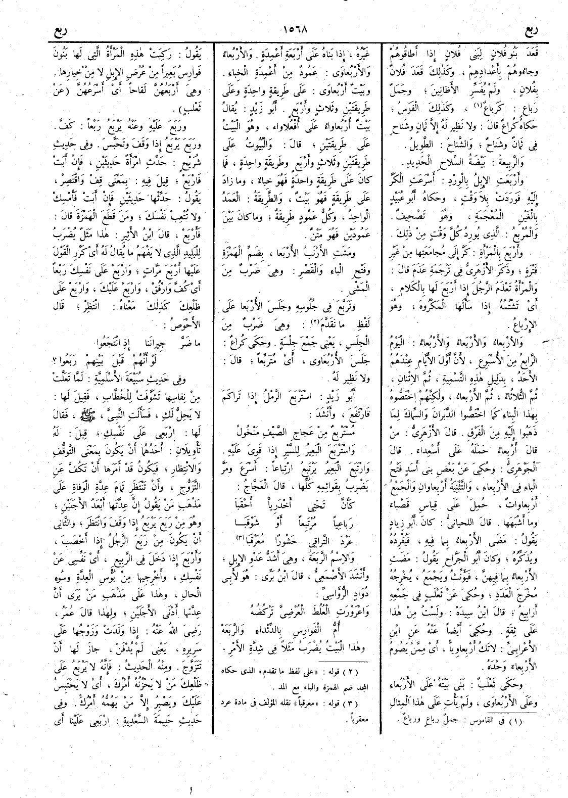 ( * في القاموس جملٌ رباعٍ ورباعٌ ) وكذلك الفرس حكاه كراع قال ولا نظير له إِلاَّ ثمانٍ وشَناحٍ في ثمانٌ وشناحٌ والشناحُ الطويل والرَّبِيعةُ بيضة السّلاح الحديد وأَرْبَعَت الإِبل بالوِرْد أَسْرَعت الكرّ إِليه فوردت بلا وقت وحكاه أَبو عبيد بالغين المعجمة وهو تصحيف والمُرْبِعُ الذي يُورِد كلَّ وقت من ذلك وأَرْبَع بالمرأَة كرّ إِلى مُجامَعتها من غير فَتْرة وذكر الأَزهري في ترجمة عذَم قال والمرأَة تَعْذَم الرجلَ إِذا أَرْبَع لها بالكلام أَي تَشْتُمه إِذا سأَلها المَكْروه وهو الإِرْباعُ والأَرْبِعاء والأَرْبَعاء والأَرْبُعاء اليوم الرابع من الأُسْبوع لأَن أَوّل الأَيام عندهم الأَحد بدليل هذه التسمية ثم الاثنان ثم الثلاثاء ثم الأَربعاء ولكنهم اختصوه بهذا البناء كما اختصوا الدَّبَرانَ والسِّماك لِما ذهبوا إِليه من الفَرْق قال الأَزهري من قال أَربعاء حمله على أَسْعِداء قال الجوهري وحكي عن بعض بني أَسَد فتح الباء في الأَربعاء والتثنية أَرْبعاوان والجمع أَربعاوات حُمِل على قياس قَصْباء وما أَشبهها قال اللحياني كان أَبو زياد يقول مضى الأَربعاء بما فيه فيُفْرده ويذكّره وكان أَبو الجرّاح يقول مضت الأَربعاء بما فيهن فيؤنث ويجمع يخرجه مخرج العدد وحكي عن ثعلب في جمعه أَرابيع قال ابن سيده ولست من هذا على ثقة وحكي أَيضاً عنه عن ابن الأَعرابي لا تَك أَرْبعاوِيّاً أَي ممن يصوم الأَربعاء وحده وحكى ثعلب بنى بَيْته على الأَرْبُعاء وعلى الأَرْبُعاوَى ولم يأعت على هذا المثال غيره إِذا بناه على أَربعة أَعْمِدة والأَرْبُعاء والأَرْبُعاوَى عمود من أَعْمِدة الخِباء وبيت أَرْبُعاوَى على طريقة واحدة وعلى طريقتين وثلاث وأَربع أَبو زيد يقال بيت أُرْبُعاواء على أُفْعُلاواء وهو البيت على طريقتين قال والبيوت على طريقتين وثلاث وأَربع وطريقة واحدة فما كان على طريقة واحدة فهو خباء وما زاد على طريقة فهو بيت والطريقةُ العَمَدُ الواحد وكلُّ عمود طريقةٌ وما كان بين عمودين فهو مَتْنٌ ومَشت الأَرْنَبُ الأُرْبَعا بضم الهمزة وفتح الباء والقصر وهي ضرب من المَشْي وتَرَبَّع في جلوسه وجلس الأُرْبَعا على لفظ ما تقدم