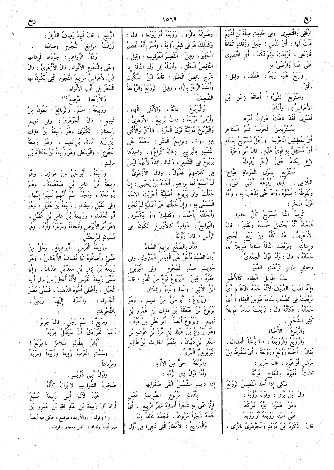 ورَبِيعةُ اسم والرَّبائع بُطون من تميم قال الجوهري وفي تَميم رَبِيعتانِ الكبرى وهو رَبِيعة بن مالك بن زَيْد مَناةَ بن تميم وهو ربيعة الجُوع والوسطى وهو رَبيعة بن حنظلة بن مالك ورَبِيعةُ أَبو حَيّ من هَوازِن وهو ربيعة بن عامر بن صَعْصَعةَ وهم بنو مَجْدٍ ومجدٌ اسم أُمهم نُسِبوا إِليها وفي عُقَيْل رَبيعتان رَبِيعة بن عُقَيل وهو أَبو الخُلَعاء وربيعة بن عامر بن عُقيل وهو أَبو الأَبْرص وقُحافةَ وعَرْعرةَ وقُرّةَ وهما ينسبان للرَّبيعتين ورَبِيعةُ الفرَس أَبو قَبِيلة رجل من طيّء وأَضافوه كما تضاف الأَجناس وهو رَبِيعة بن نِزار بن مَعدّ بن عَدْنان وإِنما سمي ربيعة الفَرَس لأَنه أُعطي من مال أَبيه الخيل وأُعطي أَخوه الذهَب فسمي مُضَر الحَمْراء والنسبة إِليهم ربَعي بالتحريك ومِرْبَع اسم رجل قال جرير زَعَمَ الفَرَزْدَقُ أَن سَيَقْتُل مِرْبعاً أَبْشِرْ بِطُول سَلامةٍ يا مِرْبَع وسمت العرب رَبِيعاً ورُبَيْعاً ومِرْبَعاً ومِرْباعاً وقول أَبي ذؤيب صَخِبُ الشَّوارِبِ لا يَزالُ كأَنه عَبْدٌ لآلِ أَبي رَبِيعةَ مُسْبَعُ أَراد آل ربيعة بن عبد الله بن عمرو بن
