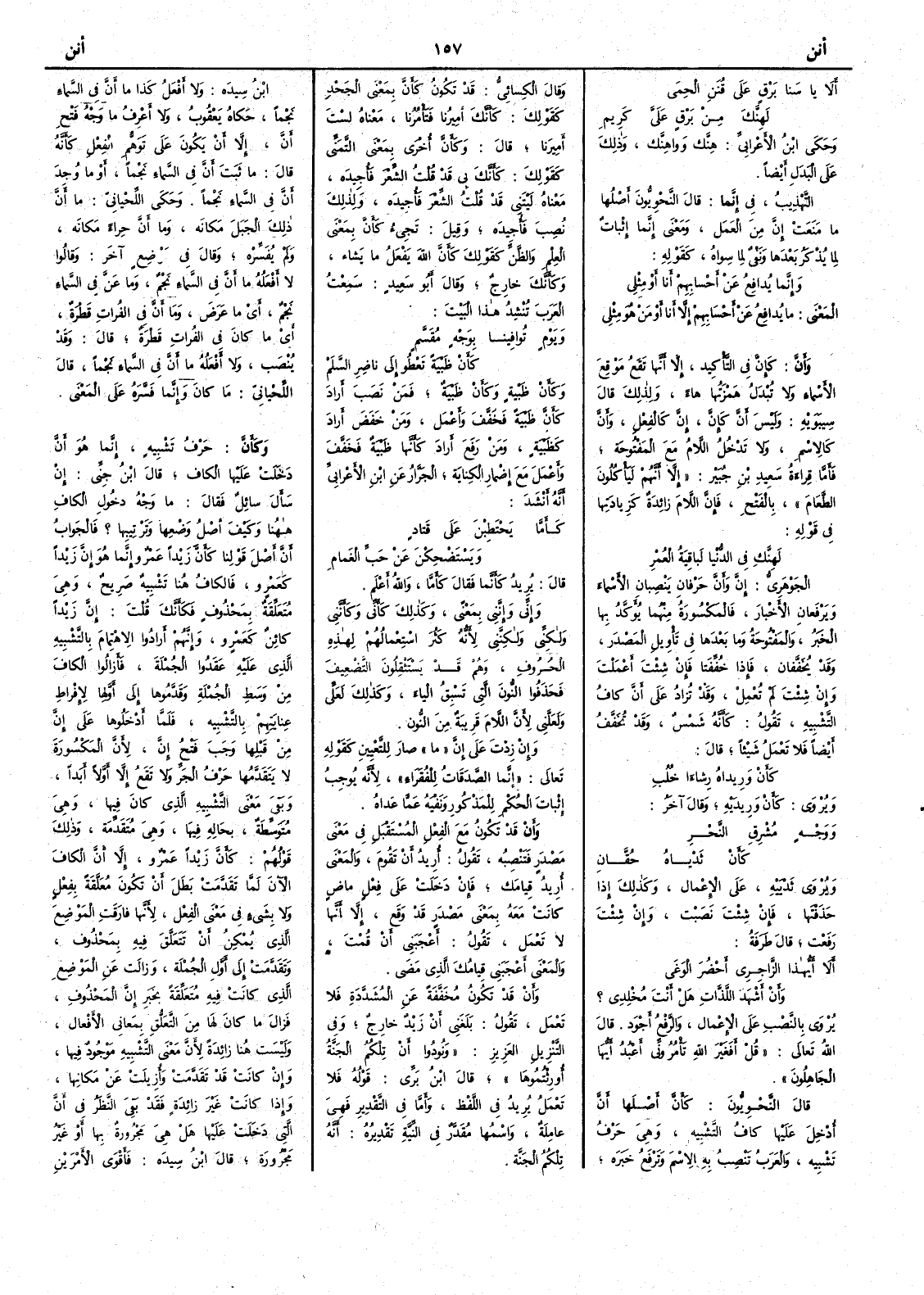 أَلا يا سَنا بَرْقٍ على قُنَنِ الحِمَى لَهِنّكَ من بَرْقٍ عليَّ كريم وحِكى ابن الأَعرابي هِنّك وواهِنّك وذلك على البدل أَيضاً التهذيب في إنّما قال النحويون أَصلها ما مَنَعت إنَّ من العمل ومعنى إنما إثباتٌ لما يذكر بعدها ونفيٌ لما سواه كقوله وإنما يُدافعُ عن أَحسابهم أَنا ومِثْلي المعنى ما يُدافع عن أَحسابِهم إلا أَنا أَو مَنْ هو مِثْلي وأَنَّ كإن في التأْكيد إلا أَنها تقع مَوْقِعَ الأَسماء ولا تُبْدَل همزتُها هاءً ولذلك قال سيبويه وليس أَنَّ كإنَّ إنَّ كالفِعْلِ وأَنَّ كالاسْمِ ولا تدخل اللامُ مع المفتوحة فأَما قراءة سعيد بن جُبيَر إلاَّ أَنهم ليأْكلون الطعام بالفتح فإن اللام زائدة كزيادتها في قوله لَهِنَّك في الدنيا لبَاقيةُ العُمْرِ الجوهري إنَّ وأَنَّ حرفان ينصبان الأَسماءَ ويرفعان الأَخبارَ فالمكسورةُ منهما يُؤكَّدُ بها الخبرُ والمفتوحة وما بعدها في تأْويل المصدر وقد يُخَفِّفان فإذا خُفِّفتا فإن شئتَ أَعْمَلْتَ وإن شئت لم تُعْمِلْ وقد تُزادُ على أَنَّ كافُ التشبيه تقول كأَنه شمسٌ وقد تخفف أَيضاً فلا تعْمَل شيئاً قال كأَنْ ورِيداهُ رِشاءَا خُلُب ويروى كأَنْ ورِيدَيْهِ وقال آخر ووَجْهٍ مُشْرِقِ النحرِ كأَنْ ثَدْياه حُقَّانِ ويروى ثَدْيَيْه على الإعمال وكذلك إذا حذفْتَها فإن شئت نصبت وإن شئت رفعت قال طرفة أَلا أَيُّهَذا الزاجِرِي أَحْضُرَ الوغَى وأَن أَشْهَدَ اللَّذَّاتِ هل أَنتَ مُخْلدي ؟ يروى بالنصب على الإعمال والرفْعُ أَجود قال الله تعالى قل أَفغَيْرَ الله تأْمرونِّي أَعبُدُ أَيُّها الجاهلون قال النحويون كأَنَّ أَصلُها أَنَّ أُدخِلَ عليها كافُ التشبيه وهي حرفُ تشبيه والعربُ تنصب به الاسمَ وترفع خبرَه وقال الكسائي قد تكون كأَنَّ بمعنى الجحد كقولك كأَنك أميرُنا فتأْمُرُنا معناه لستَ أََميرَنا قال وكأَنَّ أُخرى بمعنى التَّمَنِّي كقولك كأَنك بي قد قلتُ الشِّعْرَ فأُجِيدَه معناه لَيْتَني قد قلتُ الشِّعْرَ فأُجيدَه ولذلك نُصِب فأُجيدَه وقيل تجيء كأَنَّ بمعنى العلم والظنِّ كقولك كأَنَّ الله يفعل ما يشاء وكأَنك خارجٌ وقال أَبو سعيد سمعت العرب تُنشِد هذا البيت ويومٍ تُوافينا بوَجْهٍ مُقَسَّمٍ كأَنْ ظَبْيَةً تَعْطُو إلى ناضِرِ السَّلَمْ وكأَنْ ظَبْيَةٍ وكأَنْ ظَبْيَةٌ فمن نَصَبَ أَرادَ كأَنَّ ظَبْيَةً فخفف وأَعْمَل ومَنْ خفَض أَراد كظَبْيَةٍ ومَن رفع أَراد كأَنها ظبْيَةٌ فخفَّفَ وأَعْمَل مع إضمارِ الكِناية الجرار عن ابن الأَعرابي أَنه أَنشد كأمَّا يحْتَطِبْنَ على قَتادٍ ويَسْتَضْكِكْنَ عن حَبِّ الغَمامِ قال يريد كأَنما فقال كأَمَّا والله أَعلم وإنِّي وإنَّني بمعنى وكذلك كأَنِّي وكأَنَّني ولكنِّي ولكنَّني لأَنه كثُر استعمالهم لهذه الحروف وهم قد يَسْتَثْقِلون التضعيف فحذفوا النون التي تَلي الياء وكذلك لَعَلِّي ولَعَلَّني لأَن اللام قريبة من النون وإن زِدْتَ على إنَّ ما صارَ للتَّعيين كقوله تعالى إنما الصَّدَقاتُ للفُقراء لأَنه يُوجِبُ إثْباتَ الحكم للمذكور ونَفْيَه عما عداه وأَنْ قد تكون مع الفعل المستقبل في معنى مصدرٍ فتَنْصِبُه تقول أُريد أن تقومَ والمعنى أُريد قيامَك فإن دخلت على فعل ماضٍ كانت معه بمعنى مصدرٍ قد وقَع إلا أَنها لا تَعْمَل تقول أَعْجَبَني أَن قُمْتَ والمعنى أَعجبني قيامُك الذي مضى وأَن قد تكون مخفَّفة عن المشدَّدة فلا تعمل تقول بَلَغَني أَنْ زيدٌ خارجٌ وفي التنزيل العزيز ونُودُوا أَنْ تِلْكُمُ الجنَّةُ أُورِثْتُموها قال ابن بري قوله فلا تعمل يريدُ في اللفظ وأَما في التقدير فهي عاملةٌ واسمها مقدَّرٌ في النيَّة تقديره أَنه تِلْكُمْ الجنة ابن سيده ولا أَفعل كذا ما أَنَّ في السماء نجْماً حكاه يعقوب ولا أَعرف ما وجهُ فتْح أَنَّ إلا أَن يكون على توهُّم الفعل كأَنه قال ما ثبت أَنَّ في السماء نجْماً أَو ما وُجد أَنَّ في السماء نجْماً وحكى اللحياني ما أَنَّ ذلك الجَبَل مكانَه وما أَن حِراءً مكانَه ولم ي