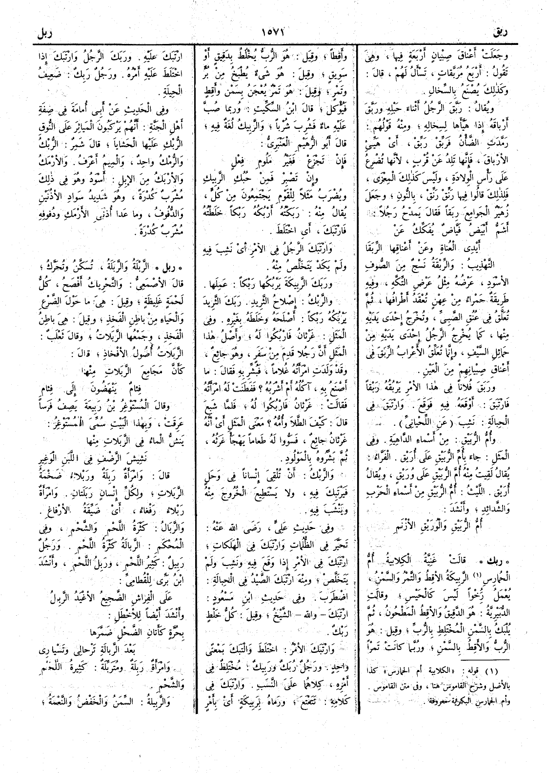 ( * قوله « الكلابية ام الحمارس » كذا بالأصل وشرح القاموس هنا وفي متن القاموس وأم الحمارس البكرية معروفة ) الربيكةُ الأَقط والتمر والسمن يعمل رخواً ليس كالحَيْس وقالت الدبيرية هو الدقيق والأقِطُ المطحون ثم يُلْبَكُ بالسمن المختلط بالرُّبّ وقيل هو الرُّبُّ والأَقِطُ بالسمن وربما كانت تمراً وأَقِطاً وقيل هو الرُّبُّ يخلط بدقيق أَو سويق وقيل هو شيء يطبخ من بُرٍّ وتمر وقيل هو تمر يعجن بسمن وأَقِطٍ فيؤكل قال ابن السكيت وربما صب عليه ماء فشُرِب شرباً والرَّبِيك لغة فيه قال أَبو الرهيم العنبري فإن تَجْزَعْ فغيرُ مَلُومِ فِعْلٍ وإن تَصْبِرْ فمن حُبُكِ الرَّبِيكِ ويضرب مثلاً للقوم يجتمعون من كلّ يقال منه رَبَكْتُه أَرْبُكه رَبْكاً خلطته فارْتَبَكَ أَي اختلط وارْتَبَك الرجلُ في الأمر أَي نشِب فيه ولم يَكَدْ يتخلص منه ورَبَك الرَّبِيكةَ يَرْبُكُها رَبْكاً عملها والرَّبْكُ إصلاح الثريد رَبَك الثريد يَرْبُكه رَبْكاً أَصلحه وخلطه بغيره وفي المثل غَرثانُ فارْبُكُوا له وأَصل هذا المثل أَن رجلاً قدم من سفر وهو جائع وقد ولدت امرأَته غلاماً فبُشِّرَ به فقال ما أَصنع به آكله أَم أَشربه ؟ فَفَطَنَتْ له امرأَته فقالت غَرْثانُ فارْبُكوا له فلما شَبع قال كيف الطَّلا وأُمُّه ؟ معنى المثل أَي أَنه غَرْثانُ جائع فسَوّوا له طعاماً يَهْجَأْ غَرثهُ ثم بَشَّروه بالمولود والرَّبْك أن تُلْقِيَ إنساناً في وحل فَيَرْتَبِكَ فيه ولا يستطيع الخروج منه وينشب فيه وفي حديث عليّ رضي الله عنه تحير في الظلمات وارْتَبكَ في الهلكات ارْتَبَكَ في الأَمر إذا وقع فيه ونشب ولم يتخلص ومنه ارْتَبَك الصيدُ في الحِبالة اضطرب وفي حديث ابن مسعود ارْتَبَكَ واللهِ الشيخ وقيل كل خلط رَبْكٌ وارْتَبَكَ الأمرُ اختلط والْتَبَكَ بمعنى واحد ورجل رُبَك ورَبِيك مختلط في أَمره كلاهما على النسب وارْتَبَك في كلامه تَتَعْتَعَ ورماه برَبِيكةٍ أَي بأَمر ارْتَبَك عليه ورَبَك الرجلُ وارْتَبَك إذا اختلط عليه أَمره ورجل رَبِكٌ ضعيف الحيلة وفي الحديث عن أَبي أُمامة في صفة أهل الجنة أَنهم يركبون الميَاثر على النوق الرُّمْك عليها الحَشايا قال شمر الرُّبْك والرُّمْك واحد والميم أعرف والأَرْمك والأَرْبك من الإبل أَسود وهو في ذلك مُشْرَبٌ كُدْرةً وهو شديد سواد الأُذنين والدُّفُوف وما عدا أُذني الأَرْمَكِ ودُفوفه مُشْرَبٌ كدرةً