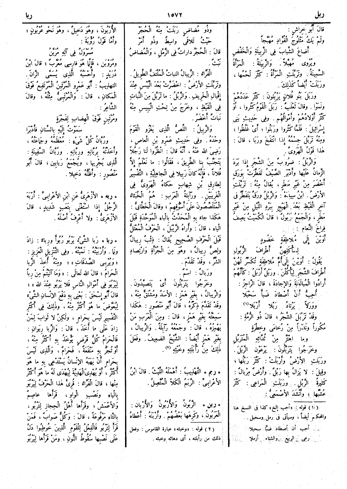 ( ربن ) الرَّبُونُ والأُربونُ والأُرْبانُ العَرَبُونُ وكرهها بعضهم وأَرْبَنه أَعطاه الأُرْبونَ وهو دخيل وهو نحو عُرْبون وأَما قول رؤبة مُسَرْوَل في آلِه مُرَبَّن ومُرَوْبَن فإِنما هو فارسي معرب قال ابن دريد وأَحسبه الذي يسمَّى الرَّانَ التهذيب أَبو عمرو المُرْتَبِنُ المرتفع فوق المكان قال والمُرْتَبِئُ مثله وقال الشاعر ومُرْتَبِنٍ فوقَ الهِضابِ لفَجْرةٍ سَمَوْتُ إليه بالسِّنانِ فأَدْبرَا ورُبّان كل شيء معظمه وجماعته وأَخذتُه برُبّانِه ورِبّانِه ورُبّانُ السفينة الذي يُجْرِيها ويجمع رَبابِين قال أَبو منصور وأَظنه دخيلاً ( ربه ) الأَزهري عن ابن الأَعرابي أَرْبَه الرجلُ إذا استغنى بتعب شديد قال الأَزهري ولا أَعرف أَصله ( ربا ) رَبا الشيءُ يَرْبُو رُبُوّاً ورِباءً زاد ونما وأَرْبَيْته نَمَّيته وفي التنزيل العزيز ويُرْبي الصدَقات ومنه أُخِذَ الرِّبا الحَرام قال الله تعالى وما آتَيْتُم من رباً ليَرْبُوَ في أَموالِ الناسِفلا يَرْبُو عند الله قال أَبو إِسحق يَعني به دَفْعَ الإِنسان الشيءَ ليُعَوَّضَ ما هو أَكثرُ منه وذلك في أَكثر التفسير ليس بِحَرامٍ ولكن لا ثواب لمن زاد على ما أَخذ قال والرِّبا رِبَوانِ فالحَرام كلُّ قَرْض يُؤْخَذُ به أَكثرُ منه أَو تُجَرُّ به مَنْفَعة فحرام والذي ليس بحرام أَن يَهَبَه الإِنسان يَسْتَدْعي به ما هو أَكْثَر أَو يُهْديَ الهَدِيَّة ليُهْدى له ما هو أَكثرُ منها قال الفراء قرئ هذا الحرف ليَرْبُوَ بالياء ونصب الواو قرأَها عاصم والأَعمش وقرأَها أَهل الحجاز لتَرْبُو بالتاء مرفوعة قال وكلٌّ صوابٌ فمن قرأَ لتربو فالفعل للقوم الذين خوطبوا دل على نصبها سقوط النون ومن قرأَها ليَرْبُوَ