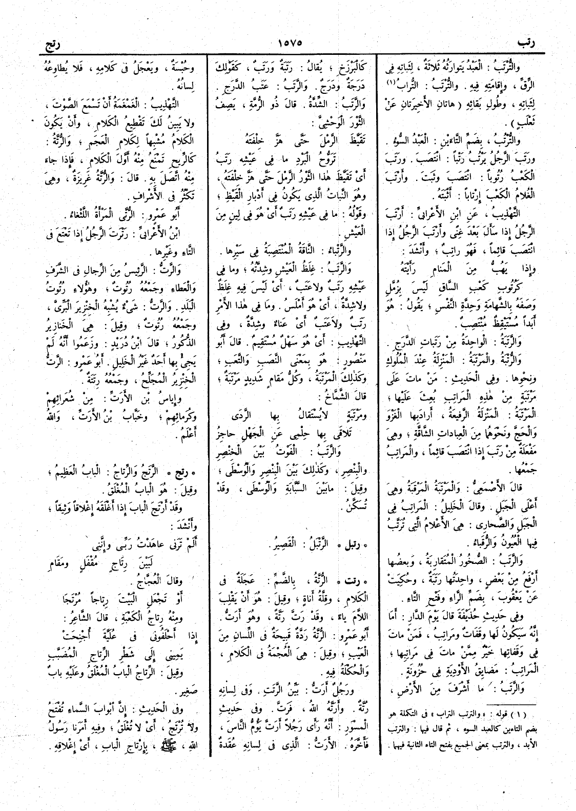 والتُّرْتَبُ العَبْدُ يَتوارَثُه ثلاثةٌ لثَباتِه في الرِّقِّ وإِقامَتِه فيه والتُّرْتَبُ التُّرابُ لثَباتِه وطُولِ بَقائه هاتانِ الأَخيرتان عن ثعلب والتُّرْتُبُ بضم التاءَين العبد السوء ورَتَبَ الرجلُ يَرْتُبُ رَتْباً انْتَصَبَ ورَتَبَ الكَعْبُ رُتُوباً انْتَصَبَ وثَبَتَ وأَرْتَبَ الغُلامُ الكَعْبَ إِرتاباً أَثْبَتَه التهذيب عن ابن الأَعرابي أَرْتَبَ الرجلُ إِذا سأَل بعدَ غِنًى وأَرْتَبَ الرجلُ إِذا انْتَصَبَ قائماً فهو راتِبٌ وأَنشد