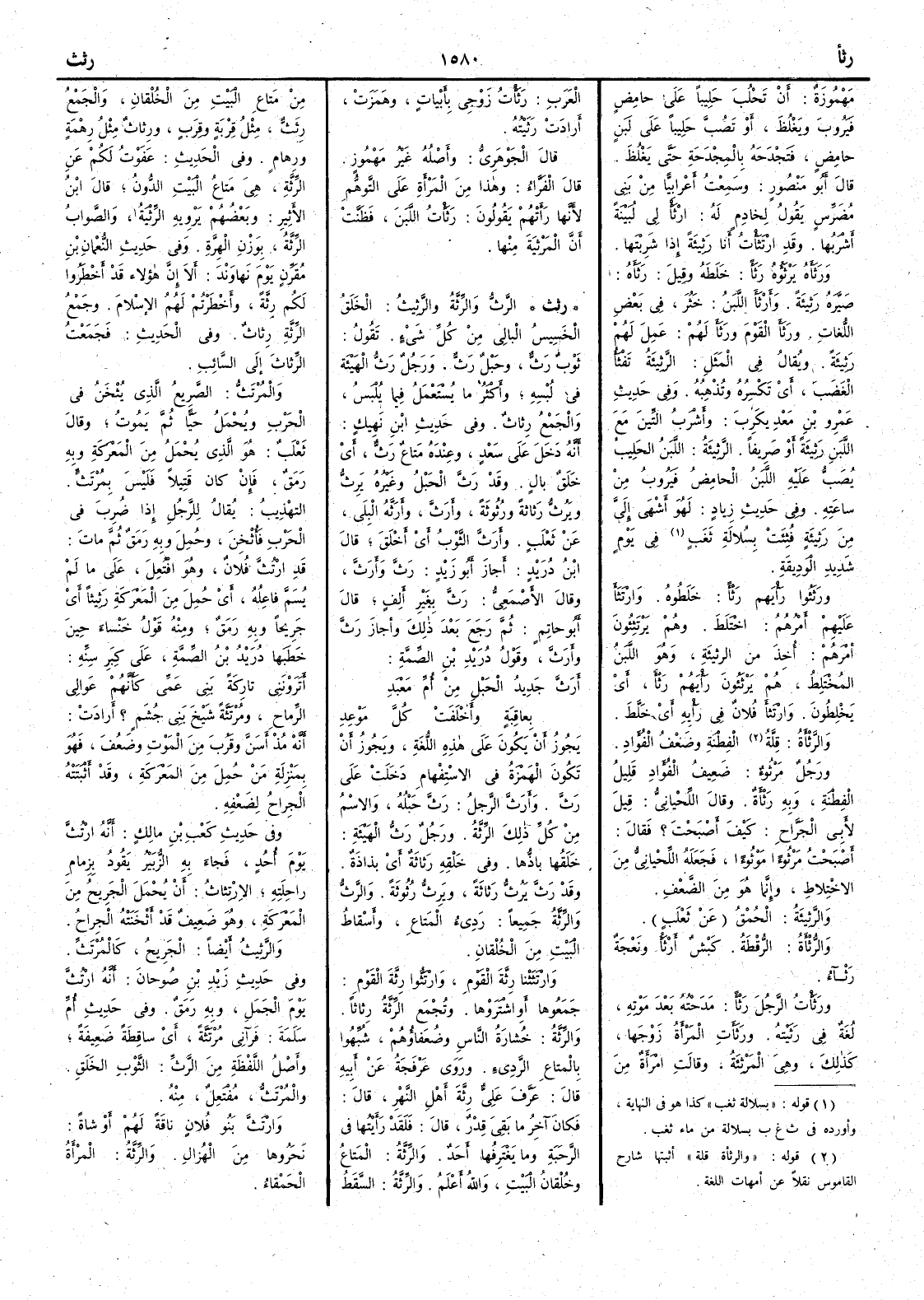 ( رثث ) الرَّثُّ والرِّثَّةُ والرَّثيثُ الخَلَق الخَسيسُ البالي من كل شيء تقول ثوبٌ رَثٌّ وحَبْلٌ رَثٌّ ورجل رَثُّ الهيئةِ في لُبْسه وأَكثر ما يُستعمل فيما يُلبس والجمع رِثاثٌ وفي حديث ابن نَهيكٍ أَنه دَخلَ على سَعْدٍ وعنده متاع رَثٌّ أَي خَلَقٌ بالٍ وقد رَثَّ الحبلُ وغيره يَرِثُّ ويَرُثُّ رثاثَة ورُثُوثة وأَرَثَّ وأَرثَّه البِلى عن ثعلب وأَرثَّ الثوبُ أَي أَخْلَق قال ابن دريد أَجاز أَبو زيد رَثَّ وأَرَثَّ وقال الأَصمعي رَثَّ بغير أَلف قال أَبو حاتم ثم رجع بعد ذلك وأَجاز رَثَّ وأَرَثَّ وقول دُرَيد بن الصِّمَّة أَرَثَّ جديدُ الحَبْلِ من أُمِّ مَعْبدِ بعاقبةٍ وأَخْلَفَتْ كلَّ مَوْعِدِ يجوز أَن يكون على هذه اللغة ويجوز أَن تكون الهمزة في الاستفهام دخلت على رَثَّ وأَرَثَّ الرجلُ رًثَّ حَبْلُه والاسم من كل ذلك الرِّثَّةُ ورجل رَثُّ الهَيئة خَلَقُها باذُّها وفي خَلْقه رَثاثةٌ أَي بَذاذَة وقد رَثَّ يَرُثُّ رَثاثةً ويرِثُّ رُثوثةً والرَّثُّ والرِّثَّةُ جميعاً رَديءُ المتاع وأَسْقاطُ البَيْت من الخُلْقانِ وارْتَثَثْنا رِثَّةَ القوم وارْتَثُّوا رِثَّةَ القوم جَمَعُوها أَو اشترَوها وتُجْمَع الرِّثَّةُ رِثاثاً والرِّثَّة خُشارة الناس وضُعَفاؤُهم شُبِّهُوا بالمتاع الرديء وروى عَرْفجةُ عن أَبيه قال عَرَّفَ عَلِيٌّ رِثَّةَ أَهلِ النَّهْر قال فكان آخِرُ ما بَقِيَ قِدْرٌ قال فلقد رأَيتُها في الرَّحَبة وما يَغْتَرفُها أَحدٌ والرِّثَّة المتاعُ وخُلْقانُ البيتِ والله أَعلم والرِّثَّة السَّقَطُ من متاع البيت من الخُلْقان والجمع رِثَثٌ مثل قِرْبةٍ وقِرَبٍ ورِثاثٌ مثلُ رِهْمةٍ ورِهام وفي الحديث عَفَوْتُ لكم عن الرِّثَّة هي متاعُ البيت الدُّونُ قال ابن الأَثير وبعضهم يرويه الرِّثْية والصوابُ الرِّثَّة بوزن الهِرَّة وفي حديث النُّعْمان بن مُقَرِّنٍ يومَ نَهاوَنْد أَلا إِن هؤٌلاء قد أَخْطَرُوا لم رِثَّة وأَخْطَرْتم لهم الإِسلامَ وجمعُ الرِّثَّة رِثاثٌ وفي الحديث فجَمَعْتُ الرِّثاثَ إِلى السائب والمُرْتَثُّ الصَّريعُ الذي يُثْخَنُ في الحَرْب ويُحْمَلُ حَيّاً ثم يموت وقال ثعلب هو الذي يُحْمَلُ من المَعْرَكة وبه رَمَق فإِن كان قتيلاً فليس بمُرْتَثٍّ التهذيب يقال للرجل إِذا ضُربَ في الحَرْبِ فأُثْخِنَ وحُمِلَ وبه رَمَق ثم ماتَ قد ارْتُثَّ فلانٌ وهو افْتُعِلَ على ما لم يُسَمَّ فاعله أَي حُمِلَ من المعركة رَثيثاً أَي جَريحاً وبه رَمَقٌ ومنه قولُ خَنْساءَ حين خَطَبَها دريدُ ابن الصِّمَّة على كِبَرِ سِنِّه أَتَرَوْنَني تاركةً بني عَمِّي كأَنهم عَوالي الرِّماحِ ومُرْتَثَّةً شيخَ بني جُشَمٍ ؟ أَرادت أَنه مذ أَسَنَّ وقَرُبَ من الموت وضَعُف فهو بمنزلة مَن حُمِلَ من المَعْركة وقد أَثْبَتَتْه الجراحُ لضَعْفِه وفي حديث كعب بن مالك أَنه ارْتُثَّ يومَ أُحُدٍ فجاءَ به الزبيرُ يَقُود بزِمام راحلته الارْتثاثُ أَن يُحْمَلَ الجريحُ من المَعْركة وهو ضعيف قد أَثْخَنَتْه الجِراح والرَّثِيث أَيضاً الجريح كالمُرْتَثِّ وفي حديث زيد بن صُوحانَ أَنه ارْتُثَّ يوم الجَمل وبه رَمَقٌ وفي حديث أُم سلمة فرآني مُرْتَثَّةً أَي ساقطةً ضعيفة وأَصلُ اللفظة من الرَّثِّ الثوب الخَلَق والمُرْتَثُّ مُفْتَعِل منه وارْتَثَّ بنو فلانٍ ناقةً لهم أَو شاةً نَحَروها من الهُزال والرِّثَّة المرأَة الحَمقاءُ