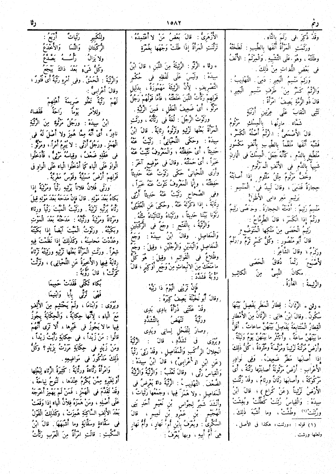 ( * قوله « ورثنت » هكذا في الأصل ولعلها ورشت ) وطُشَّتْ وما أَشبه ذلك الأَزهري قال بعض من لا أَعتمده تَرَثَّنَتِ المرأَةُ إذا طلت وجهها بغُمْرة ( رثا ) الرَّثْوُ الرَّثِيئة من اللَّبَن قال ابن سيده وليس على لفظه في حكم التصريف لأَن الرَّثِيئة مهموزة بدليل قولهم رَثَأْت اللبنَ خَلَطْته فأَمَّا قولهم رجلٌ مَرْثُوٌّ أَي ضعيفُ العَقْل فمن الرَّثِيَّة ورَثَوْت الرجل لغة في رثَأْتُه ورَثَتِ المرأَة بَعْلها تَرْثيه وتَرْثُوه رِثايةً قال ابن سيده وحكى اللحياني رثَيْت عنه حديثاً أَي حَفِظْته والمعروف نثَّيْت عنه خبراً أَي حَمَلْته وقال في موضع آخر وأُرى اللحياني حكى رَثَوْت عنه حديثاً حَفِظته وإِنما المعروف نَثَوْتُ عنه خَبَراً وفي الصحاح رَثَيْت عنه حديثاً أَرثي رِثايةً إِذا ذكَرْتَه عنه ورَثَيْت عنه حديثاً أَرْثي رِثايةً إِذا ذكَرْته عنه وحكي عن العُقَيلي رثَوْنا بيننا حديثاً ورَثَيْناه وتناثيناه مثله والرَّثْيَة بالفتح وجَعٌ في الرُّكْبَتَين والمفاصِل وقال ابن سيده وجعُ المفاصِل واليَدين والرجْلين وقيل وجعٌ وظُلاعٌ في القوائِمِ وقيل هو كُلُّ ما مَنَعك من الانْبعاث من وجَع أَو كِبَرٍ قال رؤبة فشَدَّد فإِن تَرَيْني اليَومَ ذا رثيَّهْ وقال أَبو نُخَيْلة يصف كِبَره وقد عَلَتْني ذُرْأَةٌ بادي بَدي ورَثْيَةٌ تَنْهَضُ بالتَّشَدُّدِ وصارَ للفَحْلِ لساني ويَدِي ويروى في تشددِ قال الرَّثْية انْحِلال الرُّكَب والمفاصِل وقد رَثِيَ رَثْياً عن ابن الأَعرابي قال ابن سيده والقياس رَثىً وقال ثعلب والرَّثْيَة والرَّثِيَّة الضَّعف التهذيب الرَّثْية داءٌ يعرَِض في المفاصِل ولا هَمْز فيها وجَمْعها رَثَياتٌ وأَنشد شمر لجوَّاس بن نُعَيْمٍ أَحد بني الهُجَيْم بن عمرو بن تَمِيم قال السكري ويُعْرَف بابن أُمِّ نَهارٍ وأُمُّ نهارٍ هي أُمُّ أَبيه وبها يُعرف وللكَبير رَثَيات أَرْبَعُ الرُّكَبتان والنَّسا والأَخْدَعُ ولا يزالُ رأْسُه يَصَّدَّعُ وكلُّ شيءٍ بعدَ ذاكَ يَيْجَعُ والرَّثْيَةُ الحُمْق وفي أَمْره رَثْية أَي فُتُور وقال أَعرابي لهم رَثْيَةٌ تَعْلو صريمة أَهْلِهمْ وللأَمْر يَوْماً راحةٌ فقَضاءُ ابن سيده ورجل مَرْثوءٌ من الرَّثْية نادرٌ أَي أَنه مما همز ولا أَصل له في الهَمْز ورجل أَرْثى لا يُبْرِمُ أَمْراً ومَرْثُوٌّ في عقْله ضَعْف وقياسه مَرْثِيٌّ فأَدخلوا الواو على الواو كما أَدخلوا الياء على الواو في قولهم أَرضٌ مَسْنِيَّة وقَوْسٌ مَغْريّة ورَثى فلان فلاناً يَرْثيهِ رَثْياً ومَرْثِيَةً إِذا بكاهُ بعد مَوته قال فإِن مدَحَه بعد موته قيل رثَّاهُ يُرَثِّيه تَرْثِيةً ورَثَيْت الميّتَ رَثْياً ورِثاءً ومَرْثاةً ومَرْثِيةً ورَثَّيْته مَدَحْته بعد الموت وبَكَيْته ورثَوْت الميّت أَيضاً إِذا بكَيْته وعدَّدت محاسنه وكذلك إِذا نظَمْت فيه شعراً ورَثَت المرأَةُ بعْلها تَرْثِيه ورَثِيَتْه تَرْثاهُ رِثايَةً فيهما الأَخيرة عن اللحياني وتَرَثَّت كرَثَّت قال رؤبة بكاءِ ثكْلى فَقَدتْ حَميما فهي تُرَثِّي بِأَبا وابْنِيما ويروى وابْناما ولم يَحْتَشِمْ من الأَلف مع الياء لأَنها حكاية والحكاية يجوز فيها ما لا يجوز في غيرها أَلا ترى أَنهم قالوا مَن زيداً في حكاية رأَيتُ زيْداً ومَن زيدٍ في حكاية مَرَرْتُ بزَيْدٍ ؟ وكلُّ ذلك مذْكورٌ في مواضعه وامرأَة رثَّاءَةٌ ورثَّاية كثيرة الرِّثاء لبَعْلِها أَو لغيره مِمَّن يُكْرمُ عندَها تَنُوحُ نِياحةً وقد تقدم في الهمز فمن لم يهمز أَخرجه على أَصله ومن همزه فلأَنَّ الياء إِذا وقعت بعد الأَلف الساكنة هُمِزَت وكذلك القول في سَقَّاءَةٍ وسَقَّايَةٍ وما أَشْبَهَها قال ابن السكيت قالت امرأَة من العرب رَثأْتُ