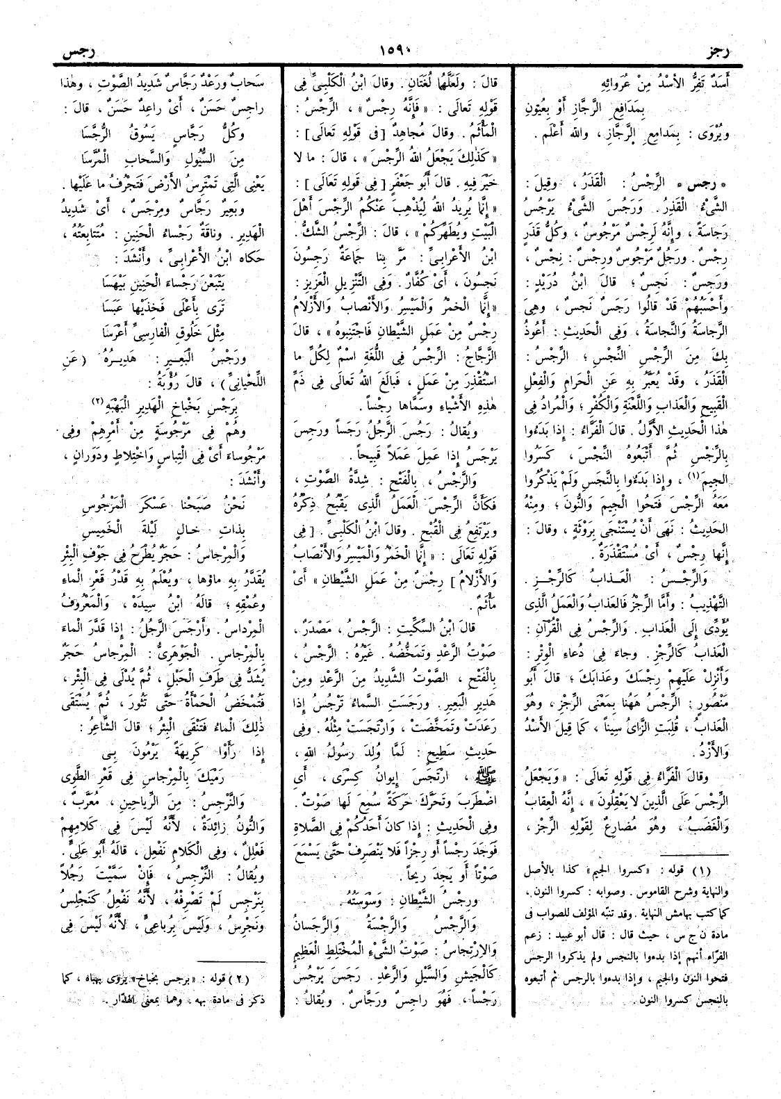 ( رجس ) الرِّجْسُ القَذَرُ وقيل الشيء القَذِرُ ورَجُسَ الشيءُ يَرْجُسُ رَجاسَةً وإِنه لَرِجْسٌ مَرْجُوس وكلُّ قَذَر رِجْسٌ ورجل مَرْجوسٌ ورِجْسٌ نِجْسٌ ورَجِسٌ نَجِسٌ قال ابن دريد وأَحسبهم قد نالوا رَجَسٌ نَجَسٌ وهي الرَّجاسَةُ والنَّجاسَة وفي الحديث أَعوذ بك من الرَّجْسِ النَجْسِ الرِّجْسُ القذر وقد يعبر به عن الحرام والفعل القبيح والعذاب واللعنة والكفر والمراد في هذا الحديث الأَول قال الفراء إِذا بدأُوا بالرَّجْسِ ثم أَتبعوه النِّجْسَ كسروا الجيم وإِذا بدأُوا بالنجس ولم يذكروا معه الرِّجْس فتحوا الجيم والنون ومنه الحديث نهى أَن يُسْتَنْجَى بِرَوْثَةٍ وقال إِنها رِجْسٌ أَي مُسْتَقْذَرَة والرِّجْس العذاب كالرِّجز التهذيب وأَما الرِّجْزُ فالعذاب والعمل الذي يؤدي إِلى العذاب والرِّجْسُ في القرآن العذاب كالرِّجْز وجاء في دعاء الوتر وأَنْزِلْ عليهم رِجْسَك وعذابك قال أَبو منصور الرجس ههنا بمعنى الرجز وهو العذاب قلبت الزاي سيناً كما قيل الأَسد والأَزد وقال الفراء في قوله تعالى ويَجْعَلُ الرِّجْسَ على الذين لا يعقلون إِنه العقاب والغضب وهو مضارع لقوله الرجز قال ولعلها لغتان وقال ابن الكلبي في قوله تعالى فإِنه رِجْسٌ الرجس المَأْتَمُ وقال مجاهد كذلك يجعل اللَّه الرجس قال ما لا خير فيه قال أَبو جعفر إِنما يريد اللَّه ليذهب عنكم الرِّجْسَ أَهلَ البيت ويُطَهِّرَكم قال الرجل الشك ابن الأَعرابي مرَّ بنا جماعى رَجِسُون نَجِسُون أَي كفار وفي التنزيل العزيز إِنما الخمر والميسر والأَنصابُ والأَزْلامُ رِجْسٌ من عمل الشيطان فاجتنبوه قال الزجاج الرِّجْسُ في اللغة اسم لكل ما استقذر من عمل فبالغ اللَّه تعالى في ذم هذه الأَشياء وسماها رِجْساً ويقال رَجُسَ الرجل رَجَساً ورَجِسَ يَرْجَسُ إِذا عَمِلَ عملاً قبيحاً والرَّجْسُ بالفتح شدة الصوت فكأَنَّ الرِّجْسَ العمل الذي يقبح ذكره ويرتفع في القبح وقال ابن الكلبي رِجْسٌ من عمل الشيطان أَي مَأْثَمٌ قال ابن السكيت الرَّجْسُ مصدر صوتُ الرَّعد وتَمَخُّضُه غيره الرَّجْسُ بالفتح الصوت الشديد من الرعد ومن هدير البعير ورجَسَت السماء تَرْجُسُ إِذا رَعَدَتْ وتَمَخَّضَتْ وارتجَسَتْ مثله وفي حديث سَطِيح لما وُلِدَ رسول اللَّه صلى اللَّه عليه وسلم ارْتَجَسَ إِيوان كِسْرَى أَي اضطرب وتحرك حركة سمع لها صوت وفي الحديث إِذا كان أَحدكم في الصلاة فوجد رِجْساً أَو رِجْزاً فلا ينصرف حتى يسمع صوتاً أَو يَجِدَ ريحاً ورِجْسُ الشيطان وَسْوَسَتُه والرَّجْسُ والرَّجْسَةُ والرَّجَسانُ والارْتِجاسُ صوت الشيء المختلط العظيم كالجيش والسيل والرعد رَجَسَ يَرْجُسُ رَجْساً فهو راجِسٌ ورَجَّاسٌ ويقال سحاب ورعد رَجَّاسٌ شديد الصوت وهذا راجِسٌ حَسَن أَي راعِدٌ حسن قال وكلُّ رَجَّاسٍ يَسُوقُ الرُجَّسا من السُيولِ والسَّحاب المُرَّسا يعني التي تَمْتَرِسُ الأَرض فَتَجْرُف ما عليها وبعير رَجَّاس ومِرْجسٌ أَي شديد الهَدير وناقة رَجْساء الحَنِين متتابعته حكاه ابن الأَعرابي وأَنشد يَتْبَعْنَ رَجْساءَ الحَنِين بَيْهَسا تَرى بأَعْلى فَخِذَيْها عَبَسا مثلَ خَلُوقِ الفارِسِيِّ أَعْرَسا ورَجْسُ البعير هَديرُه عن اللحياني قال رؤبة بِرَجْسِ بَخْباخِ الهَديرِ البَهْبَهِ وهم في مَرْجُوسَة من أَمرهم وفي مَرْجُوساء أَي في التباس واختلاط ودَوَرانٍ وأَنشد نحن صَبَحْنا عَسْكَرَ المَرْجُوسِ بذاتِ خالٍ ليلةً الخَمِيسِ والمِرْجاسُ حجر يطرح في جوف البئر يُقَدَّر به ماؤها ويعلم به قَدْرُ قعر الماء وعُمْقه قاله ابن سيده والمعروف المِرْداسُ وأَرْجَسَ الرجلُ إِذا قدََّّر الماء بالمِرْجاس الجوهري المِرْجاسُ حجر يُشَدُّ في طرف الحبل ثم يُدْلى في البئر فتُمْخَض الحَمْأَة حتى تَثُور ثم يُسْتقى ذلك الماء فتنقى البئر قال الشاعر إِذا رَأَوْا كَريهةً يَرْمُونَ بي رَمْيَكَ بالمِرْجاسِ في قَعْرِ الطَّوي والنَّرْجِسُ من الرياحين معرّب والنون زائ