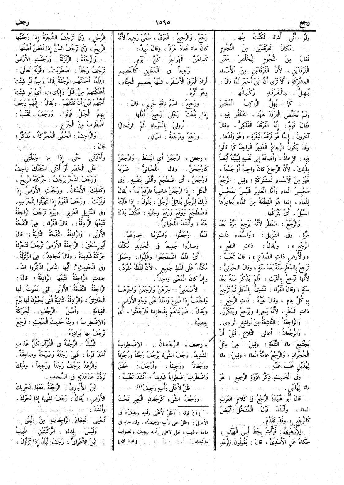 ولو أَنّي أَشاء لكُنْتُ منها مَكانَ الفَرْقَدَيْن من النُّجومِ فقال من النجوم ليُخَلِّص معنى الفَرقدين لأَن الفرقدين من الأَسماء المشتركة أَلا ترى أَنَّ ابن أَحمر لما قال يُهِلُّ بالفَرقدِ رُكْبانُها كما يُهِلُّ الرَّاكِبُ المُعْتَمِرْ ولم يُخَلِّص الفَرْقَد ههنا اختلفوا فيه فقال قوم إِنه الفَرْقَد الفَلَكي وقال آخرون إِنما هو فرقد البقرة وهو ولدها وقد يكون الرِّجاعُ الغَدير الواحد كما قالوا فيه الإِخاذ وأَضافه إِلى نفسه ليُبَيِّنه أَيضاً بذلك لأَن الرِّجاع كان واحداً أَو جمعاً فهو من الأَسماء المشتركة وقيل الرَّجْع مَحْبِس الماء وأَما الغدير فليس بمحبس للماء إِنما هو القِطعة من الماء يُغادِرها السَّيْلُ أَي يتركها والرَّجْع المطر لأَنه يرجع مرة بعد مرة وفي التنزيل والسماء ذاتِ الرَّجْع ويقال ذات النفْع والأَرض ذات الصَّدْع قال ثعلب تَرْجع بالمطر سنة بعد سنة وقال اللحياني لأَنها ترجع بالغيث فلم يذكر سنة بعد سنة وقال الفراء تبتدئ بالمطر ثم ترجع به كل عام وقال غيره ذاتِ الرجع ذات المطر لأَنه يجيء ويرجع ويتكرّر والراجِعةُ الناشِغةُ من نَواشِغ الوادي والرُّجْعان أَعالي التِّلاع قبل أَن يجتمع ماء التَّلْعة وقيل هي مثل الحُجْرانِ والرَّجْع عامة الماء وقيل ماء لهذيل غلب عليه وفي الحديث ذكر غَزوة الرَّجيعِ هو ماء لهُذَيْل قال أَبو عبيدة الرَّجْع في كلام العرب الماء وأَنشد قول المُتَنَخِّل أَبيض كالرَّجْع وقد تقدم الأَزهري قرأْت بخط أَبي الهيثم حكاه عن الأَسدي قال يقولون للرعد رَجْع والرَّجِيعُ العَرَق سمي رَجيعاً لأَنه كان ماء فعاد عرَقاً وقال لبيد كَساهُنَّ الهَواجِرُ كلَّ يَوْمٍ رَجِيعاً في المَغَابنِ كالعَصِيمِ أَراد العَرَقَ الأَصفر شبَّهه بعصيم الحِنَّاء وهو أَثره ورَجِيعُ اسم ناقة جرير قال إِذا بلَّغتْ رَحْلي رَجِيعُ أَمَلَّها نُزُوليَ بالمَوْماةِ ثم ارْتحاليا ورَجْعٌ ومَرْجَعةُ اسمان