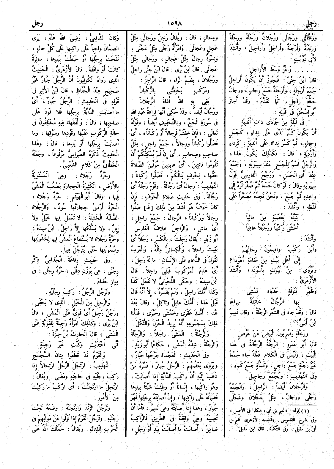 ورَجْلة يضربون البَيْضَ عن عُرُض قال أَبو عمرو الرَّجْلة الرَّجَّالة في هذا البيت وليس في الكلام فَعْلة جاء جمعاً غير رَجْلة جمع راجل وكَمْأَة جمع كَمْءٍ وفي التهذيب ويجمع رَجاجِيلَ والرَّجْلان أَيْضاً الراجل والجمع رَجْلى ورِجال مثل عَجْلان وعَجْلى وعِجال قال ويقال رَجِلٌ ورَجالى مثل عَجِل وعَجالى وامرأَة رَجْلى مثل عَجْلى ونسوة رِجالٌ مثل عِجال ورَجالى مثل عجالى قال ابن بري قال ابن جني راجل ورُجْلان بضم الراء قال الراجز ومَرْكَبٍ يَخْلِطني بالرُّكْبان يَقي به اللهُ أَذاةَ الرُّجْلان ورُجَّال أَيضاً وقد حكي أَنها قراءة عبد الله في سورة الحج وبالتخفيف أَيضاً وقوله تعالى فإِن خِفْتم فرِجالاً أَو رُكْباناً أَي فَصَلُّوا رُكْباناً ورِجالاً جمع راجل مثل صاحب وصِحاب أَي إِن لم يمكنكم أَن تقوموا قانتين أَي عابدين مُوَفِّين الصَّلاةَ حَقَّها لخوف ينالكم فَصَلُّوا رُكْباناً التهذيب رِجالٌ أَي رَجَّالة وقوم رَجْلة أَي رَجَّالة وفي حديث صلاة الخوف فإِن كان خوف هو أَشدّ من ذلك صَلوا رِجالاً ورُكْباناً الرِّجال جمع راجل أَي ماش والراجل خلاف الفارس أَبو زيد يقال رَجِلْت بالكسر رَجَلاً أَي بقيت راجِلاً والكسائي مثله والعرب تقول في الدعاء على الإِنسان ما له رَجِلَ أَي عَدِمَ المركوبَ فبقي راجلاً قال ابن سيده وحكى اللحياني لا تفعل كذا وكذا أُمُّك راجل ولم يفسره إِلا أَنه قال قبل هذا أُمُّك هابل وثاكل وقال بعد هذا أُمُّك عَقْري وخَمْشى وحَيْرى فَدَلَّنا ذلك بمجموعة أَنه يريد الحزن والثُّكْل والرُّجْلة المشي راجلاً والرَّجْلة والرِّجْلة شِدَّة المشي خكاهما أَبو زيد وفي الحديث العَجْماء جَرْحها جُبَار ويَرْوي بعضم الرِّجْلُ جُبارٌ فسَّره من ذهب إِليه أَن راكب الدابة إِذا أَصابت وهو راكبها إِنساناً أَو وطئت شيئاً بيدها فضمانه على راكبها وإِن أَصابته برِجْلها فهو جُبار وهذا إِذا أَصابته وهي تسير فأَمَّا أَن تصيبه وهي واقفة في الطريق فالراكب ضامن أَصابت ما أَصابت بيد أَو رجل وكان الشافعي رضي الله عنه يرى الضمان واجباً على راكبها على كل حال نَفَحَتْ برِجلها أَو خبطت بيدها سائرة كانت أَو واقفة قال الأَزهري الحدث الذي رواه الكوفيون أَن الرِّجل جُبار غير صحيح عند الحفاظ قال ابن الأَثير في قوله في الحديث الرِّجل جُبار أَي ما أَصابت الدابة برِجْلها فلا قَوَد على صاحبها قال والفقهاء فيه مختلفون في حالة الركوب عليها وقَوْدها وسَوْقها وما أَصابت برِجْلها أَو يدها قال وهذا الحديث ذكره الطبراني مرفوعاً وجعله الخطابي من كلام الشعبي وحَرَّةٌ رَجْلاءُ وهي المستوية بالأَرض الكثيرة الحجارة يَصْعُب المشي فيها وقال أَبو الهيثم حَرَّة رَجْلاء الحَرَّة أَرض حجارتها سُودٌ والرَّجْلاء الصُّلْبة الخَشِنة لا تعمل فيها خيل ولا إِبل ولا يسلكها إِلا راجل ابن سيده وحَرَّة رَجْلاء لا يستطاع المشي فيها لخشونتها وصعوبتها حتى يُتَرَجَّل فيها وفي حديث رِفاعة الجُذامي ذِكْر رِجْلى هي بوزن دِفْلى حَرَّةُ رِجْلى في ديار جُذام وتَرَجَّل الرجلُ ركب رِجْليه والرَّجِيل من الخيل الذي لا يَحْفى ورَجُلٌ رَجِيل أي قَوِيٌّ على المشي قال ابن بري كذلك امرأَة رَجِيلة للقوية على المشي قال الحرب بن حِلِّزة أَنَّى اهتديتِ وكُنْتِ غير رَجِيلةٍ والقومُ قد قَطَعوا مِتان السِّجْسَج التهذيب ارْتَجَل الرجلُ ارتجالاً إِذا ركب رجليه في حاجته ومَضى ويقال ارْتَجِلْ ما ارْتَجَلْتَ أَي اركب ما ركبت من الأُمور وتَرَجَّل الزَّنْدَ وارتجله وضعه تحت رجليه وتَرَجَّل القومُ إِذا نزلوا عن دوابهم في الحرب للقتال ويقال حَمَلك الله على