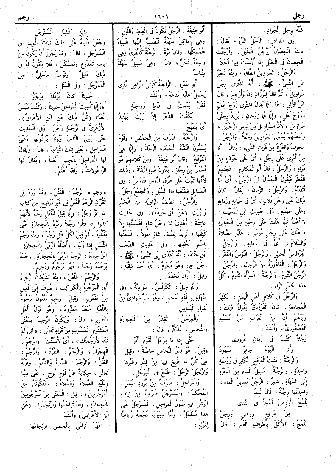 شُبّه برِجْل الجَراد وفي النوادر الرَّجْل النَّزْوُ يقال بات الحِصَان يَرْجُل الخيلَ وأَرْجَلْت الحِصانَ في الخيل إِذا أَرسلت فيها فحلاً والرِّجْل السراويلُ الطاقُ ومنه الخبر عن النبي صلى الله عليه وسلم أَنه اشترى رِجْلَ سَراوِيل ثم قال للوَزَّان زِنْ وأَرْجِحْ قال ابن الأَثير هذا كما يقال اشترى زَوْجَ خُفٍّ وزوْجَ نَعْل وإِنما هما زَوْجان يريد رِجْلَيْ سراويل لأَن السراويل من لباس الرِّجْلين وبعضهم يُسَمِّي السراويل رِجْلاً والرِّجْل الخوف والفزع من فوت الشيء يقال أَنا من أَمري على رِجْلٍ أَي على خوف من فوته والرِّجْل قال أَبو المكارم تجتمع القُطُر فيقول الجَمَّال لي الرِّجْل أَي أَنا أَتقدم والرِّجْل الزمان يقال كان ذلك على رِجْل فلان أَي في حياته وزمانه وعلى عهده وفي حديث ابن المسيب لا أَعلم نَبِيًّا هَلَكَ على رِجْله من الجبابرة ما هَلَك على رِجْل موسى عليه الصلاة والسلام أَي في زمانه والرِّجْل القِرْطاس الخالي والرِّجْل البُؤْس والفقر والرِّجْل القاذورة من الرجال والرِّجْل الرَّجُل النَّؤوم والرِّجْلة المرأَة النؤوم كل هذا بكسر الراء والرَّجُل في كلام أَهل اليمن الكثيرُ المجامعة كان الفرزدق يقول ذلك ويزعم أَن من العرب من يسميه العُصْفُورِيَّ وأَنشد رَجُلاً كنتُ في زمان غُروري وأَنا اليومَ جافرٌ مَلْهودُ والرِّجْلة مَنْبِت العَرْفج الكثير في روضة واحدة والرِّجْلة مَسِيل الماء من الحَرَّة إِلى السَّهلة شمر الرِّجَل مَسايِلُ الماء واحدتها رِجْلة قال لبيد يَلْمُج البارضَ لَمْجاً في النَّدَى من مَرابيع رِياضٍ ورِجَل اللَّمْج الأَكل بأَطراف الفم قال أَبو حنيفة الرِّجَل تكون في الغِلَظ واللِّين وهي أَماكن سهلة تَنْصَبُّ إِليها المياه فتُمْسكها وقال مرة الرِّجْلة كالقَرِيِّ وهي واسعة تُحَلُّ قال وهي مَسِيل سَهْلة مِنْبات أَبو عمرو الراجلة كَبْش الراعي الذي يَحْمِل عليه متاعَه وأَنشد فظَلَّ يَعْمِتُ في قَوْطٍ وراجِلةٍ يُكَفِّتُ الدَّهْرَ إِلاَّ رَيْثَ يَهْتَبِد أَي يَطْبُخ والرِّجْلة ضرب من الحَمْض وقوم يسمون البَقْلة الحَمْقاء الرِّجْلة وإِنما هي الفَرْفَخُ وقال أَبو حنيفة ومن كلامهم هو أَحمق من رِجْلة يَعْنون هذه البَقْلة وذلك لأَنها تنبت على طُرُق الناس فتُدَاس وفي المَسايل فيَقْلَعها ماء السيل والجمع رِجَل والرِّجْل نصف الراوية من الخَمْر والزيت عن أَبي حنيفة وفي حديث عائشة أُهدي لنا رِجْل شاة فقسمتها إِلاّ كَتِفَها تريد نصف شاة طُولاً فسَمَّتْها باسم بعضها وفي حديث الصعب بن جَثَّامة أَنه أَهدى إِلى النبي صلى الله عليه وسلم رِجْل حمار وهو مُحْرِمٌ أَي أَحد شقيه وقيل أَراد فَخِذه والتَّراجِيل الكَرَفْس سواديّة وفي التهذيب بِلُغَة العجم وهو اسم سَواديٌّ من بُقول البساتين والمِرْجَل القِدْر من الحجارة والنحاسِ مُذَكَّر قال حتى إِذا ما مِرْجَلُ القومِ أَفَر وقيل هو قِدْر النحاس خاصة وقيل هي كل ما طبخ فيها من قِدْر وغيرها وارْتَجَل الرجلُ طبخ في المِرْجَل والمَراجِل ضرب من برود اليمن المحكم والمُمَرْجَل ضرب من ثياب الوشي فيه صور المَراجل فمُمَرْجَل على هذا مُمَفْعَل وأَما سيبويه فجعله رباعيّاً لقوله بشِيَةٍ كشِيَةِ المُمَرْجَل وجعل دليله على ذلك ثبات الميم في المُمَرْجَل قال وقد يجوز أَن يكون من باب تَمَدْرَع وتَمَسْكَن فلا يكون له في ذلك دليل وثوب مِرْجَلِيٌّ من المُمَرْجَل وفي المثل حَدِيثاً كان بُرْدُك مِرْجَلِيّا أَي إِنما كُسيت المَراجِلَ حديثاً وكنت تلبس العَبَاء كل ذلك عن ابن الأَعرابي الأَزهري في ترجمة رحل وفي الحديث حتى يَبْنَي الناسُ بيوتاً يُوَشُّونها وَشْيَ المراحِل ويعني تلك الثياب قال ويقال لها المراجل بالجيم أَيضاً ويقال لها الراحُولات والله أعلم