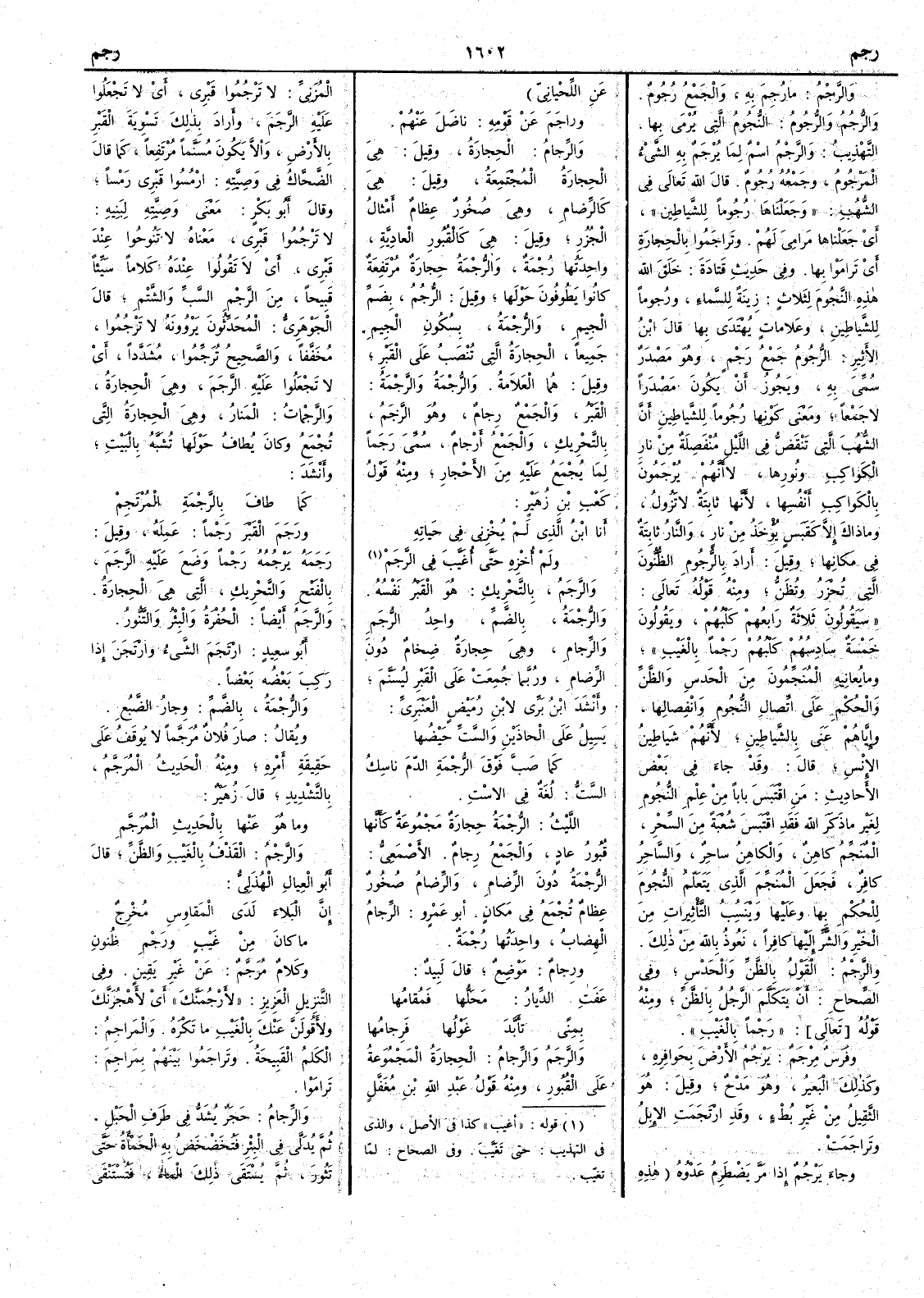 والرَّجْمُ ما رُجِمَ به والجمع رُجومٌ والرُّجُمُ والرُّجُوم النجوم التي يرمى بها التهذيب والرَّجْمُ اسم لما يُرْجَمُ به الشيء المَرْجوم وجمعه رُجومُ قال الله تعالى في الشُّهُب وجعلناها رُجوماً للشياطين أَي جعلناها مَرامي لهم وتَراجَمُوا بالحجارة أَي تَرامَوْا بها وفي حديث قتادة خلق الله هذه النجوم لثلاثٍ زينةً للسماء ورُجوماً للشياطين وعَلاماتٍ يُهْتَدى بها قال ابن الأَثير الرُّجُومُ جمع رَجْمٍ وهو مصدر سمي به ويجوز أَن يكون مصدراً لا جمعاً ومعنى كونها رُجُوماً للشياطين أَن الشُّهُبَ التي تَنْقَضُّ في الليل منفصلةٌ من نار الكواكب ونورِها لا أَنهم يُرْجَمُونَ بالكواكب أَنفسها لأَنها ثابتة لا تزول وما ذاك إِلا كَقَبسٍ يُؤْخَذُ من نار والنار ثابتة في مكانها وقيل أَراد بالرُّجوم الظُّنون التي تُحْزَرُ وتُظَنُّ ومنه قوله تعالى سَيقُولونَ ثَلاثةٌ رابعهم كَلْبُهُمْ ويقولون خَمْسَةٌ سادِسُهم كَلْبُهُمْ رَجْماً بالغيب وما يعانيه المُنَجِّمُونَ من الحَدْسِ والظن والحُكْمِ على اتصال النجوم وانفصالها وإِياهم عنى بالشياطين لأَنهم شياطين الإِنْس قال وقد جاء في بعد الأَحاديث من اقْتَبَسَ باباً من علم النجوم لغير ما ذكر الله فقد اقتبس شُعْبَةً من السحر المُنَجِّمُ كاهِنٌ والكاهن ساحر والساحر كافر فجعل المُنَجِّمَ الذي يتعلم النجوم للحكم بها وعليها وينسب التأْثيرات من الخير والشر إِليها كافراً نعوذ بالله من ذلك والرَّجْمُ القول بالظن والحَدْسِ وفي الصحاح أَن يتكلم الرجل بالظن ومنه قوله رجْماً بالغيب وفرس مِرْجَمٌ يَرْجُمُ الأَرض بحَوافره وكذلك البعير وهو مَدْحٌ وقيل هو الثقيل من غير بُطْء وقد ارْتَجَمَتِ الإِبل وتَراجَمَتْ وجاء يَرْجُمُ إِذا مَرَّ يَضْطَرِمُ عَدْوُهُ هذه عن اللحياني وراجَمَ عن قومه ناضَلَعنهم والرِّجامُ الحجارة وقيل هي الحجارة المجتمعة وقيل هي كالرِّضام وهي صخور عظام أَمثال الجُزُرِ وقيل هي كالقُبور العادِيَّةِ واحدتها رُجْمةٌ والرُّجْمةُ حجارة مرتفعة كانوا يطوفون حولها وقيل الرُّجُمُ بضم الجيم والرُّجْمَةُ بسكون الجيم جميعاً الحجارة التي تُنْصَبُ على القبر وقيل هما العلامةُ والرُّجْمة والرَّجْمة القبر والجمع رِجامٌ وهو الرَّجَمُ بالتحريك والجمع أَرْجامٌ سمي رَجَماً لما يجمع عليه من الأَحجار ومنه قول كَعْب ابن زُهَيْرٍ أَنا ابنُ الذي لم يُخْزِني في حَياتِه ولم أُخْزِه حتى أُغَيَّبَ في الرَّجَمْ