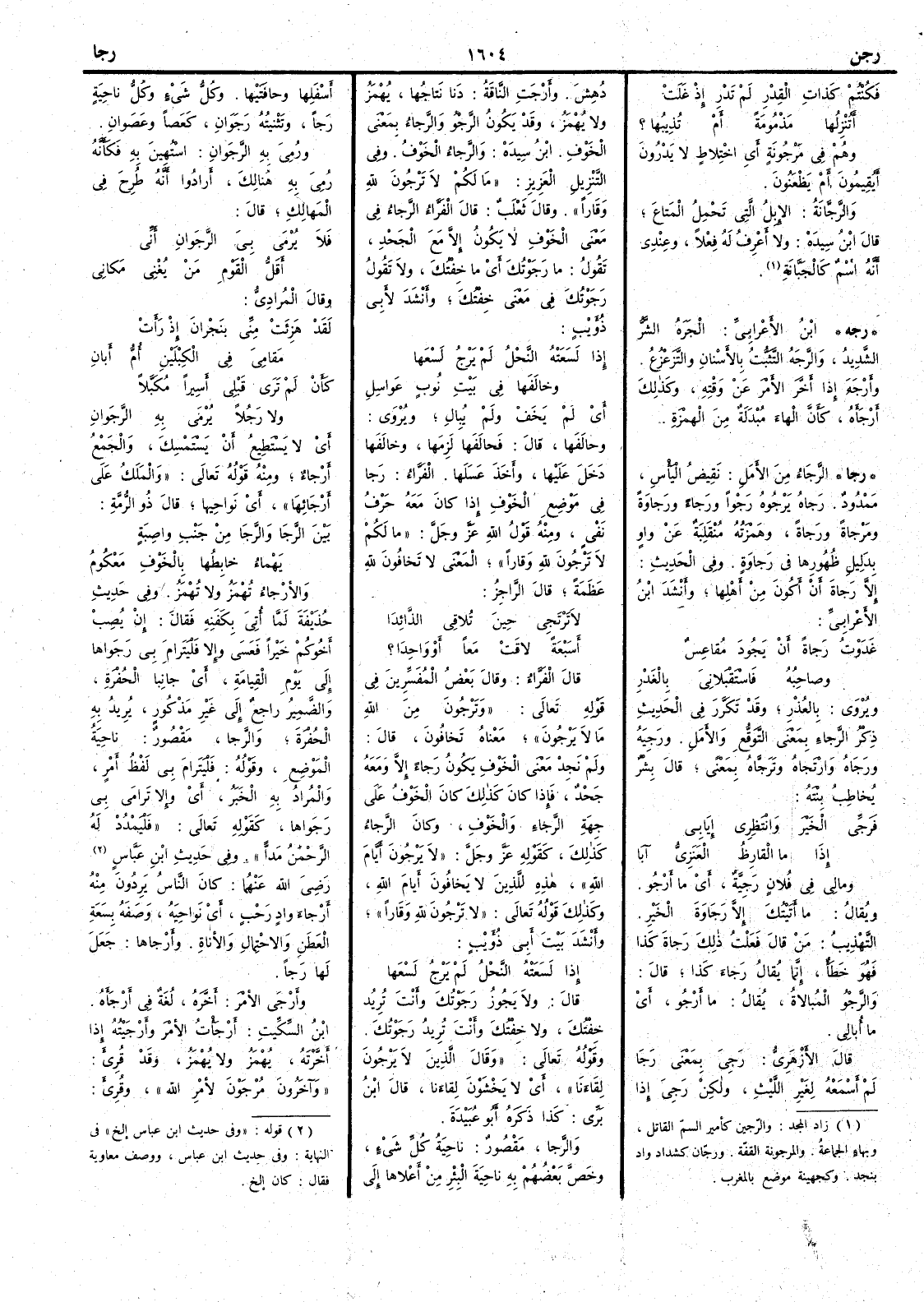 ( رجه ) ابن الأَعرابي الجَرَهُ الشَّرُّ الشديد والرَّجَهُ التثبت بالأَسْنان والتزعزعُ وأَرْجَهَ إذا أَخَّرَ الأَمر عن وقته وكذلك أَرْجَأَهُ كأَنَّ الهاء مبدلة من الهمزة ( رجا ) الرَّجَاءُ من الأَمَلِ نَقِيضُ اليَأْسِ مَمْدودٌ رَجاهُ يَرْجوهُ رَجْواً ورَجاءً ورَجاوَةً ومَرْجاةً ورَجاةً وهمزَتُه منقلبة عن واو بدليل ظُهورِها في رَجاوةٍ وفي الحديث إِلاَّ رَجاةَ أَن أَكُونَ من أَهْلِها وأَنشد ابن الأَعرابي غَدَوْتُ رَجاةً أَن يَجودَ مُقاعِسٌ وصاحِبُه فاسْتَقْبَلانِيَ بالغَدْرِ ويروى بالعُذْرِ وقد تكرر في الحديث ذكر الرجاء بمعىن التَّوَقُّعِ والأَمَل ورَجِيَهُ ورَجَاهُ وارْتَجاه وتَرَجَّاه بمَعْنىً قال بِشْرٌ يخاطب بنته فرَجِّي الخَيْرَ وانْتَظِرِي إِيَابِي إِذا ما الْقارِظُ العَنَزِيُّ آبَا وما لي في فلان رَجِيَّةٌ أَي ما أَرْجُو ويقال ما أَتَيْتُكَ إِلا رَجَاوَةَ الخَيْرِ التهذيب من قال فَعَلْت ذلك رَجاةَ كذا هو خَطأٌ إِنما يقال رَجاءَ كذا قال والرَّجْوُ المُبالاة يقال ما أَرْجُو أَي ما أُبالِي قال الأَزهري رَجِيَ بمعنى رَجَا لم أَسْمَعْه لغير الليث ولكن رَجِيَ إِذا دُهِشَ وأَرْجَتِ الناقةُ دَنا نَتاجُها يُهْمز ولا يهمز وقد يكون الرَّجْوُ والرَّجاءُ بمعنى الخَوْف ابن سيده والرَّجاءُ الخَوْف وفي التنزيل العزيز ما لَكُم لا تَرْجُونَ لله وَقاراً وقال ثعلب قال الفراء الرَّجاءُ في معنى الخَوْفِ لا يكون إِلا مع الجَحْدِ تقول ما رَجَوْتُكَ أَي ما خِفْتُك ولا تقول رَجَوْتُك في معنى خِفْتُك وأَنشد لأَبي ذؤيب إِذا لَسَعَتْه النَّحْلُ لم يَرْجُ لَسْعَها وخالَفَها في بَيْتِ نُوبٍ عَواسِلِ أَي لم يَخَفْ ولم يُبالِ ويروى وحالَفَها قال فحالفها لزمها وخالفها دخل عليها وأَخذَ عَسَلَها الفراء رَجا في موضِعِ الخَوْفِ إِذا كان معه حرفُ نَفْيٍ ومنه قول الله عز وجل ما لكم لا تَرْجُون لله وَقاراً المعنى لا تَخافون للهِ عَظَمة قال الراجز لا تَرْتَجِي حِينَ تُلاقِي الذَّائِدَا أَسَبْعَةً لاقَتْ معاً أَو واحِدَا ؟ قال الفراء وقال بعض المفسرين في قوله تعالى وتَرْجُون من الله ما لا يَرْجُون معناه تخافون قال ولم نَجِدْ معنى الخَوْفِ يكون رَجاءً إِلاَّ ومعه جَحْدٌ فإِذا كان كذلك كان الخوفُ على جهة الرَّجاء والخوفِ وكان الرَّجاء كذلك كقوله عز وجل لا يَرْجُونَ أَيَّامَ اللهِ هذه للذين لا يَخافون أَيامَ الله وكذلك قوله تعالى لا تَرْجُونَ لله وَقَاراً وأَنشد بيت أَبي ذؤيب إِذا لَسَعَتْه النحلُ لم يَرْجُ لَسْعَها قال ولا يجوز رَجَوْتُك وأَنتَ تُريد خِفْتُك ولا خِفْتُك وأَنت تريد رَجَوْتك وقوله تعالى وقال الذينَ لا يَرْجونَ لِقاءنا أَي لا يَخْشَوْنَ لقاءنا قال ابن بري كذا ذكره أَبو عبيدة والرَّجا مقصور ناحيةُ كلِّ شيءٍ وخص بعضهم به ناحية البئر من أَعلاها إِلى أَسفلِها وحافَتَيْها وكلُّ شيء وكلُّ ناحيةٍ رَجاً وتثنيته رَجَوَان كعَصاً وعَصَوانِ ورُمِيَ به الرَّجَوانِ اسْتُهِينَ به فكأَنه رُمِيَ به هنالك أَرادوا أَنه طُرِحَ في المَهالِكِ قال فلا يُرْمَى بِيَ الرَّجَوانِ أَنِّي أَقَلُّ القَوْمِ مَنْ يُغْنِي مَكانِي وقال المرادي لقد هَزِئَتْ مِنِّي بنَجْرانَ إِذْ رَأَتْ مَقامِيَ في الكِبْلَيْنِ أُمُّ أَبانِ كأَنْ لَمْ تَرَى قَبْلِي اسِيراً مُكَبَّلاً ولا رَجُلاً يُرْمَى به الرَّجَوانِ أَي لا يَسْتطِيع أَن يَسْتَمْسِك والجمع أَرْجاءٌ ومنه قوله تعالى والمَلَكُ على أَرْجائِها أَي نواحيها قال ذو الرمة بَيْنَ الرَّجَا والرَّجَا من جَنْبِ واصِبةٍ يَهْماء خابِطُها بالخَوْفِ مَعْكُومُ والأرْجاءُ تُهْمَز ولا تهمز وفي حديث حذيفة لَمَّا أُتِيَ بكَفَنِه فقال إنْ يُصِبْ أَخُوكُم خيراً فعَسَى وإلاّ فَلْيَتَرامَ بِي رَجَواها إلى يومِ القيامة أَي جانِبا الحُفْرة والضمير راجع إلى غير مذكور يريد به الحُفْرة والرَّجا مقصور ناحية الموضع وقوله فَلْيَتَرامَ بِي 