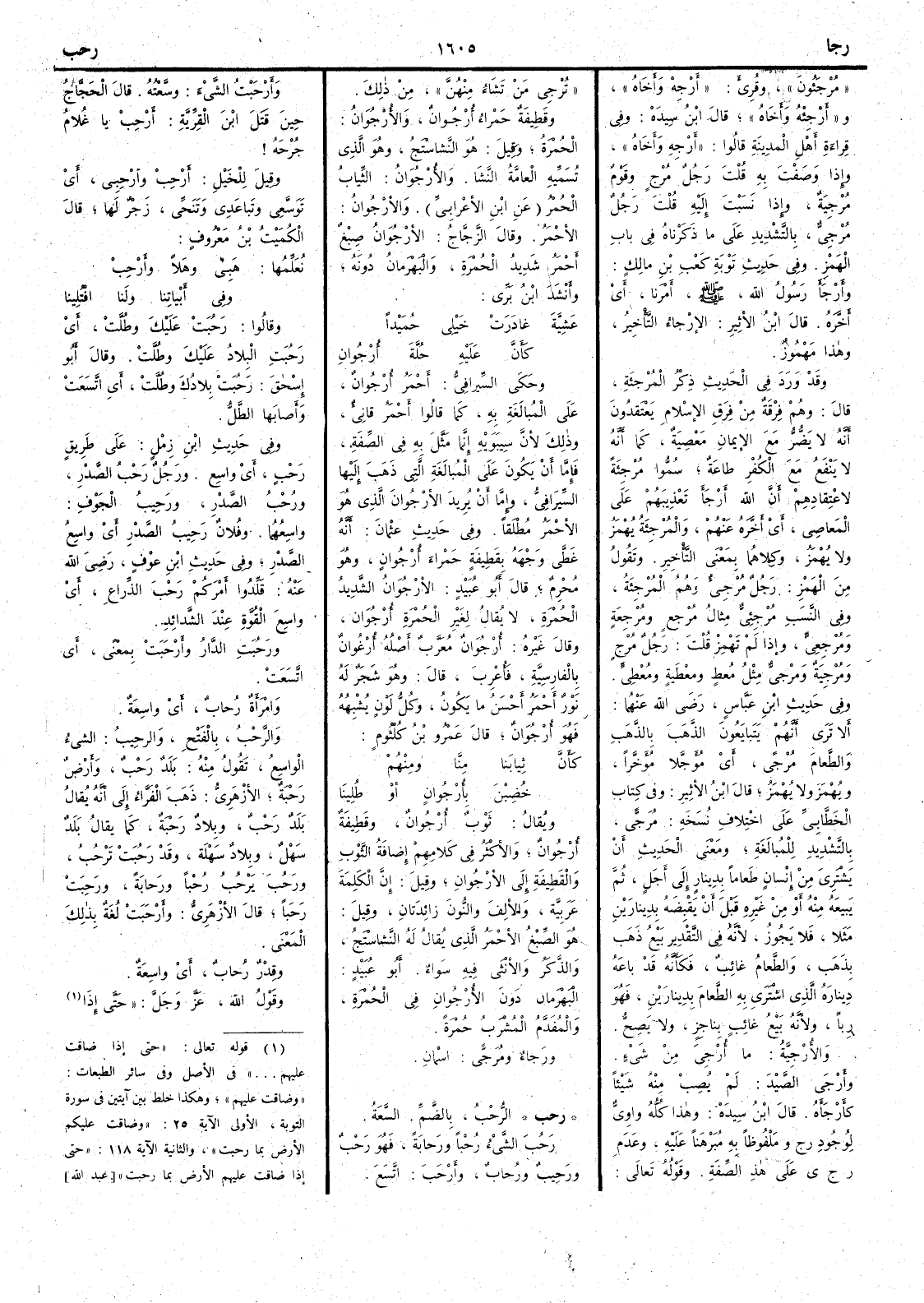 مُرْجَؤُونَ وقرئ أَرْجِهْ وأَخاه وأَرْجِئةُ وأَخاه قال ابن سيده وفي قراءة أَهل المدينة قالوا أَرْجِهِ وأَخاهُ وإذا وصفتَ به قلتَ رجلٌ مُرْجٍ وقوم مُرْجِيَة وإذا نَسَبْتَ إليه قلتَ رجلٌ مُرْجيٌّ بالتشديد على ما ذكرناه في باب الهمز وفي حديث تَوْبةِ كعب بن مالكٍ وأَرْجأَ رسولُ الله صلى الله عليه وسلم أَمْرَنا أَي أَخَّرَه قال ابن الأَثير الإرْجاء التأْخير وهذا مهموز وقد ورد في الحديث ذِكْرُ المُرْجِئَةِ قال وهم فِرقة من فِرَقِ الإسلامِ يعتقدون أَنه لا يَضُرُّ مع الإيمان مَعْصِية كما أَنه لا ينْفعُ مع الكُفْرِ طاعة سُمُّوا مُرجِئَة لاعتقادِهم أَن الله أَرجَأَ تَعْذيبَهم على المعاصي أَي أَخَّرَه عنهم والمُرْجِئة يهمز ولا يهمز وكلاهما بمعنى التَّأْخير وتقول من الهمز رجل مُرْجِئٌ وهُم المُرْجِئَة وفي النسب مُرْجِئِيٌّ مثال مُرْجِعٍ ومُرْجِعَةٍ ومُرْجِعِيٍّ وإذا لم تَهْمِز قلت رجل مُرْجٍ ومُرْجِيَة ومُرْجِيٌّ مثل مُعْطٍ ومُعْطِية ومُعْطِيّ وفي حديث ابن عباس رضي الله عنهما أَلا تَرَى أَنَّهم يتَبايَعُون الذَّهبَ بالذَّهبِ والطعام مُرَجًى أَي مُؤَجَّلاً مُؤَخَّراً ويهمز ولا يهمز قال ابن الأَثير وفي كتاب الخطابي على اختلاف نسخه مُرَجًّى بالتشديد للمبالغة ومعنى الحديث أَن يَشْتريَ من إنسانٍ طعاماً بدينارٍ إلى أَجَلٍ ثم يبيعه منه أَو من غيره قبل أَن يقبضه بدينارين مثلاً فلا يجوز لأَنه في التقدير بيعُ ذهب بذهب والطعامُ غائبٌ فكأَنه قد باعه دينارَه الذي اشترى به الطعامُ غائبٌ فكأنه قد باعه دينارَه الذي اشترى به الطعام بدينارين فهو رباً ولأنَه بيع غائبٍ بناجزٍ ولا يصح والأُرْجِيّةُ ما أُرْجِيَ من شيء وأَرْجَى الصيدَ لم يُصِبْ منه شيئاً كأَرْجأَهُ قال ابن سيده وهذا كله واويُّ لوجود ر ج و ملفوظاً به مُبَرْهَناً عليه وعدمِ ر ج ي على هذه الصفة وقوله تعالى تُرْجِي من تشاءُ منهن من ذلك وقَطِيفة حَمْراء أُرْجُوان والأُرْجُوانُ الحُمْرة وقيل هو النَّشاسْتَجُ وهو الذي تسميه العامة النّشا والأرجوانُ الثيابُ الحُمْرُ عن ابن الأَعرابي والأُرْجُوانُ الأَحْمَرُ وقال الزجاج الأُرجُوانُ صِبْغ أَحْمرَ شديد الحمرة والبَهْرَمانُ دونَه وأنشد ابن بري عَشِيَّة غادَرَت خَيْلِي حُمَيْداً كأَنَّ عليه حُلَّةَ أُرْجُوانِ وحكى السيرافي أَحمرُ أُرْجُوانٌ على المبالغة به كما قالوا أَحْمَرُ قانِئٌ وذلك لأَن سيبويه إنما مَثَّل به في الصفة فإما أَن يكون على المبالغة التي ذهب إليها السيرافي وإما أَن يُريد الأُرْجُوان الذي هو الأَحْمر مطلقاً وفي حديث عثمان أَنَّه غَطَّى وجهَه بقَطِيفَةٍ حَمْراءَ أُرْجُوانٍ وهو مُحْرِمٌ قال أَبو عبيد الأُرجوان الشديد الحُمْرَة لا يقال لغير الحُمْرة أرجوان وقال غيره أُرجُوان مُعَرَّبٌ أَصله أُرْغُوانٌ بالفارسية فأُعْرِبَ قال وهو شَجَرٌ له نَوْرٌ أَحمر أَحْسَنُ ما يَكُونُ وكلُّ لون يُشْبهُه فهو أُرْجُوانٌ قال عمرو بن كلثوم كأَنَّ ثِيابَنا مِنَّا ومنْهُمْ خُضِبْنَ بأُرْجُوانٍ أَو طُلِينا ويقال ثوبٌ أُرْجُوانٌ وقَطِيفةٌ أُرجُوانٌ والأَكثر في كلامهم إضافة الثوب والقطيفة إلى الأُرجوان وقيل إنّ الكلمةَ عربيّة والأَلف والنون زائدتان وقيل هو الصِّبْغ الأَحْمَرُ الذي يقال له النَّشاسْتَجُ والذَّكَر والأُنثى فيه سواء أََبو عبيد البَهْرَمانُ دون الأُرْجُوانِ في الحُمْرة والمُفَدَّمُ المُشْرَبُ حُمْرَةً ورَجاءٌ ومُرَجَّى اسمان ( رحب ) الرُّحْبُ بالضم السَّعةُ رَحُبَ الشيءُ رُحْباً ورَحابةً فهو رَحْبٌ ورَحِيبٌ ورُحابٌ وأَرْحَبَ اتَّسَعَ وأَرْحَبْتُ الشيءَ وسَّعْتُه قال الحَجَّاجُ حِينَ قَتَلَ ابن القِرِّيَّة أَرْحِبْ يا غُلامُ جُرْحَه وقيل للخيل أَرْحِبْ وأَرْحِبي أَي تَوَسَّعِي وتَباعَدي [ ص 414 ] وتَنَحِّي زجر لها قال الكميت بن معروف