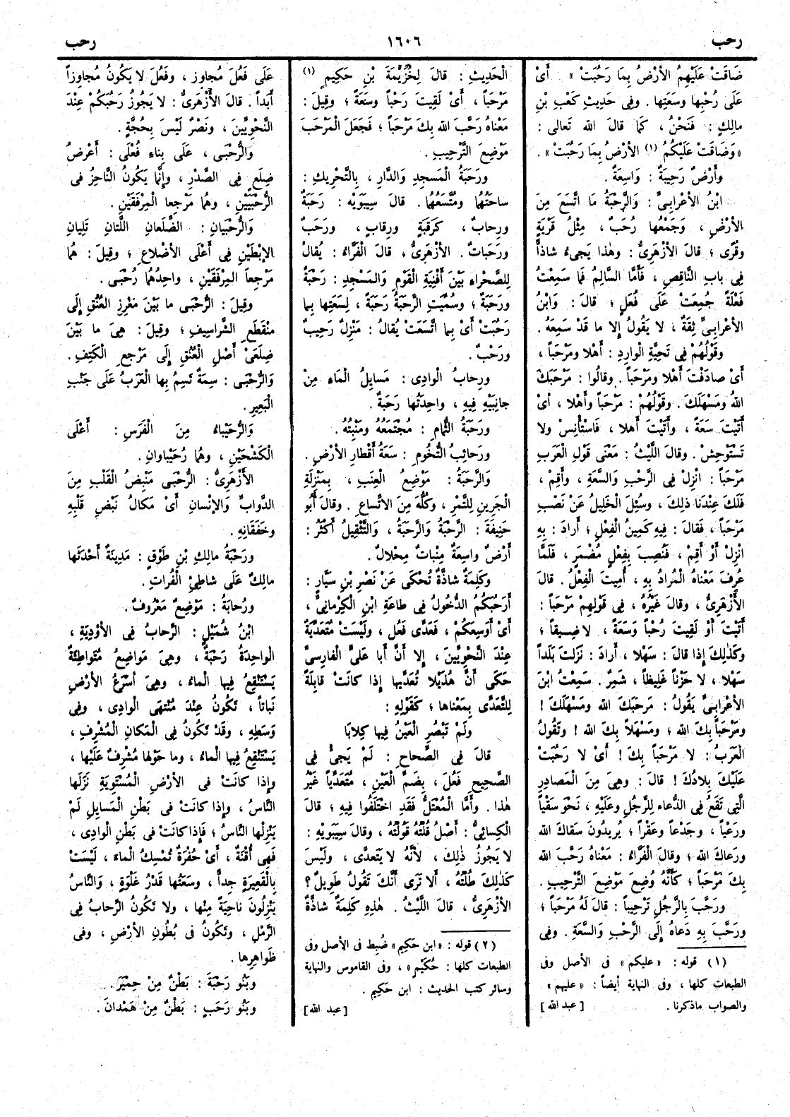 حتى اذا ضاقَتْ عليهم الأَرضُ بما رَحُبَتْ أَي على رُحْبِها وسَعَتها وفي حديث كَعْب بن مالك فنحنُ كما قال اللّه تعالى وضاقَت عليهم الأَرضُ بما رَحُبَتْ وأَرضٌ رَحِيبةٌ واسِعةٌ ابن الأَعرابي والرَّحْبةُ ما اتَّسع من الأَرض وجمعُها رُحَبٌ مثل قَرْيةٍ وقُرًى قال الأَزهري وهذا يجيء شاذاً في باب الناقص فأَما السالم فما سمعت فَعْلةً جُمعت على فُعَلٍ قال وابن الأَعرابي ثقة لا يقول إِلا ما قد سَمِعَه وقولهم في تحية الوارد أَهْلاً ومَرْحَباً أَيْ صادَفْتَ أَهْلاً ومَرْحَباً وقالوا مَرْحَبَك اللّهُ ومَسْهَلَكَ وقولهم مَرْحَباً وأَهْلاً أَي أَتَيْتَ سَعةً وأَتَيْتَ أَهْلاً فاسْتَأْنِس ولا تَسْتَوْحِشْ وقال الليث معنى قول العرب مَرْحَباً انزل في الرَّحْب والسَّعةِ وأَقِمْ فلَكَ عِندنا ذلك وسئل الخليل عن نصب مَرْحَباً فقال فيه كَمِينُ الفِعْل أَراد به انْزِلْ أَو أَقِمْ فنُصِب بفعل مضمر فلما عُرِف معناه المراد به أُمِيتَ الفِعلُ قال الأَزهري وقال غيره في قولهم مَرْحَباً أَتَيْتَ أَو لَقِيتَ رُحْباً وسَعةً لا ضِيقاً وكذلك إِذا قال سَهْلاً أَراد نَزَلْت بلَداً سَهْلاً لا حَزْناً غَلِيظاً شمر سمعت ابن الأَعرابي يقول مَرْحَبَكَ اللّهُ ومَسْهَلَكَ ومَرْحَباً بك اللّهُ ومَسْهَلاً بك اللّهُ وتقول العرب لا مَرْحَباً بك أَي لا رَحُبَتْ عليك بلادُك قال وهي من المصادر التي تقع في الدُّعاءِ للرجل وعليه نحو سَقْياً ورَعْياً وجَدْعاً وعَقْراً يريدون سَقاكَ اللّهُ ورَعاكَ اللّهُ وقال الفراءُ معناه رَحَّبَ اللّهُ بك مَرْحَباً كأَنه وُضِعَ مَوْضِعَ التَّرْحِيبِ ورَحَّبَ بالرجل تَرْحِيباً قال له مَرْحَباً ورَحَّبَ به دعاه إِلى الرَّحْبِ والسَّعَةِ وفي الحديث قال لِخُزَيمةَ بن حُكَيْمٍ مَرْحَباً أَي لَقِيتَ رَحْباً وسَعةً وقيل معناه رَحَّبَ اللّهُ بك مَرْحَباً فجعلَ المَرْحَبَ موضع التَّرْحِيب ورَحَبةُ المسجِد والدارِ بالتحريك ساحَتُهما ومُتَّسَعُهما قال سيبويه رَحَبةٌ ورِحابٌ [ ص 415 ] كرَقَبةٍ ورِقابٍ ورَحَبٌ ورَحَباتٌ الأَزهري قال الفراءُ يقال للصَّحْراءِ بين أَفْنِيَةِ القوم والمَسْجِد رَحْبةٌ ورَحَبةٌ وسميت الرَّحَبةُ رَحَبةً لسَعَتِها بما رَحُبَتْ أَي بما اتَّسَعَتْ يقال منزل رَحِيبٌ ورَحْبٌ ورِحابُ الوادِي مَسايِلُ الماءِ من جانِبَيْه فيه واحدتها رَحَبةٌ ورَحَبةُ الثُّمام مُجْتَمَعُه ومَنْبِتُه ورَحائبُ التُّخوم سَعةُ أَقْطارِ الأَرض والرَّحَبةُ مَوضِعُ العِنَبِ بمنزلة الجَرينِ للتَّمر وكلُّه من الاتساع وقال أَبو حنيفة الرَّحْبةُ والرَّحَبةُ والتثقيل أَكثر أَرض واسِعةٌ مِنْباتٌ مِحْلالٌ وكلمة شاذة تحكى عن نصر بن سَيَّارٍ أَرَحُبَكُم الدُّخولُ في طاعةِ ابن الكِرْمانِي أَي أَوَسِعَكم فعَدَّى فَعُلَ وليست مُتَعدِّيةً عند النحويين إِلا أَن أَبا علي الفارسي حكى أَن هذيلاً تعديها إِذا كانت قابلة للتعدّي بمعناها كقوله ولم تَبْصُرِ العَيْنُ فيها كِلابا قال في الصحاح لم يجئْ في الصحيح فَعُلَ بضم العين متعدياً غير هذا وأَمَّا المعتل فقد اختلفوا فيه قال الكسائي أَصل قُلْتُه قَوُلْتُه وقال سيبويه لا يجوز ذلك لأَنه لا يتعدّى وليس كذلك طُلْته أَلا ترى أَنك تقول طويل ؟ الأَزهري قال الليث هذه كلمة شاذة على فَعُلَ مُجاوِزٌ وفَعُلَ لا يكون مُجاوِزاً أَبداً قال الأَزهري لا يجوز رَحُبَكُم عند النحويين ونصر ليس بحجة والرُّحْبَى على بناءِ فُعْلَى أَعْرَضُ ضِلَعٍ في الصدرِ وإِنما يكون الناحِزُ في الرُّحْبَيَيْنِ وهما مَرْجِعا المِرْفقين والرُّحْبَيانِ الضِّلَعانِ اللتان تَلِيانِ الإِبْطَيْنِ في أَعْلَى الأَضْلاع وقيل هما مَرْجِعا المِرْفقين واحدهما رُحْبَى وقيل الرُّحْبى ما بين مَغْرِز العُنق إِلى مُنْقَطَعِ الشَّراسِيف وقيل هي ما بين ضِلَعَي أَصل العُنق إِلى مَرْجع الكَتِف والرُّحْبى سِمةٌ تَسِمُ بها العرَبُ على جَنْبِ البَعِير والرُ