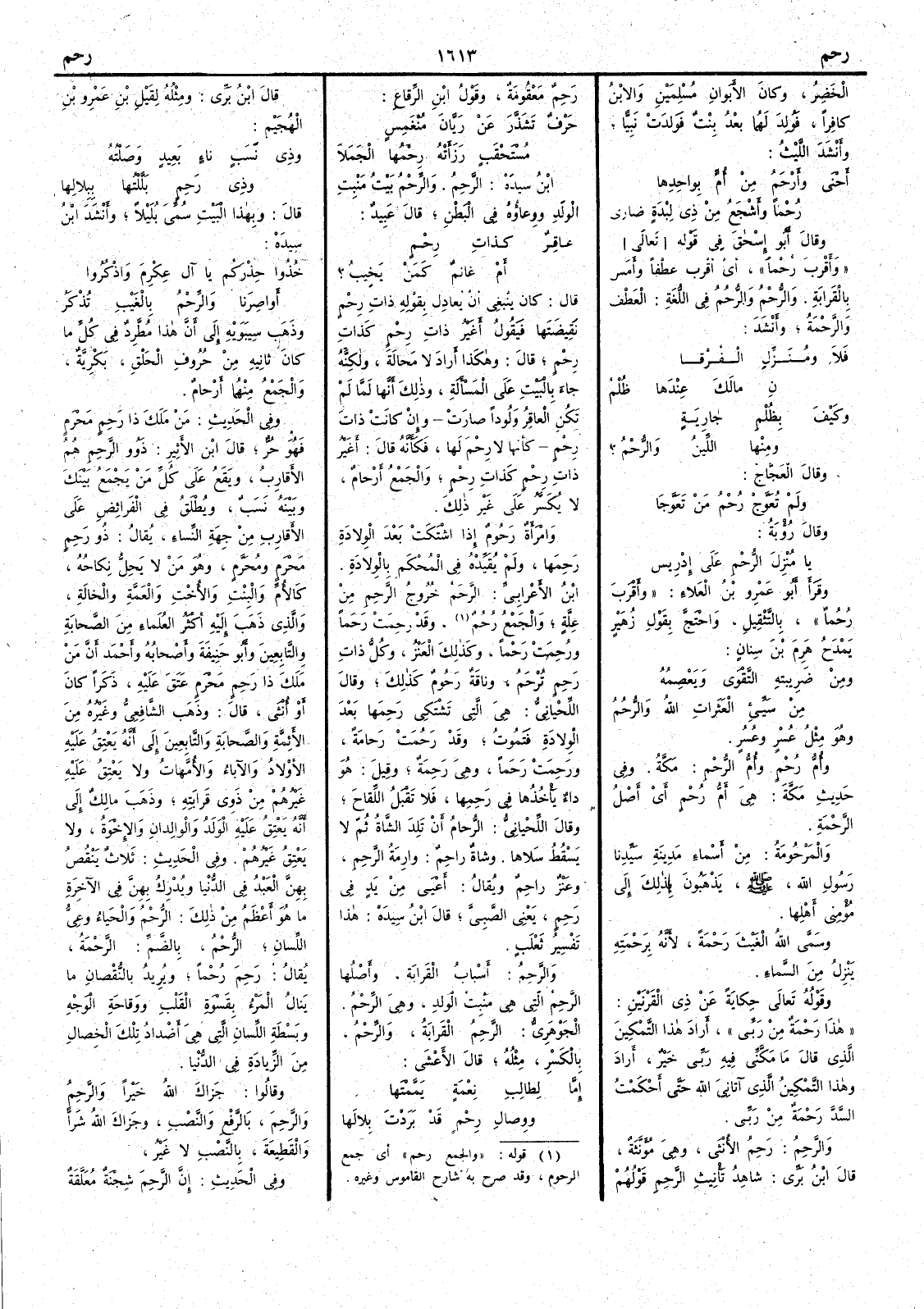 ( * قوله « والجمع رحم » أي جمع الرحوم وقد صرح به شارح القاموس وغيره ) وقد رَحِمَتْ رَحَماً ورُحِمتْ رَحْماً وكذلك العَنْزُ وكل ذات رَحِمٍ تُرْحَمُ وناقة رَحُومٌ كذلك وقال اللحياني هي التي تشتكي رَحِمَها بعد الولادة فتموت وقد رَحُمَتْ رَحامةٌ ورَحِمَتْ رَحَماً وهي رَحِمَةٌ وقيل هو داء يأْخذها في رَحِمِها فلا تقبل اللِّقاح وقال اللحياني الرُّحامُ أَن تلد الشاة ثم لا يسقط سَلاها وشاة راحِمٌ وارمةُ الرَّحِمِ وعنز راحِمٌ ويقال أَعْيَا من يدٍ في رَحِمٍ يعني الصبيَّ قال ابن سيده هذا تفسير ثعلب والرَّحِمُ أَسبابُ القرابة وأَصلُها الرَّحِمُ التي هي مَنْبِتُ الولد وهي الرِّحْمُ الجوهري الرَّحِمُ القرابة والرِّحْمُ بالكسر مثلُه قال الأَعشى إِمَّا لِطالِبِ نِعْمة يَمَّمْتَها ووِصالَ رِحْمٍ قد بَرَدْتَ بِلالَها قال ابن بري ومثله لقَيْل بن عمرو بن الهُجَيْم وذي نَسَب ناءٍ بعيد وَصَلتُه وذي رَحِمٍ بَلَّلتُها بِبِلاها قال وبهذا البيت سمي بُلَيْلاً وأَنشد ابن سيده خُذُوا حِذرَكُم يا آلَ عِكرِمَ واذكروا أَواصِرَنا والرِّحْمُ بالغَيْب تُذكَرُ وذهب سيبويه إِلى أَن هذا مطرد في كلِّ ما كان ثانِيه من حروف الحَلْقِ بَكْرِيَّةٌ والجمع منهما أَرْحامٌ وفي الحديث من مَلَكَ ذا رَحِمٍ مَحْرَمٍ فهو حُرٌّ قال ابن الأَثير ذَوو الرَّحِمِ هم الأَقارب ويقع على كل من يجمع بينك وبينه نسَب ويطلق في الفرائض على الأَقارب من جهة النساء يقال ذُو رَحِمٍ مَحْرَم ومُحَرَّم وهو مَن لا يَحِلّ نكاحه كالأُم والبنت والأُخت والعمة والخالة والذي ذهب إِليه أَكثر العلماء من الصحابة والتابعين وأَبو خنيفة وأَصحابُه وأَحمدُ أَن مَنْ مَلك ذا رَحِمٍ مَحْرَمٍ عَتَقَ عليه ذكراً كان أَو أُنثى قال وذهب الشافعي وغيره من الأئمة والصحابة والتابعين إِلى أَنه يَعْتِقُ عليه الأَولادُ والآباءُ والأُمهاتُ ولا يَعْتِقُ عليه غيرُهم من ذوي قرابته وذهب مالك إِلى أَنه يَعْتِقُ عليه الولد والوالدان والإِخْوة ولا يَعْتِقُ غيرُهم وفي الحديث ثلاث يَنْقُصُ بهنّ العبدُ في الدنيا ويُدْرِكُ بهنّ في الآخرة ما هو أَعظم من ذلك الرُّحْمُ والحَياءُ وعِيُّ اللسان الرُّحْمُ بالضم الرَّحْمَةُ يقال رَحِمَ رُحْماً ويريد بالنقصان ما يَنال المرءُ بقسوة القلب ووَقاحَة الوَجْه وبَسْطة اللسان التي هي أَضداد تلك الخصال من الزيادة في الدنيا وقالوا جزاك اللهُ خيراً والرَّحِمُ والرَّحِمَ بالرفع والنصب وجزاك الله شرّاً والقطيعَة بالنصب لا غير وفي الحديث إِن الرَّحِمَ شِجْنَةٌ مُعلقة