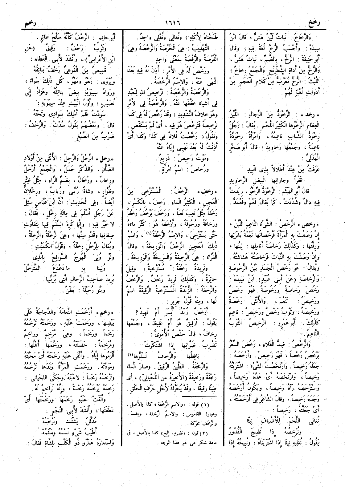 والرَّخَاخُ نبات لَيِّن هَشٌّ قال ابن سيده وأَحسب الرُّخَّ لغة فيه وقال أَبو حنيفة الرُّخُّ بالضم نبات هَشّ والرُّخُّ من أَداة الشطرنج والجمع رِخاخ الليث الرُّخّ معرب من كلام العجم من أَدوات لُعْبَة لهم ( رخد ) الرِّخْوَدُّ من الرجال اللَّيِّنُ العظام الرِّخْوُها الكثير اللحم يقال رجل رِخْوَدُّ الشباب ناعمه وامرأَة رِخوَدَّةٌ ناعمة وجمعُها رَخاوِيدُ قال أَبو صخر الهذلي عَرَفْتُ من هِنْدَ أَطلالاً بذي البِيدِ قَفْراً وجاراتها البيضِ الرَّخاوِيدِ قال أَبو الهثيم الرِّخْوَدُّ الرِّخْوُ زيدت فيه دال وشددت كما يقال فَعْمٌ وفَعْمَدّ ( رخص ) الرَّخْصُ الشيء الناعم اللَّيِّنُ إِن وَصَفْت به المرأَة فرُخْصانُها نَعْمَةُ بَشَرتها ورِقّتُها وكذلك رَخاصةُ أَنامِلها لِينُها وإِن وَصَفْت به النَّبَات فرَخاصَتُه هَشاشَتُه ويقال هو رَخْصُ الجسد بَيِّن الرُّخُوصةِ والرَّخاصةِ عن أَبي عبيد ابن سيده رَخُصَ رَخاصةً ورُخوصةً فهو رَخْصٌ ورَخِيصٌ تنَعّم والأُنثى رَخْصةٌ ورَخِيصةٌ وثوب رَخْصٌ ورَخِيص ناعم كذلك أَبو عمرو الرَّخِيصُ الثوب الناعم والرُّخْصُ ضدّ الغلاءِ رَخُصَ السِّعْر يَرْخُص رُخْصاً فهو رَخِيصٌ وأَرْخَصَه جعله رَخِيصاً وارْتَخَصْت الشيء اشتريته رَخِيصاً وارْتَخَصَه أَي عَدَّه رَخِيصاً واسْتَرْخَصَه رآه رَخِيصاً ويكون أَرْخَصَه وجَدَه رَخِيصاً وقال الشاعر في أَرْخَصْته أَي جعلته رَخِيصاً نُغالي اللَّحْمَ للأَضْيافِ نِيّاً ونُرْخِصُه إِذا نَضِجَ القُدورُ يقول نُغْلِيه نِيّاً إِذا اشْتَرَيْناه ونُبِيحُه إِذا طَبَخْناه لأَكله ونُغالي ونُغْلي واحدٌ التهذيب هي الخُرْصة والرُّخْصة وهي الفُرْصة والرُّفْصة بمعنى واحد ورَخَّصَ له في الأَمر أَذِنَ له فيه بعد النهي عنه والاسم الرُّخْصةُ والرُّخُصةُ والرُّخْصةُ تَرْخِيصُ اللّه للعبد في أَشياءَ خَفَّفَها عنه والرُّخْصةُ في الأَمر وهو خلاف التشديد وقد رُخِّصَ له في كذا ترْخِيصاً فترَخَّصَ هو فيه أَي لم يَسْتَقْصِ وتقول رَخَّصْت فلاناً في كذا وكذا أَي أَذِنْت له بعد نهيي إِيّاه عنه ومَوْت رَخِيصٌ ذَرِيع ورُخاصُ اسم امرأَة ( رخف ) الرَّخْفُ المُسْترخِي من العَجِينِ الكثير الماء رَخِفَ بالكسر رَخَفاً مثل تَعِبَ تَعَباً ورَخَفَ يَرْخُفُ رَخْفاً ورَخافَةً ورُخُوفةً وأَرْخفه هو كَثَّرَ ماءَه حتى يَسْترخي والاسم الرُّخْفَة واسم ذلك العجين الرَّخْفُ والوَرِيخَةُ وقال الفراء هي الرَّخِيفَةُ والمَرِيخَةُ والوَرِيخَةُ وثَريدَةٌ رَخْفَةٌ مُسْتَرْخِيةٌ وقيل خاثرةٌ وكذلك ثريد رَخْفٌ والرَّخْفُ والرَّخْفَةُ الزُّبْدَةُ المُسْتَرْخِيةُ الرقيقة اسم لها ومنه قول جرير أَرَخْفٌ زُبْدُ أَيْسَرَ أَمْ نَهِيدُ ؟ يقول أَرَقِيقٌ هو أَم غَلِيظٌ وجمعها رِخافٌ قال حفص الأَُمَوِيّ تَضْربُ ضَرّاتها إذا اشْتَكَرَت نافِطُها والرِّخافُ تَسْلَؤُها