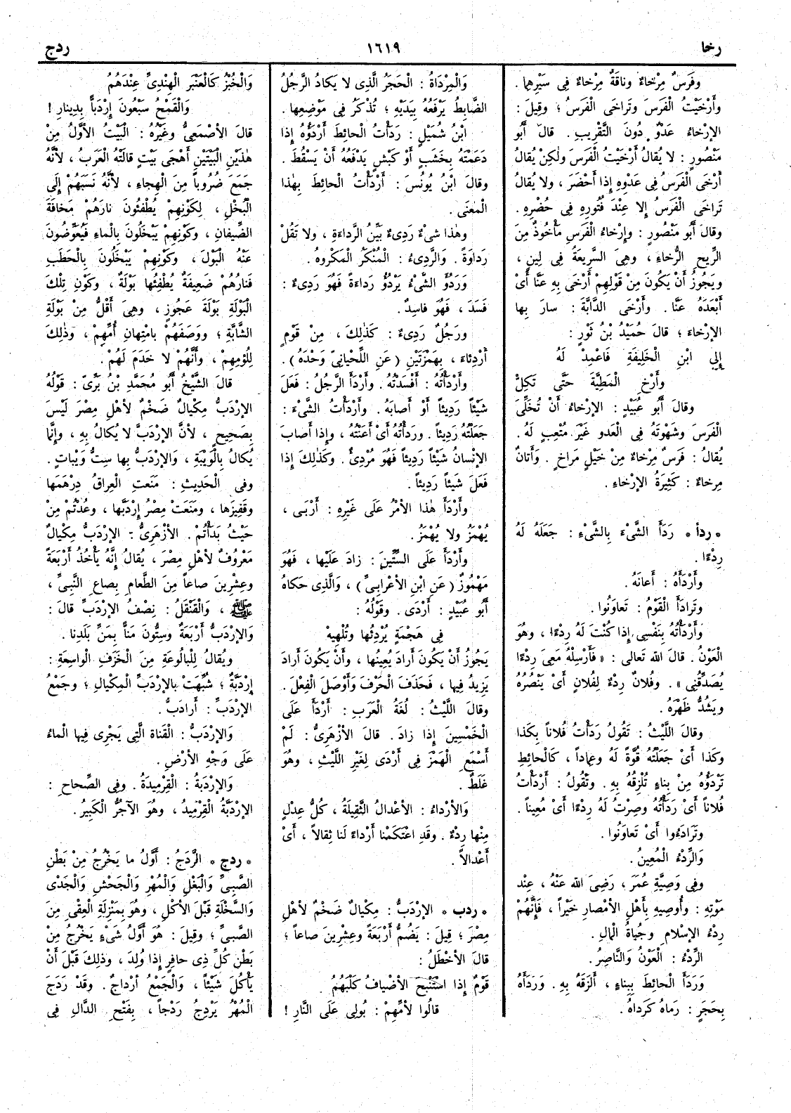 قال الأَصمعي وغيره البَيْتُ الأَوَّل من هذين البَيْتَيْنِ أَهْجَى بيت قالته العَرَبُ لأَنه جَمَع ضُرُوباً من الهِجاءِ لأَنه نَسَبَهم إِلى البُخْل لكونهم يُطْفِئُون نارَهم مَخافةَ الضِّيفان وكونِهم يَبْخَلُون بالماءِ فيُعَوِّضُونَ عنه البولَ وكونِهم يَبْخَلُون بالحَطَبِ فنارُهُمْ ضَعِيفَةٌ يُطْفِئُها بَوْلَة وكونِ تلكَ البَوْلَة بَوْلَة عَجُوزٍ وهي أَقلُّ مِن بَوْلَةِ الشابة ووصَفَهم بامْتِهانِ أُمِّهم وذلك لِلُؤْمِهِم وأَنهم لا خَدَمَ لَهم قال الشيخ أَبو محمد بن بري قوله الإِرْدَبُّ مِكْيالٌ ضَخْمٌ لأَهْلِ مِصْر ليس بصحيح لأَنَّ الإِرْدَبَّ لا يُكال به وإِنما يُكالُ بالوَيْبَةِ والإِرْدَبُّ بها سِتُّ وَيْباتٍ وفي الحديث مَنَعَتِ العِراقُ دِرْهَمَها وقَفِيزَها ومَنَعَتْ مِصْرُ إِرْدَبَّها وعُدْتُم من حَيْثُ بَدَأْتُمْ الأَزهري الإِرْدَبُّ مِكْيالٌ معروف لأَهْلِ مِصْرَ يقال إِنه يَأْخُذُ أَرْبَعَةً وعِشرِينَ صاعاً مِن الطَّعامِ بصاعِ النبيِّ صلى اللّه عليه وسلم والقَنْقَل نِصفُ الإِرْدَبّ قال والإِرْدَبُّ أَربعةٌ وستُّون مَنّاً بمَنِّ بَلَدِنا ويقال للبالُوعةِ من الخَزَف الواسِعَةِ إِرْدَبَّة شُبِّهَتْ بالإِرْدَبِّ المكيالِ وجمع الإِرْدَبِّ أَرادِبُّ والإِرْدَبُّ القَناةُ التي يَجْري فيها الماءُ على وجهِ الأَرضِ والإِرْدَبَّةُ القِرْمِيدَةُ وفي الصحاح الإِرْدَبَّة القِرْمِيدُ وهو الآجُرُّ الكبيرُ ( ردج ) الرَّدَجُ أَول ما يخرج من بطن الصبي والبغل والمُهْرِ والجَحْشِ والجَدْيِ والسَّخْلَةِ قبل الأَكل وهو بمنزلة العِقْيِ من الصبي وقيل هو أَول شيء يخرج من بطن كل ذي حافر إِذا ولد وذلك قبل أَن يأْكل شيئاً والجمع أَرْداجٌ وقد رَدَجَ المهر يَرْدِجُ رَدْجاً بفتح الدال في
