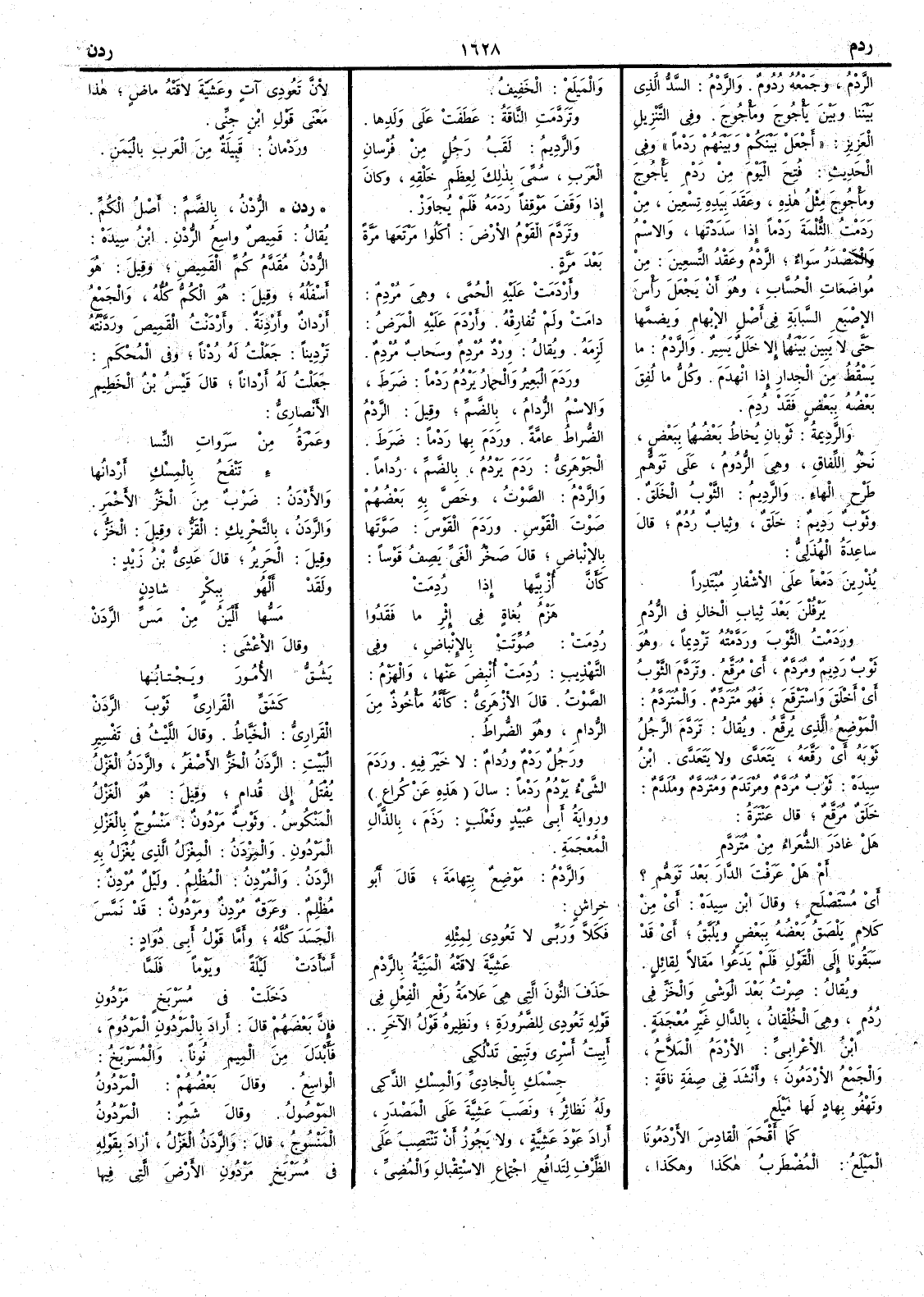 الرَّدْمُ وجمعه رُدُومٌ والرَّدْمُ السَّدُّ الذي بيننا وبين يَأْجوج ومَأْجوج وفي التنزيل العزيز أَجْعَلْ بينكم وبينهم رَدْماً وفي الحديث فُتِح اليومَ من رَدْمِ يأْجوج ومأْجوج مثلُ هذه وعَقَدَ بيده تسعين من رَدَمْتُ الثُّلْمَة رَدْماً إذا سَددتها والاسم والمصدر سواء الرَّدْمُ وعَقْدُ التسعين من مُواضَعات الحُسّاب وهو أن يجعل رأس الإصبع السَّبابة في أصل الإبهام ويضمها حتى لا يَبين بينهما إلا خَلَلٌ يسير والرَّدْمُ ما يسقط من الجدار إذا انهدم وكل ما لُفِقَ بعضُه ببعض فقد رُدِمَ والرَّدِيمةُ ثوبان يخاط بعضهما ببعض نحو اللِّفاق وهي الرُّدُومُ على توهم طرح الهاء والرَّدِيمُ الثوب الخَلَقُ وثوب رَدِيمٌ خَلَقٌ وثياب رُدُمٌ قال ساعدة الهذلي يُذْرِينَ دَمْعاً على الأَشْفارِ مُبْتَدِراً يَرْفُلْنَ بعد ثِيابِ الخالِ في الرُّدُمِ ورَدَمْتُ الثوب ورَدَّمْتُه تَرْدِيماً وهو ثوب رَديمٌ ومُرَدَّمٌ أي مرقع وتَرَدَّمَ الثوبُ أي أَخْلَقَ واسْتَرْقَعَ فهو مُتَرَدِّمٌ والمُتَرَدَّمُ الموضع الذي يُرَقَّعُ ويقال تَرَدَّمَ الرجلُ ثوبه أي رقعه يتعدى ولا يتعدى ابن سيده ثوب مُرَدَّمٌ ومُرْتَدَمٌ ومُتَرَدَّمٌ ومُلَدَّمٌ خَلَقٌ مُرَقَّعٌ قال عنترة هل غادَرَ الشُّعَراءُ من مُتَرَدَّمِ أم هل عَرَفْتَ الدارَ بعد تَوَهُّمِ ؟ معناه أي مُسْتَصْلَحٍ وقال ابن سيده أي من كلام يَلْصَقُ بعضُه ببعض ويُلَبَّق أي قد سبقونا إلى القول فلم يَدَعُوا مقالاً لقائل ويقال صِرتُ بعد الوَشْي والخَزِّ في رُدُمٍ وهي الخُلْقان بالدال غير معجمة ابن الأعرابي الأَرْدَمُ المَلاَّحُ والجمع الأَرْدمون وأنشد في صفة ناقة وتَهْفُو بهادٍ لها مَيْلَعٍ كما أقحَمَ القادِسَ الأرْدَمُونا المَيْلَعُ المضطرب هكذا وهكذا والمَيْلَعُ الخفيف وتَرَدَّمَتِ الناقةُ عطفت على ولدها والرَّدِيمُ لَقَب رجل من فُرْسان العرب سُمِّي بذلك لعظم خَلقِه وكان إذا وقف مَوْقِفاً رَدَمَهُ فلم يجاوز وتَرَدَّمَ القومُ الأرض أكلوا مَرْتَعَها مرة بعد مرة وأَرْدَمَتْ عليه الحُمَّى وهي مُرْدِمٌ دامت ولم تفارقه وأرْدَمَ عليه المرضُ لزمه ويقال وِرْدٌ مُرْدِمٌ وسحاب مُرُْدِمٌ ورَدَمَ البعيرُ والحمار يَرْدُمُ رَدْماً ضَرطَ والاسم الرُّدامُ بالضم وقيل الرَّدْمُ الضُّراط عامَّةً ورَدَمَ بها رَدْماً ضَرطَ الجوهري رَدَمَ يَرْدُمُ بالضم رُداماً والرَّدْمُ الصوت وخص به بعضهم صوت القَوْس ورَدَمَ القوس صَوَّتها بالإنْباض قال صَخْر الغَيّ يصف قوساً كأنَّ أُزْبِيَّها إذا رُدِمَتْ هَزْمُ بُغاةٍ في إثْرِ ما فَقَدُوا رُدِمَتْ صُوّتت بالإِنْباض وفي التهذيب رُدِمَتْ أُنْبض عنها والهَزْمُ الصوت قال الأزهري كأنه مأْخوذ من الرُّدامِ وهو الضراط ورجل رَدْمٌ ورُدامٌ لا خير فيه ورَدَمَ الشيءُ يَرْدُمُ رَدْماً سال هذه عن كراع ورواية أبي عبيد وثعلب رَذَمَ بالذال المعجمة والرَّدْمُ موضع بتهامة قال أَبو خِراش فَكَلاّ ورَبِّي لا تعودي لِمِثْلِهِ عَشِيّةَ لاقَتْهُ المَنِيّةُ بالرَّدْمِ حذف النون التي هي علامة رفع الفعل في قوله تَعُودي للضرورة ونظيره قول الآخر أَبيتُ أَسْرِي وتَبِيتي تَدْلُكي جسمك بالجادِيِّ والمِسْكِ الذكي وله نظائر ونصب عشية على المصدر أراد عَوْدَ عشيةٍ ولا يجوز أن تنتصب على الظرف لتدافع اجتماع الاستقبال والمضي لأن تعودي آتٍ وعشية لاقَتْهُ ماض هذا معنى قول ابن جني ورَدْمان قبيلة من العرب باليمن ( ردن ) الرُّدْنُ بالضم أَصل الكُمّ يقال قميص واسع الرُّدْن ابن سيده الرُّدْن مقدّم كمّ القميص وقيل هو أَسفله وقيل هو الكمّ كله والجمع أَرْدانٌ وأَرْدِنَة وأَرْدَنْتُ القميصَ ورَدّنْته تَرْديناً جعلت له رُدْناً وفي المحكم جعلت له أَرْداناً قال قيس بن الخَطِيم الأَنصاري وعَمْرَةُ من سَرَواتِ النِّسا ءِ تَنْفَحُ بالمسكِ أَرْدانُها والأَرْدَنُ ضرب من الخز الأَحمر والرَّدَنُ بالتحريك القَزّ وقيل الخَزّ وقيل الحرير قا