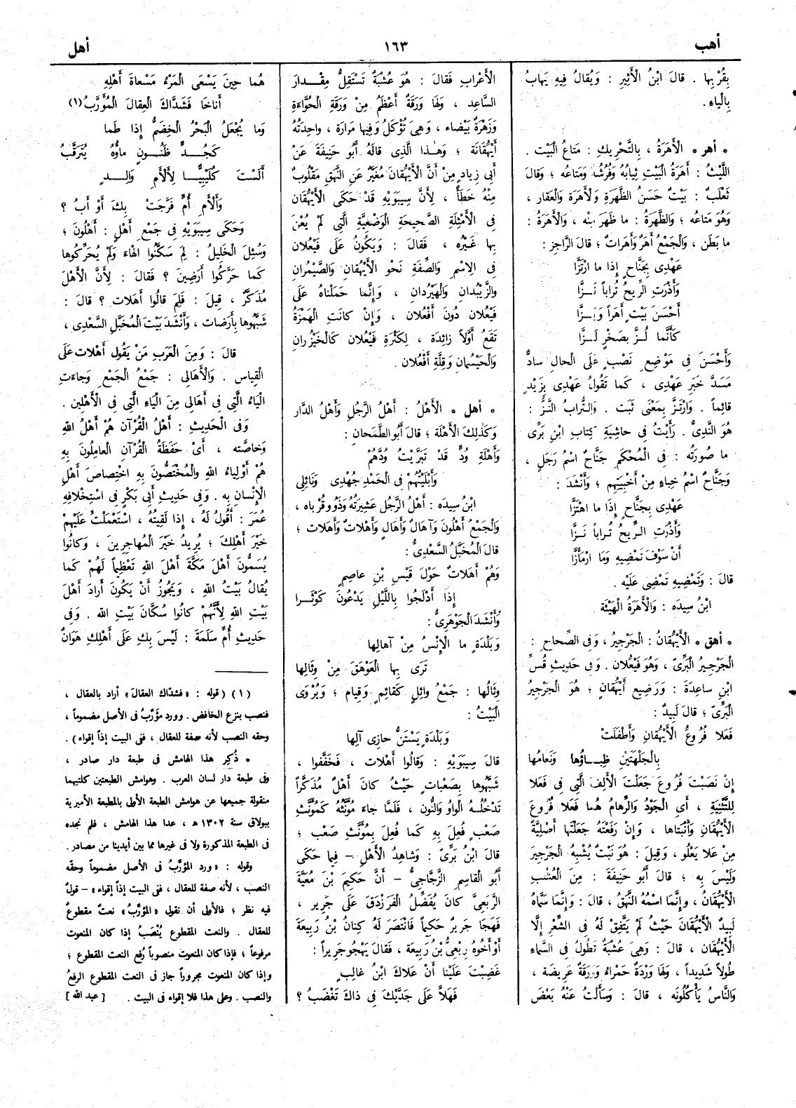 ( أهل ) الأَهْل أَهل الرجل وأَهْلُ الدار وكذلك الأَهْلة قال أَبو الطَّمَحان وأَهْلةِ وُدٍٍّّ تَبَرَّيتُ وُدَّهم وأَبْلَيْتُهم في الحمد جُهْدي ونَائلي ابن سيده أَهْل الرجل عَشِيرتُه وذَوُو قُرْباه والجمع أَهْلون وآهَالٌ وأَهَالٍ وأَهْلات وأَهَلات قال المُخَبَّل السعدي وهُمْ أَهَلاتٌ حَوْلَ قَيْسِ بنِ عاصم إِذا أَدْلَجوا باللَّيل يَدْعُونَ كَوْثَرا وأَنشد الجوهري وبَلْدَةٍ ما الإِنْسُ من آهالِها تَرَى بِها العَوْهَقَ من وِئالُها وِثالُها جمع وائل كقائم وقِيام ويروى البيت وبَلْدَةٍ يَسْتَنُّ حازي آلِها قال سيبويه وقالوا أَهْلات فخففوا شَبَّهوها بصعْبات حيث كان أَهل مذكَّراً تدخله الواو والنون فلما جاء مؤنثه كمؤنث صَعْب فُعل به كما فعل بمؤنث صَعْب قال ابن بري وشاهد الأَهْل فيما حَكى أَبو القاسم الزجاجي أَن حَكِيم بن مُعَيَّة الرَّبَعي كان يُفَضِّل الفَرَزْدق على جَرير فهَجَا جرير حكيماً فانتصر له كنان بن ربيعة أَو أَخوه ربعي بن ربيعة فقال يهجو جريراً غَضِبْتَ علينا أَن عَلاك ابن غالب فهَلاَّ على جَدَّيْك في ذاك تَغْضَبُ ؟ هما حينَ يَسْعَى المَرْءُ مَسْعاةَ أَهْلِهِ أَناخَا فشَدَّاك العِقال المُؤَرَّبُ