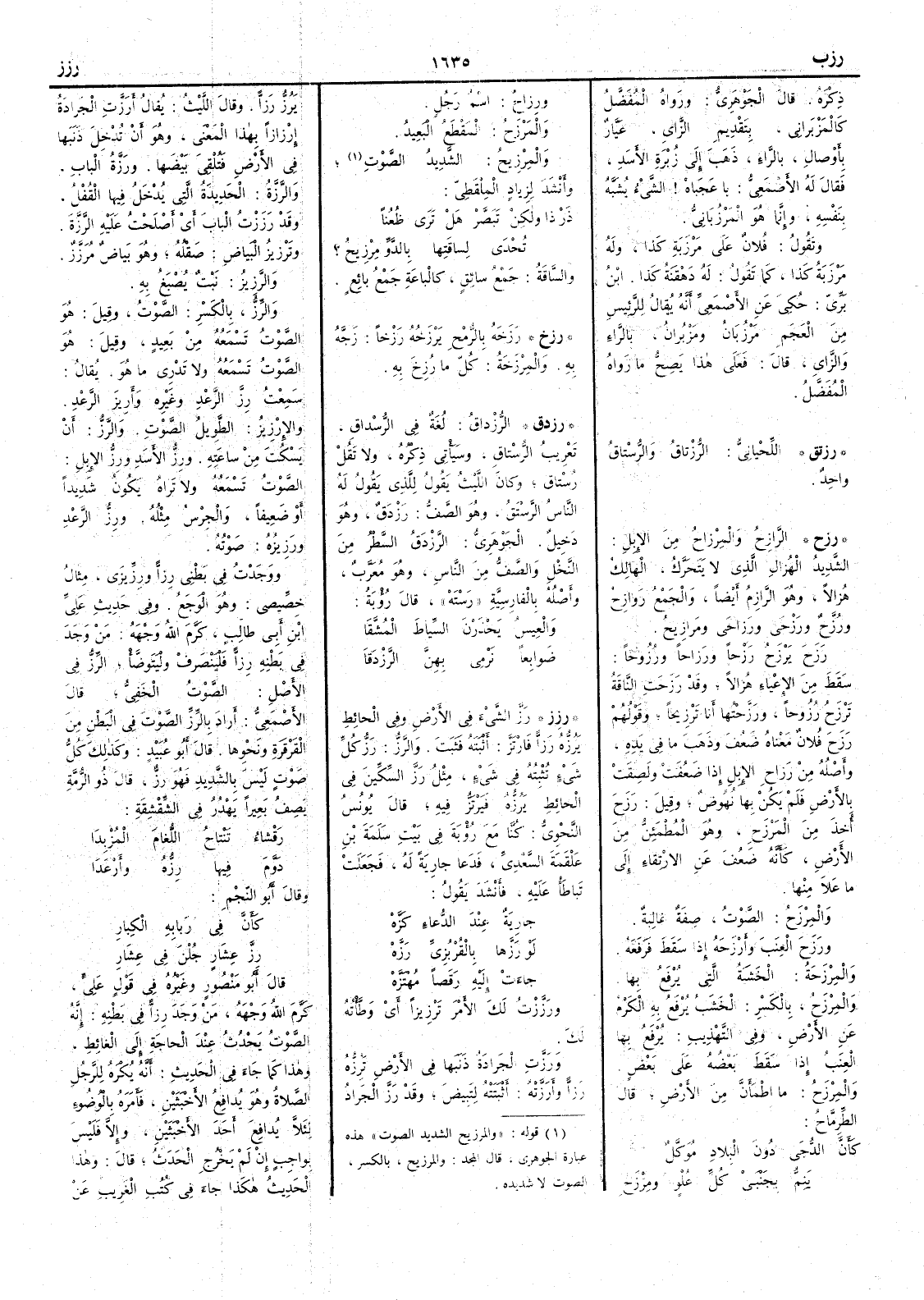 ذِكره قال الجوهري ورواه المفَضَّل كالمَزبراني بتقديم الزاي عَيّارٌ بأَوْصال بالراءِ ذهب إِلى زُبْرَةِ الأَسَد فقال له الأَصْمَعي يا عَجَباهْ الشيءُ يُشَبَّه بنفسِه وإِنما هو المَرْزُبانيُّ وتقول فلانٌ على مَرْزَبة كذا وله مَرْزَبة كذا كما تقول له دَهْقَنة كذا ابن بري حكي عن الأَصمعي أَنه يقال للرئيس من العجم مَرْزُبان ومَزْبُران بالراءِ والزاي قال فعلى هذا يصحّ ما رواه المُفَضَّل ( رزتق ) اللحياني الرُّزْتاقُ والرُّسْتاقُ واحد ( رزح ) الرَّازِحُ والمِرْزاحُ من الإِبل الشديد الهُزال الذي لا يتحرك الهالك هُزالاً وهو الرَّازِمُ أَيضاً والجمع رَوازِحُ ورُزَّحٌ ورَزْحَى ورَزاحَى ومَرازِيحُ رَزَحَ يَرْزَحُ رَزْحاً ورَزاحاً ورُزُوحاً سقط من الإِعياءِ هُزالاً وقد رَزَحَتِ الناقةُ تَرْزَحُ رُزُوحاً ورَزَّحْتُها أَنا تَرْزِيحاً وقولهم رَزَحَ فلانٌ معناه ضَعُف وذهب ما في يده وأَصله من رَزاحِ الإِبل إِذا ضَعُفَتْ ولَصِقَتْ بالأَرض فلم يكن بها نُهوض وقيل رَزَحَ أُخِذَ من المَرْزَحِ وهو المطمئن من الأَرض كأَنه ضعف عن الارتقاء إِلى ما علا منها والمِرْزَحُ الصوتُ صفة غالبة ورَزَحَ العنبَ وأَرْزَحه إِذا سقط فرفعه والمِرْزَحَة الخشبة التي يُرفع بها والمِرْزَحُ بالكسر الخشب يرفع به الكرم عن الأَرض وفي التهذيب يرفع بها العنب إِذا سقط بعضه على بعض والمِرْزَحُ ما اطمأَنَّ من الأَرض قال الطرمَّاح كأَنَّ الدُّجَى دونَ البلادِ مُوَكَّلٌ يَنِمُّ بِجَنْبَيْ كلِّ عُلْوٍ ومِرْزَحِ ورِزاحٌ اسم رجل والمَرْزَحُ المَقْطَعُ البعيد والمِرْزِيحُ الشديد الصوت