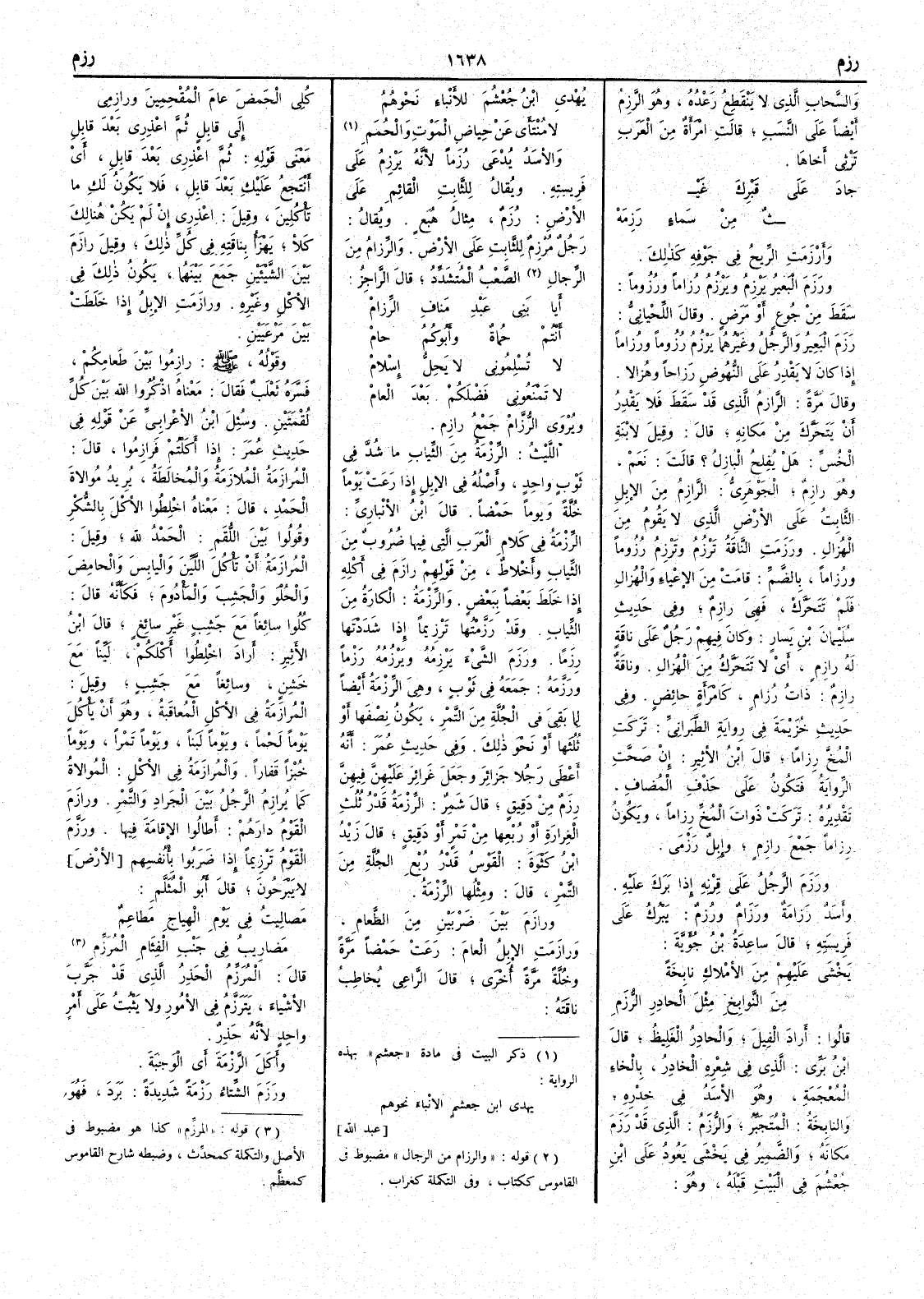 ( * قوله « والرزام من الرجال » مضبوط في القاموس ككتاب وفي التكملة كغراب ) الصَّعْب المُتَشدِّد قال الراجز أيا بَني عَبْدِ مَناف الرِّزام أنتم حُماةٌ وأبوكمُ حام لا تُسلموني لا يَحلُّ إسْلام لا تَمْنَعُوني فضلكمْ بعدَ العام ويروى الرُّزَّام جمع رازِم الليث الرِّزْمة من الثياب ما شُدَّ في ثوب واحد وأصله في الإبل إذا رعت يوماً خُلَّةً ويوماً حَمْضاً قال ابن الأنباري الرِّزْمَة في كلام العرب التي فيها ضُروب من الثياب وأَخلاط من قولهم رازَمَ في أَكله إذا خَلَط بعضاً ببعض والرِّزمة الكارةُ من الثياب وقد رَزَّمتها تَرْزِيماً إذا شددتها رِزَماً ورَزَمَ الشيء يَرْزِمه ويَرْزُمه رَزْماً ورَزَّمه جمعه في ثوب وهي الرِّزْمة أيضاً لما بقي في الجُلَّةِ من التمر يكون نصفها أو ثلثها أو نحو ذلك وفي حديث عمر أَنه أَعطى رجلاً جَزائرَ وجعل غرائرَ عليهن فيهن من رِزَمٍ من دقيق قال شمر الرِّزْمة قدر ثلث الغِرارة أو ربعها من تمر أو دقيق قال زبد بن كَثْوة القَوْسُ قدر ربع الجُلَّة من التمر قال ومثلها الرِّزْمة ورازَمَ بين ضَرْبين من الطعام ورازَمت الإبلُ العامَ رعت حَمْضاً مرَّة وخُلّة مرة أُخرى قال الراعي يخاطب ناقته كُلي الحَمْضَ عامَ المُقْحِمِينَ ورازِمي إلى قابلٍ ثم اعْذِري بعدَ قابِل معنى قوله ثم اعْذِري بعد قابل أَي أَنْتَجع عليك بعد قابل فلا يكون لك ما تأْكلين وقيل اعْذِري إن لم يكن هنالك كلأٌ يَهْزَأُ بناقته في كل ذلك وقيل رازَمَ بين الشيئين جمع بينهما يكون ذلك في الأَكل وغيره ورازَمَتِ الإبل إذا خَلَطَت بين مَرْعَيَيْن وقوله صلى الله عليه وسلم رازِمُوا بين طعامكم فسره ثعلب فقال معناه اذكروا الله بين كل لقمتن وسئل ابن الأعرابي عن قوله في حديث عمر إذا أَكلتم فرازِمُوا قال المُرازَمة المُلازَمة والمخالطة يريد مُوالاة الحمد قال معناه اخْلطوا الأَكل بالشكر وقولوا بين اللُّقم الحمد لله وقيل المرازمة أن تأْكل الليّن واليابس والحامضَ والحُلو والجَشِب والمَأْدُوم فكأنه قال كلوا سائغاً مع خَشب غير سائغ قال ابن الأثير أَراد خلطوا أكلكم ليِّناً مع خَشِن وسائغاً مع جَشِب وقيل المُرازمة في الأكل المعاقبة وهو أن يأْكل يوماً لحماً ويوماً لَبَناً ويوماً تمراً ويوماً خبزاً قَفاراً والمُرازَمَةُ في الأكل المُوالاة كما يُرازِمُ الرجل بين الجَراد والتمر ورازَمَ القوم دارَهُمْ أَطالوا الإقامة فيها ورَزَّمَ القومُ تَرْزيماً إذا ضربوا بأنفسهم لا يَبْرَحون قال أبو المُثَلَّمِ مَصاليتُ في يوم الهِياجِ مَطاعمٌ مَضاريبُ في جَنْبِ الفِئامِ المُرَزِّمِ