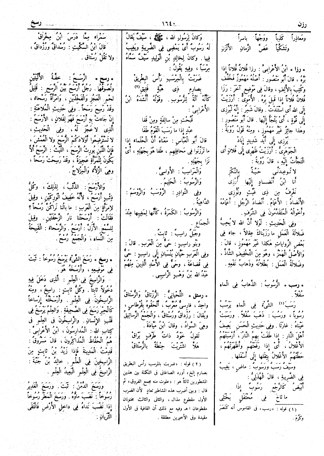 قال أَبو العباس معناه أَن الحُلَماءَ إِذا ما تَرَزَّنوا في مَحافِلِهِم طَفا هو بجَهْلِه أَي نَزَا بجَهْلِه والمَرَاسِبُ الأَواسِي والرَّسوبُ الحليم وفي النوادر الرَّوْسَبُ والرَّوْسَمُ الداهِيةُ والرَّسُوب الكَمَرة كأَنها لِمَغيبِها عند الجماعِ وجَبَل راسِبٌ ثابتٌ وبَنُو راسبٍ حيٌّ من العرب قال وفي العربِ حَيَّانِ يُنْسبان إِلى راسبٍ حيّ في قُضاعة وحيٌّ في الأَسْد الذين منهم عبداللّه بن وهب الراسبِي رستق ) اللحياني الرُّزتاق والرُّستاق واحد فارسي معرب أَلحقوه بقُرْطاس ويقال رُزْداق ورُستاق والجمع الرَّساتِيقُ وهي السواد وقال ابن مَيّادةَ تقولُ خَوْدٌ ذاتُ طَرْفٍ بَرّاقْ هَلاَّ اشْتَرَيْتَ حِنْطةً بالرُّسْتاقْ سَمْراء ممّا دَرَسَ ابنُ مِخْراقْ قال ابن السكيت رُسداق ورُزداق ولا تقل رُستاق