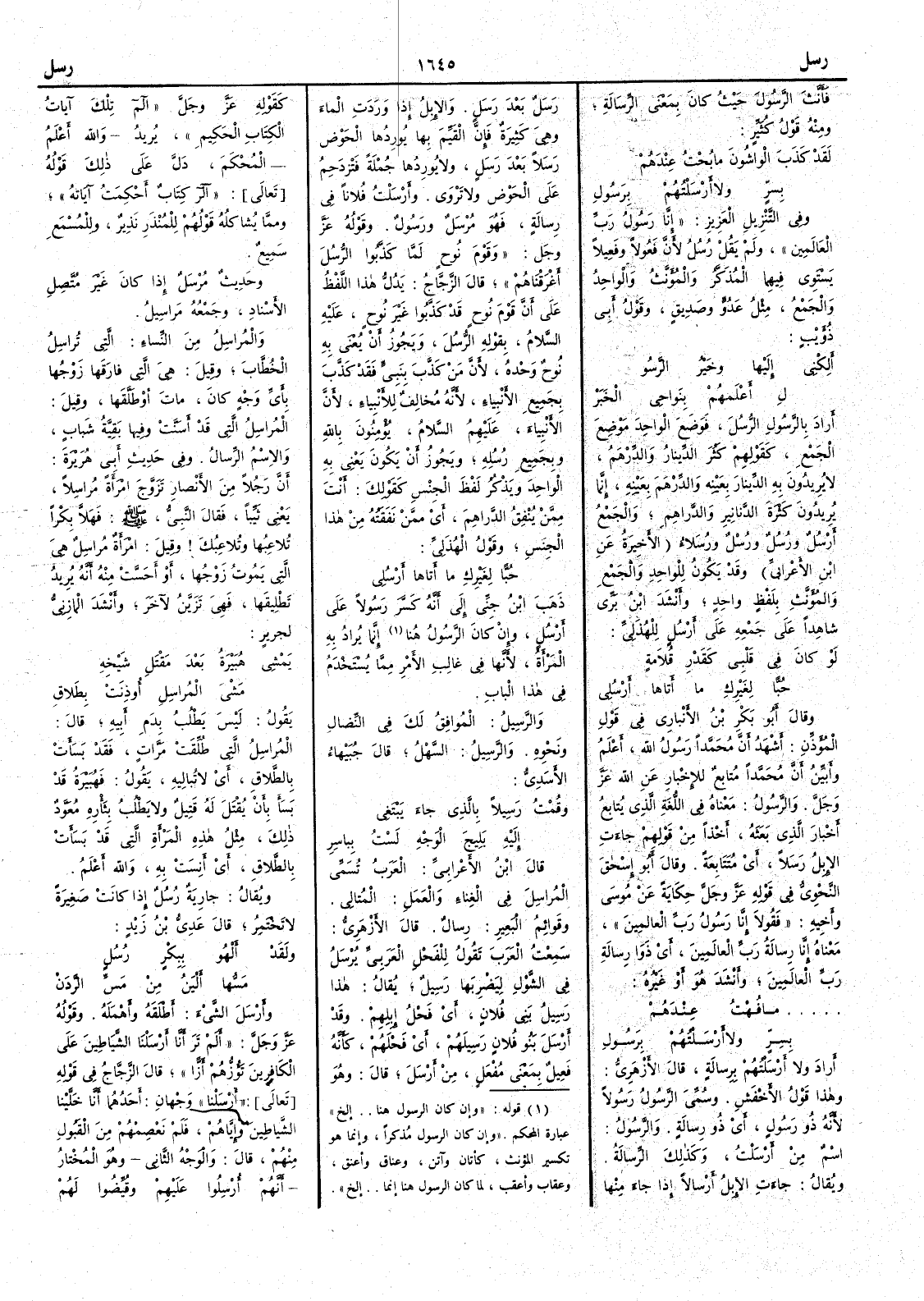 فأَنت الرَّسول حيث كان بمعنى الرِّسالة ومنه قول كثيِّر لقد كَذَب الواشُون ما بُحتُ عندهم بسِرٍّ ولا أَرْسَلْتهم برَسُول وفي التنزيل العزيز إِنَّا رَسُول رب العالمين ولم يقل رُسُل لأَن فَعُولاً وفَعِيلاً يستوي فيهما المذكر والمؤنث والواحد والجمع مثل عَدُوٍّ وصَدِيق وقول أَبي ذؤيب أَلِكْني إِليها وخَيْرُ الرَّسو ل أَعْلَمهُم بنواحي الخَبَر أَراد بالرَّسول الرُّسُل فوضع الواحد موضع الجمع كقولهم كثر الدينار والدرهم لا يريدون به الدينار بعينه والدرهم بعينه إِنما يريدون كثرة الدنانير والدراهم والجمع أَرْسُل ورُسُل ورُسْل ورُسَلاء الأَخيرة عن ابن الأَعرابي وقد يكون للواحد والجمع والمؤنث بلفظ واحد وأَنشد ابن بري شاهداً على جمعه على أَرْسُل للهذلي لو كان في قلبي كقَدْرِ قُلامة حُبًّا لغيرك ما أَتاها أَرْسُلي وقال أَبو بكر بن الأَنباري في قول المؤذن أَشهد أَن محمداً رسول الله أَعلم وأُبَيِّن أَن محمداً مُتابِعٌ للإِخبار عن الله عز وجل والرَّسول معناه في اللغة الذي يُتابِع أَخبار الذي بعثه أَخذاً من قولهم جاءت الإِبل رَسَلاً أَي متتابعة وقال أَبو إِسحق النحوي في قوله عز وجل حكاية عن موسى وأَخيه فقُولا إِنَّا رسول رب العالمين معناه إِنا رِسالة رَبّ العالمين أَي ذَوَا رِسالة رب العالمين وأَنشد هو أَو غيره ما فُهْتُ عندهم بسِرٍّ ولا أَرسلتهم برَسول أَراد ولا أَرسلتهم برِسالة قال الأَزهري وهذا قول الأَخفش وسُمِّي الرَّسول رسولاً لأَنه ذو رَسُول أَي ذو رِسالة والرَّسول اسم من أَرسلت وكذلك الرِّسالة ويقال جاءت الإِبل أَرسالاً إِذا جاء منها رَسَلٌ بعد رَسَل والإِبل إِذا وَرَدت الماء وهي كثيرة فإِن القَيِّم بها يوردها الحوض رَسَلاً بعد رَسَل ولا يوردها جملة فتزدحم على الحوض ولا تَرْوَى وأَرسلت فلاناً في رِسالة فهو مُرْسَل ورَسول وقوله عز وجل وقومَ نوح لما كَذَّبوا الرُّسُل أَغرقناهم قال الزجاج يَدُلُّ هذا اللفظ على أَن قوم نوح قد كَذَّبوا غير نوح عليه السلام بقوله الرُّسُل ويجوز أَن يُعْنى به نوح وحده لأَن من كَذَّب بنبيٍّ فقد كَذَّب بجميع الأَنبياء لأَنه مخالف للأَنبياء لأَن الأَنبياء عليهم السلام يؤمنون بالله وبجميع رسله ويجوز أَن يكون يعني به الواحد ويذكر لفظ الجنس كقولك أَنت ممن يُنْفِق الدراهم أَي ممن نَفَقَتُه من هذا الجنس وقول الهذلي حُبًّا لغيرك ما أَتاها أَرْسُلي ذهب ابن جني إِلى أَنه كَسَّر رسولاً على أَرْسُل وإِن كان الرسول هنا إِنما يراد به المرأَة لأَنها في غالب الأَمر مما يُسْتَخْدَم في هذا الباب والرَّسِيل المُوافِق لك في النِّضال ونحوه والرَّسِيل السَّهْل قال جُبَيْهاء الأَسدي وقُمْتُ رَسِيلاً بالذي جاء يَبْتَغِي إِليه بَلِيجَ الوجه لست بِباسِر قال ابن الأَعرابي العرب تسمي المُراسِل في الغِناء والعَمل المُتالي وقوائم البعير رِسالٌ قال الأَزهري سمعت العرب تقول للفحل العربي يُرْسَل في الشَّوْل ليضربها رَسِيل يقال هذا رَسِيل بني فلان أَي فحل إِبلهم وقد أَرْسَل بنو فلان رَسِيلَهم أَي فَحْلهم كأَنه فَعِيل بمعنى مُفْعَل من أَرْسَل قال وهو كقوله عز وجل أَلم تلك آيات الكتاب الحكيم يريد والله أَعلم المُحْكَم دَلَّ على ذلك قوله الر كتاب أُحْكِمَتْ آياته ومما يشاكله قولهم للمُنْذَرِ نَذير وللمُسْمَع سَمِيع وحديثٌ مُرْسَل إِذا كان غير متصل الأَسناد وجمعه مَراسيل والمُراسِل من النساء التي تُراسِل الخُطَّاب وقيل هي التي فارقها زوجها بأَيِّ وجه كان مات أَو طلقها وقيل المُراسِل التي قد أَسَنَّتْ وفيها بَقِيَّة شباب والاسم الرِّسال وفي حديث أَبي هريرة أَن رجلاً من الأَنصار تزوَّج امرأَة مُراسِلاً يعني ثَيِّباً فقال النبي صلى الله عليه وسلم فهَلاَّ بِكْراً تُلاعِبُها وتلاعِبك وقيل امرأَة مُراسِل هي التي يموت زوجها أَو أَحَسَّت منه أَنه يريد تطليقها فهي تَزَيَّنُ لآخر وأَنشد المازني لجرير يَمْشِي هُبَيرةُ بعد مَقْتَل شيخه مَشْيَ ا