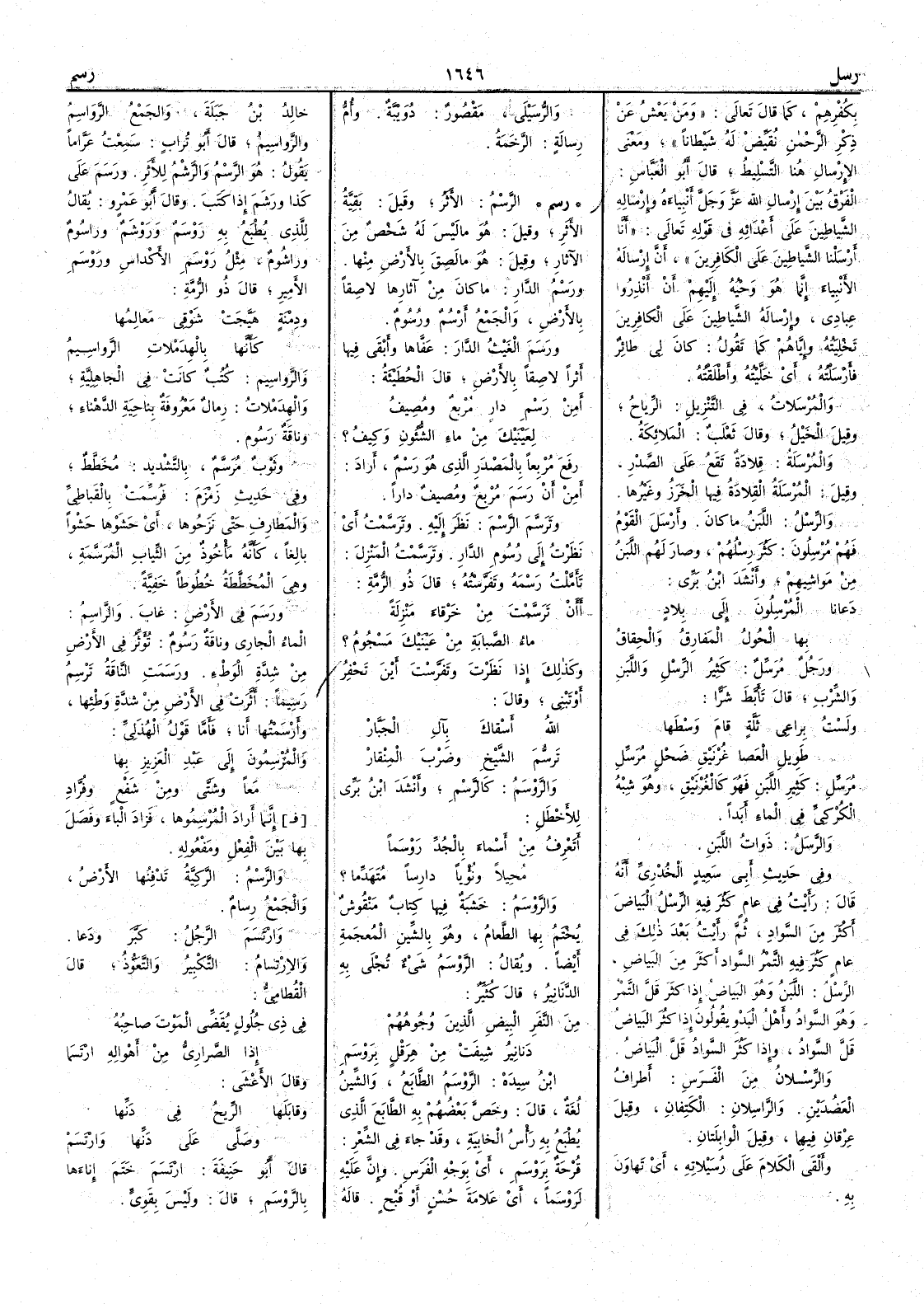 بكفرهم كما قال تعالى ومن يَعْشُ عن ذكر الرحمن نُقَيِّضْ له شيطاناً ومعنى الإِرسال هنا التسليط قال أَبو العباس الفرق بين إِرسال الله عز وجل أَنبياءه وإِرْساله الشياطين علىأَعدائه في قوله تعالى أَنا أَرسلنا الشياطين على الكافرين أَن إِرساله الأَنبياء إِنما هو وَحْيُه إِليهم أَن أَنذِروا عبادي وإِرساله الشياطينَ على الكافرين تَخْلِيَتُه وإِياهم كما تقول كان لي طائر فأَرْسَلْته أَي خليته وأَطلقته والمُرْسَلات في التنزيل الرياح وقيل الخَيْل وقال ثعلب الملائكة والمُرْسَلة قِلادة تقع على الصدر وقيل المُرْسَلة القِلادة فيها الخَرَزُ وغيرها والرِّسْل اللَّبن ما كان وأَرْسَل القومُ فهم مُرْسلون كَثُر رِسْلُهم وصار لهم اللبن من مواشيهم وأَنشد ابن بري دعانا المُرْسِلون إِلى بِلادٍ بها الحُولُ المَفارِقُ والحِقاق ورَجُلٌ مُرَسِّلٌ كثير الرِّسْل واللبن والشِّرْب قال تأَبَّط شَرًّا ولست براعي ثَلَّةٍ قام وَسْطَها طوِيل العصا غُرْنَيْقِ ضَحْلٍ مُرَسِّل مُرَسِّل كثير اللبن فهو كالغُرْنَيْق وهو شبه الكُرْكِيّ في الماء أَبداً والرَّسَلُ ذوات اللبن وفي حديث أَبي سعيد الخُدْري أَنه قال رأَيت في عام كثر فيه الرِّسْل البياضَ أَكثر من السَّواد ثم رأَيت بعد ذلك في عام كثر فيه التمر السَّوادَ أَكثر من البياض الرِّسْل اللبن وهو البياض إِذا كَثُر قَلَّ التَّمْر وهو السَّواد وأَهل البَدْو يقولون إِذا كثر البياض قَلَّ السواد وإِذا كثر السواد قَلَّ البياض والرِّسْلان من الفرس أَطراف العضدين والراسِلان الكَتِفان وقيل عِرْقان فيهما وقيل الوابِلَتان وأَلقَى الكلامَ على رُسَيْلاته أَي تَهاوَن به والرُّسَيْلي مقصور دُوَيْبَّة وأُمُّ رِسالة الرَّخَمة