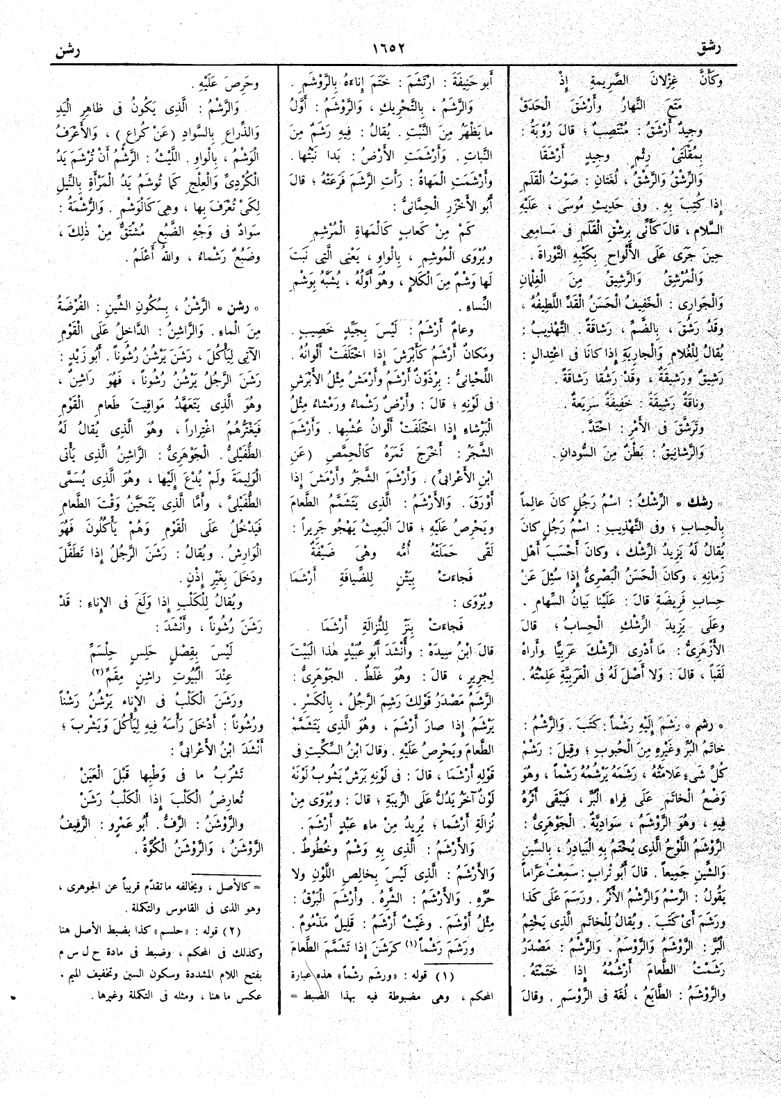 ( رشك ) الرِّشك اسم رجل كان عالماً بالحساب وفي التهذيب اسم رجل كان يقال له يَزِيد الرِّشْك وكان أَحسب أَهل زمانه وكان الحسن البصري إذا سئل عن حساب فريضة قال علينا بيان السِّهام وعلى يَزِيد الرِّشْك الحساب قال الأزهري ما أدري الرِّشْكَ عربياً وأَراه لقباً قال ولا أَصل له في العربية عَلِمته ( رشم ) رَشَمَ إليه رَشْماً كتب والرَّشْم خاتم البُر وغيره من الحبوب وقيل رَشْمُ كل شيء علامته رَشَمَهُ يَرْشُمِهُ رَشْماً وهو وضع الخاتم على فراء البُر فيبقى أََثره فيه وهو الرَّوْشَمُ سوادية الجوهري الروشم اللوح الذي يختم به البَيادر بالسين والشين جميعاً قال أبو تراب سمعت عَرَّاماً يقول الرَّسْمُ والرَّشْمُ الأَثَرُ ورَسَمَ على كذا ورَشَمَ أي كتب ويقال للخاتم الذي يختم البُرَّ الرَّوْشَمُ والرَّوْسَمُ والرَّشْم مصدر رَشَمْتُ الطعام أَرْشُمُهُ إذا ختمته والرَّوْشَمُ الطابَعُ لغة في الرَوْسَمِ وقال أبو حنيفة ارْتَشَمَ ختم إناءه بالرَّوْشَم والرَّشَمُ بالتحريك والرَّوْشَم أوَّل ما يظهر من النبت يقال فيه رَشَمٌ من النبات وأَرْشَمَتِ الأرضُ بدا نبتها وأَرْشَمَتِ المَهاةُ رأَت الرَّشَمَ فَرَعَتْهُ قال أبو الأَخْزَر الحماني كم من كَعابٍ كالمَهاة المُرْشِمِ ويروى المُوشِم بالواو يعني التي نبت لها وَشْمٌ من الكَلإ وهو أوّله يشبَّه بوَشْمِ النساء وعامٌ أَرْشَمُ ليس بجَيّد خَصيب ومكان أَرْشَمُ كأبْرَشَ إذا اختلفت أَلوانه اللحياني بِرْذَوْن أرْشَمُ وأرْمَشُ مثل الأبْرَشِ في لونه قال وأرض رَشْماءُ ورَمْشاء مثل البَرْشاء إذا اختلفت ألوان عُشْبها وأَرْشَمَ الشجرُ أَخرج ثمره كالحمص عن ابن الأعرابي وأرْشَمَ الشجرُ وأرْمَشَ إذا أَورق والأَرْشَمُ الذي يتشَمَّمُ الطعام ويحرص عليه قال البَعِيثُ يهجو جَريراً لَقًى حملتهُ أمُّه وهي ضَيْفَةٌ فجاءَتْ بيَتْنٍ للضِّيافة أَرْشَما ويروى فجاءت بنَزٍّ للنُّزالة أَرْشَما قال ابن سيده وأنشد أبو عبيد هذا البيت لجرير قال وهو غلط الجوهري الرَّشَمُ مصدر قولك رَشِمَ الرجلُ بالكسر يَرْشَمُ إذا صار أَرْشَمَ وهو الذي يتشمَّمُ الطعام ويحرص عليه وقال ابن السكيت في قوله أَرْشَما قال في لونه بَرَشٌ يشوب لونَه لون آخر يدل على الريبة قال ويروى من نُزالة أرْشَما يريد من ماء عبدٍ أَرْشَمَ والأَرْشَم الذي به وَشْمٌ وخطوط والأَرْشَمُ الذي ليس بخالص اللون ولا حُرِّهِ والأرْشَمُ الشَّرِهُ وأَرْشَمَ البرقُ مثل أَوْشَمَ وغيث أرْشَم قليل مذموم ورَشَمَ رَشْماً
