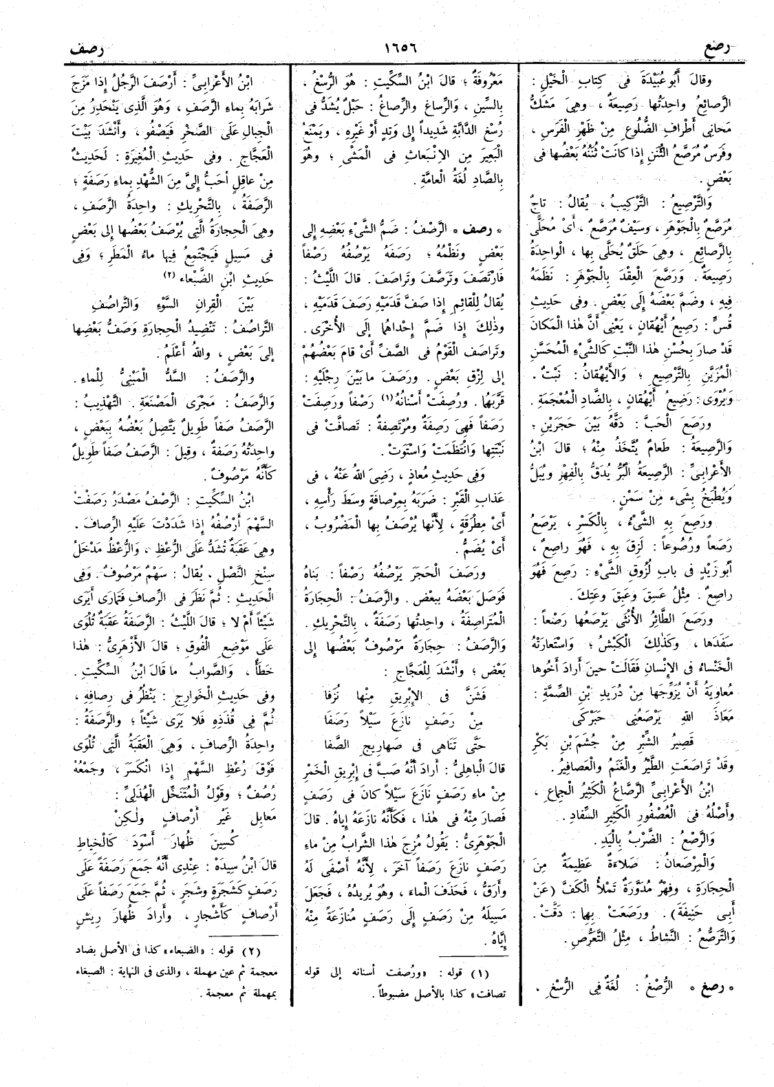 ( * قوله « ورصفت أسنانه إلى قوله تصافت » كذا بالأصل مضبوطاً ) رَصْفاً ورَصِفَتْ رَصَفاً فهي رصِفَةٌ ومُرْتَصِفةٌ تَصافَّتْ في نبْتَتِها وانْتَظَمَتْ واستوت وفي حديث معاذ رضي اللّه عنه في عذاب القبر ضَرَبه بمِرْصافةٍ وسَط رأْسه أَي مِطْرَقَةٍ لأَنها يُرْصَفُ بها المضروب أَي يُضَمُّ ورَصَفَ الحجرَ يَرْصفُهُ رَصْفاً بناه فوَصَل بعضَه ببعض والرَّصَفُ الحِجارة المُتراصِفةُ واحدتها رَصَفةٌ بالتحريك والرَّصَفُ حجارةٌ مَرْصُوفٌ بعضُها إلى بعضٍ وأَنشد للعجاج فَشَنَّ في الإبْريقِ منها نُزَفا منْ رَصَفٍ نازَعَ سَيْلاً رَصَفا حتى تَناهى في صَهاريجِ الصَّفا قال الباهلي أَراد أَنه صَبَّ في إبْريقِ الخمر من ماءِ رَصَفٍ نازَعَ سَيْلاً كان في رصَفٍ فصار منه في هذا فكأَنَّه نازعه إياه قال الجوهري يقول مُزِجَ هذا الشرابُ من ماء رصَفٍ نازَعَ رصَفاً آخَرَ لأَنه أَصْفى له وأَرَقُّ فَحذَف الماء وهو يُريدُه فجَعل مَسِيلَه من رَصَفٍ إلى رصف مُنازَعةً منه إياه ابن الأعرابي أَرْصَفَ الرجلُ إذا مَزَجَ شرابَه بماء الرَّصَفِ وهو الذي ينحدر من الجبال على الصخر فيَصْفُو وأَنشد بيت العجاج وفي حديث المغيرة لحَديثٌ من عاقِلٍ أَحَبُّ إليَّ من الشُّهْدِ بماء رَصَفةٍ الرَّصَفةُ بالتحريك واحدة الرَّصَفِ وهي الحجارة التي يُرْصَفُ بعضها إلى بعض في مَسِيل فيجتمع فيها ماء المطر وفي حديث ابن الضَّبْعاء