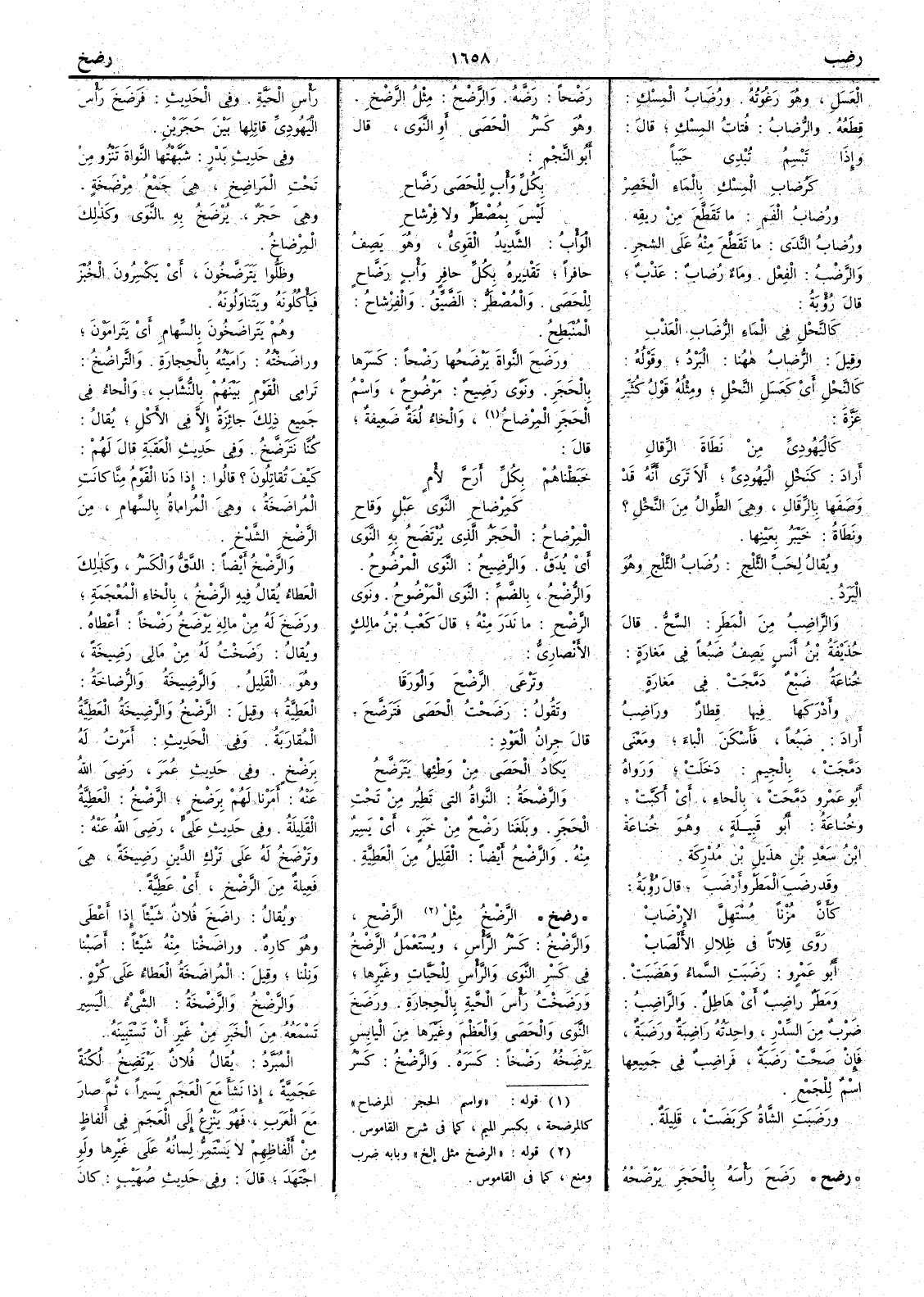 ( * قوله « الرضخ مثل إلخ » وبابه ضرب ومنه كما في القاموس ) الرَّضْح والرَّضْخُ كسر الرأْس ويستعمل الرَّضْخُ في كسر النَّوَى والرأْس للحيات وغيرها وَرَضَخْتُ رأْسَ الحية بالحجارة ورَضَخ النوى والحصى والعظم وغيرها من اليابس يَرْضَخُه رضخاً كسره والرَّضْخُ كسر رأس الحية وفي الحديث فَرَضَخ رأْسَ اليهودي قاتِلها بين حجرين وفي حديث بدر شَبَّهْتُها النواةَ تَنْزُو من تحت المَراضِخ هي جمع مِرْضَخَة وهي حجر يُرْضَخ به النوى وكذلك المِرْضاخُ وظَلُّوا يَتَرَضَّخُون أَي يكسرون الخُبْز فيأْكلونه ويتناولونه وهم يَتراضَخُون بالسهام أَي يَتَرامَوْنَ وراضَخْته رَامَيْتُه بالحجارة والتَّراضُخُ تَرامِي القوم بينهم بالنُّشَّاب والحاء في جميع ذلك جائزة إِلا غي الأَكل يقال كنا نَتَرضَّخُ وفي حديث العَقَبةِ قال لهم كيف تقاتلون ؟ قالوا إذا دنا القومُ منا كانت المُراضَخَةُ وهي المراماة بالسهام من الرَّضْخِ الشَّدْخ والرَّضْخُ أَيضاً الدَّقُّ والكسر وكذلك العطاء يقال فيه الرَّضْخُ بالخاء المعجمة ورَضَخَ له من ماله يَرْضَخُ رَضْخاً أَعطاه ويقال رَضَخْت له من مالي رَضِيخَةً وهو القليل والرَّضِيخةُ العطية المُقارَبة وفي الحديث أَمَرْتُ له برَضْخٍ وفي حديث عمر رضي الله عنه أَمرنا لهم برَضْخٍ الرَّضْخُ العطية القليلة وفي حديث علي رضي الله عنه وتَرْضَخُ له على ترك الدِّينِ رَضِيخَةً هي فعيلة من الرَّضْخ أَي عطيةً ويقال راضَخَ فلانٌ شيئاً إِذا أَعطى وهو كاره وراضَخْنا منه شيئاً أَصبنا ونلنا وقيل المراضَخة العطاء على كُرْه والرَّضْخُ والرَّضْخة الشيء اليسير تسمعه من الخَبَر من غير أَن تَسْتَبينه المبرد يقال فلان يَرْتَضِخُ لُكْنَةً عجميةً إِذا نشأَ مع العجم يسيراً ثم صار مع العرب فهو يَنْزِعُ إِلى العجم في أَلفاظ من أَلفاظهم لا يستمر لسانه على غيرها ولو اجتهد قال وفي حديث صُهَيب كان