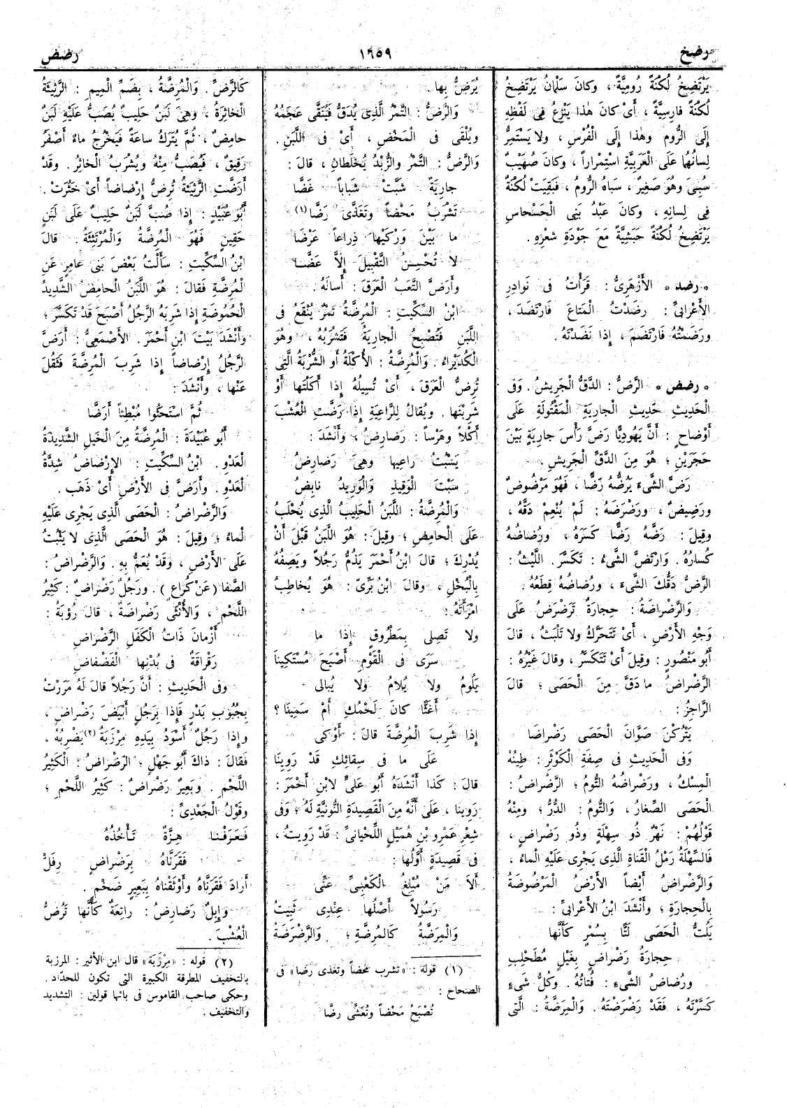 ما بَيْنَ ورْكَيْها ذِراعاً عَرْضا لا تُحْسِنُ التَّقْبِيلَ إِلا عَضّا وأَرَضَّ التعَبُ العرَقَ أَساله ابن السكيت المُرِضّةُ تمر ينقع في اللبن فتُصبح الجارية فتشربه وهو الكُدَيْراءُ والمُرِضّةُ الأُكْلةُ أَو الشُّرْبةُ التي تُرِضُّ العرق أَي تسيله إِذا أَكلتها أَو شربتها ويقال للراعية إِذا رَضَّتِ العُشْب أَكلاً وهرْساً رَضارِضُ وأَنشد يَسْبُتُ راعِيها وهي رَضارِضُ سَبْتَ الوَقِيذِ والوَرِيدُ نابِضُ والمُرِضّة اللبن الحليب الذي يحلب على الحامض وقيل هو اللبن قبل أَن يُدْرِكَ قال ابن أَحمر يَذُمّ رجلاً ويَصِفُه بالبخل وقال ابن بري هو يخاطب امرأَته ولا تَصِلي بمَطْروقٍ إِذا ما سَرَى في القَوْمِ أَصبحَ مُسْتَكِينا يَلُومُ ولا يُلامُ ولا يُبالي أَغَثّاً كان لَحْمُكِ أَو سَمِينا ؟ إِذا شَرِبَ المُرِضّةَ قال أَوْكي على ما في سِقائِك قد رَوِينا قال كذا أَنشده أَبو عليّ لابن أحمر رَوِينا على أَنه من القصيدة النونية له وفي شعر عمرو بن هميل اللحياني قد رَوِيتُ في قصيدة أَولها أَلا مَنْ مُبْلِغُ الكَعْبيِّ عَنِّي رَسُولاً أَصلُها عِنْدِي ثَبِيتُ والمِرَضَّةُ كالمُرِضّةِ والرَّضْرَضةُ كالرَّضِّ والمُرِضّةُ بضم الميم الرَّثِيئةُ الخاثِرةُ وهي لبن حليب يُصَبُّ عليه لبن حامض ثم يترك ساعة فيخرج ماء أَصفر رقيق فيصب منه ويشرب الخاثر وقد أَرَضَّت الرَّثِيئةُ تُرِضُّ إِرْضاضاً أَي خَثُرَتْ أَبو عبيد إِذا صُبّ لبن حليب على لبن حَقِين فهو المُرِضّةُ والمُرْتَثِئةُ قال ابن السكيت سأَلت بعض بني عامر عن المُرِضّةِ فقال هو اللبن الحامض الشديد الحُموضة إِذا شربه الرجل أَصبح قد تكسّر وأَنشد بيت ابن أَحمر الأَصمعي أَرَضَّ الرجلُ إِرْضاضاً إِذا شرب المُرِضّةَ فثقل عنها وأَنشد ثم اسْتَحَثُّوا مُبْطِئاً أَرَضّا أَبو عبيدة المُرِضّةُ من الخيل الشديدة العَدْوِ ابن السكيت الإِرْضاضُ شدّة العَدْو وأَرَضَّ في الأَرض أَي ذَهَب والرَّضراضُ الحصَى الذي يجري عليه الماءُ وقيل هو الحصى الذي لا يثبت على الأَرض وقد يُعَمّ به والرَّضْراضُ الصَّفا عن كراع ورجل رَضْراضٌ كثير اللحم والأُنثى رَضْراضةٌ قال رؤبة أَزْمان ذَاتُ الكَفَلِ الرَّضْراضِ رَقْراقةٌ في بُدْنِها الفَضْفاضِ وفي الحديث أَن رجلاً قال له مررت بجُبُوبِ بَدْر فإِذا برجل أَبيض رَضْراضٍ وإِذا رجل أَسودُ بيده مِرْزَبةٌ يضربه فقال ذاك أَبو جهل الرّضْراضُ الكثير اللحم وبعير رَضْراضٌ كثير اللحم وقول الجعدي فَعَرَفْنا هِزّةً تأْخُذُه فَقَرَنّاه بِرَضْراضِ رِفَلْ أَراد فقرناه وأَوثقناه ببعير ضخم وإِبل رَضارِضَ راتعة كأَنها تَرُضّ العُشب