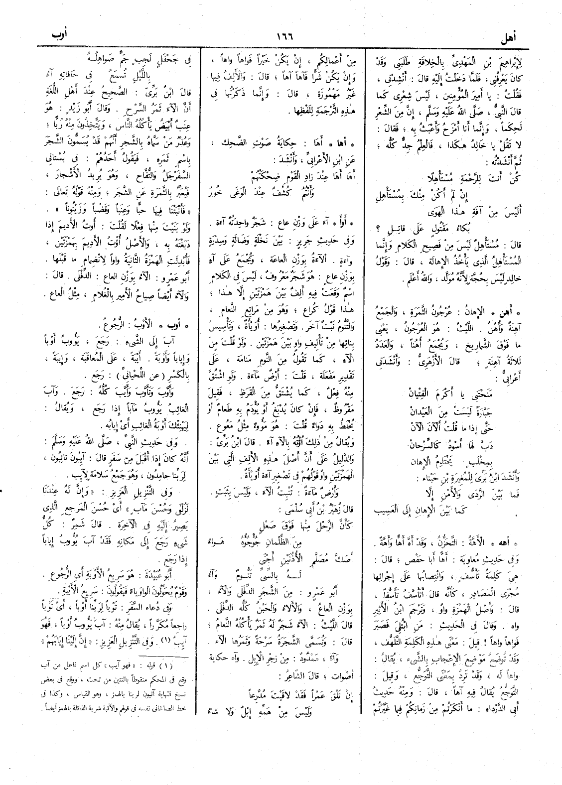 ( أوأ ) آءَ على وزن عاع شجر واحدته آءة وفي حديث جرير بين نَخْلة وضَالَة وسِدْرة وآءة الآءة بوزن العاعَة وتُجمع على آءٍ بوزنِ عاعٍ هوشجرٌ معروفٌ ليس في الكلامِ اسمٌ وقعَت فيهِ الفٌ بين هَمزتين إِلاَّ هذا هذا قولُ كراع وهو من مَراتِعِ النَّعامِ والتنُّومُ نبتٌ آخر وتصغيرها أُوَيْأَةٌ وتأسيسُ بِنَائها من تأْليفِ واوٍ بينَ همزتين ولو قلتَ من الآءِ كما تقول من النَّومِ مَنامةٌ على تقديرِ مَفعلةٌ قلت أَرض مآءة ولو اشتُقَّ منهُ فعلٌ كما يُشْتَقُّ من القرظِ فقيلَ مقروظٌ فان كان يدبغُ أَو يؤدمُ به طعامٌ أَو يخلطُ به دواءٌ قلتَ هو مَؤُوءٌ مثل مَعُوع ويقال من ذلك أؤْتُهُ بالآءآ أً ( 1 )