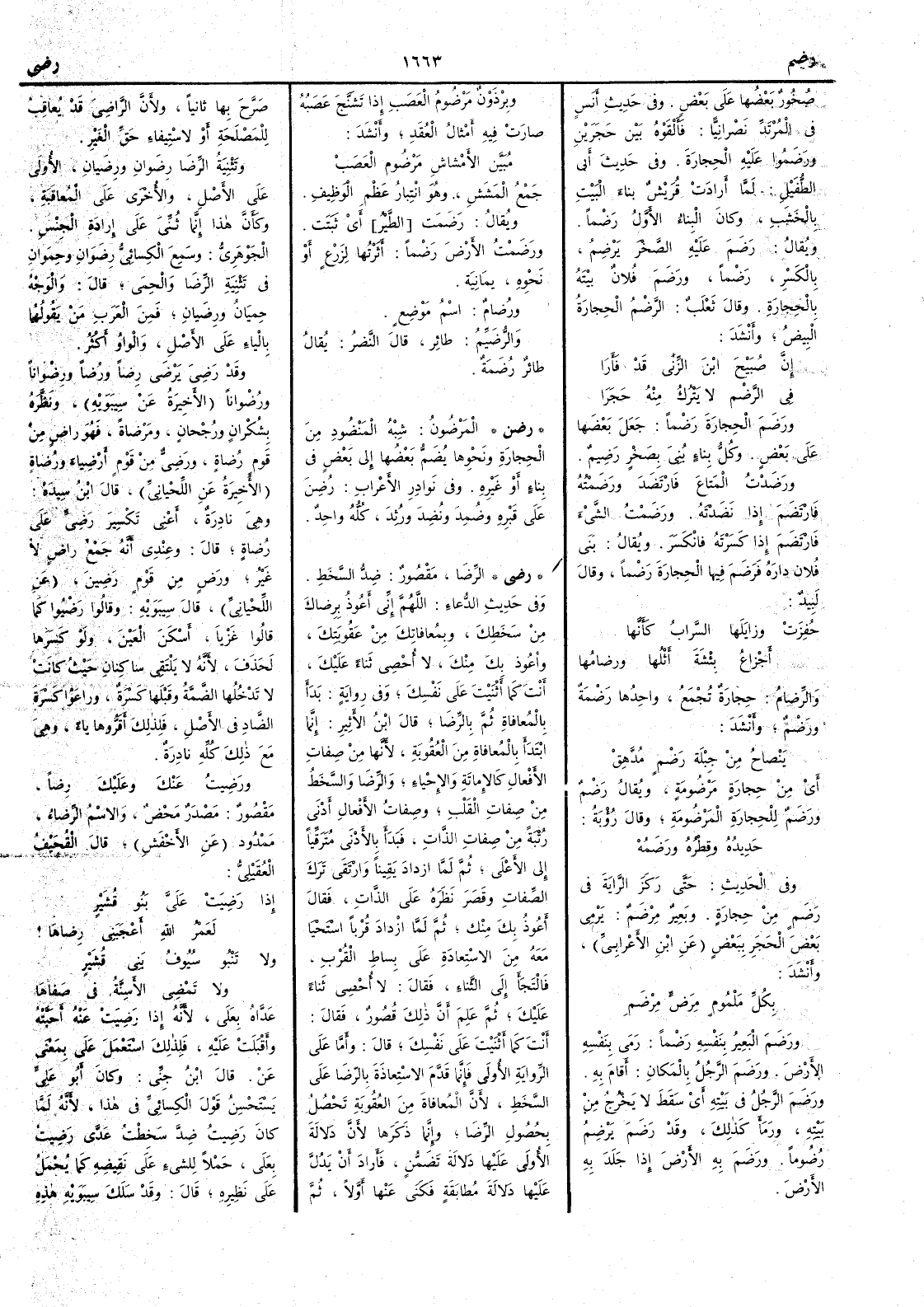 ( رضن ) المَرْضونُ شِبْه المَنْضُود من الحجارة ونحوها يضم بعضها إلى بعض في بناء أَو غيره وفي نوادر الأَعراب رُضِنَ على قبره وضُمِدَ ونُضِدَ ورُثِدَ كله واحد ( رضي ) الرِّضا مقصورٌ ضدُّ السَّخَطِ وفي حديث الدعاء اللهم إني أَعوذُ برضاكَ من سَخَطِكَ وبمُعافاتِكَ من عُقوبَتِكَ وأَعوذُ بك منك لا أُحْصي ثَناءً عليك أَنت كما أَثْنَيْتَ على نفسك وفي رواية بَدأَ بالمُعافاة ثم بالرّضا قال ابن الأَثير إنما ابتدأَ بالمُعافاة من العقوبة لأَنها من صفات الأَفعال كالإماتة والإحياء والرِّضا والسَّخَطُ من صفات القلب وصفاتُ الأَفعال أَدْنى رُتبةً من صفات الذات فبدأَ بالأَدْنى مُتَرَقِّياً إلى الأَعلى ثم لمَّا ازداد يقيناً وارْتَقى تَرَكَ الصفاتِ وقَصَر نظره على الذات فقال أَعوذ بك منك ثم لمَّا ازداد قرباً اسْتَحيْا معه من الاسْتِعاذة على بساط القُرْب فالْتَجأَ إلى الثَّناءِ فقال لا أُحْصي ثَناءً عليك ثم علم أَن ذلك قُصورٌ فقال أَنت كما أَثْنَيْت على نفسِك قال وأَما على الرواية الأُولى فإنما قدم الاستعاذة بالرِّضا على السَّخَط لأََن المُعافاة من العُقوبة تحصل بحصول الرضا وإنما ذكرها لأَن دلالة الأُولى عليها دلالة تضمن فأَراد أن يدل عليها دلالة مطابقة فكنى عنها أَولاً ثم صرح بها ثانياً ولأَن الراضِيَ قد يعاقِب للمصلحة أَو لاستيفاء حقِّ الغير وتثنية الرِّضا رِضَوانِ ورِضَيانِ الأُولى على الأَصل والأُخرى على المُعاقبة وكأَن هذا إنما ثُنِّيَ على إرادة الجنس الجوهري وسمع الكسائي رِضَوانِ وحِمَوانِ في تثنية الرِّضا والحِمى قال والوجه حِمَيان ورِضَيان فمن العرب من يقولهما بالياء على الأَصل والواو أَكثر وقد رَضِيَ يَرْضى رِضاً ورُضاً ورِضْواناً ورُضْواناً الأَخيرة عن سيبويه ونَظَّرهَ بشُكْران ورُجْحانٍ ومَرْضاةً فهو راضٍ من قوم رُضاةٍ ورَضِيٌّ من قوم أَرْضياءَ ورُضاةٍ الأَخيرة عن اللحياني قال ابن سيده وهي نادرة أَعني تكسير رَضِيٍّ على رُضاةٍ قال وعندي أنه جمع راضٍ لا غير ورَضٍ من قوم رَضِينَ عن اللحياني قال سيبويه وقالوا رَضْيُوا كما قالوا غَزْيا أَسكن العينَ ولو كسرها لحذفَ لأَنه لا يَلْتَقي ساكنان حيث كانت لا تدخلها الضمة وقبلها كسرة وراعَوْا كسرة الضاد في الأَصل فلذلك أَقروها ياء وهي مع ذلك كله نادرة ورَضيتُ عنك وعَلَيْكَ رِضىً مقصورٌ مصدرٌ مَحْضٌ والاسمُ الرِّضاءُ ممدودٌ عن الأَخفش قال القُحَيْفُ العُقَيْلي إذا رَضِيَتْ عَليَّ بَنو قُشَيْرٍ لَعَمْرُ اللهِ أَعْجَبَني رِضاها ولا تَنْبو سُيوفُ بَني قُشَيْرٍ ولا تَمْضي الأَسِنَّةُ في صَفاها عدّاه بعَلى لأَنَّه إذا رَضِيَتْ عنه أَحَبَّتْه وأَقْبَلَت عليه فذلك اسْتَعْمل على بمعنى عَنْ قال ابن جني وكان أَبو عَلِيٍّ يستحسن قول الكسائي في هذا لأَنه لمَّا كان رَضيتُ ضِدَّ سَخِطْت عَدَّى رَضيتُ بعَلى حملاً للشيء على نقيضه كما يُحْمَلُ على نَظيره قال وقد سلك سيبويه هذه