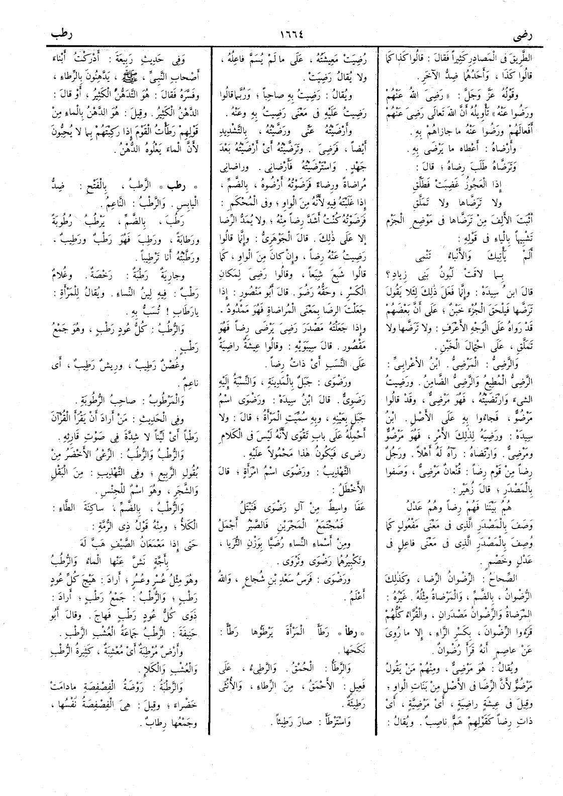 الطريق في المصادر كثيراً فقال قالوا كذا كما قالوا كذا وأَحدُهما ضدُّ الآخرَ وقوله عز وجل رَضِيَ اللهُ عنهم ورضوا عنه تأْويله أَنَّ الله تعالى رَضِيَ عَنْهُم أَفْعالَهم ورضوا عنه ما جازاهم به وأَرْضاهُ أَعْطاهُ ما يَرْضى به وتَرَضّاهُ طَلَب رِضاه قال إذا العَجوزُ غَضِبَتْ فَطَلِّقِ ولا تَرَضّاها ولا تَمَلَّقِ أَثبت الأَلف من تَرَضّاها في موضع الجزم تشبيهاً بالياء في قوله أَلَمْ يَأْتيكَ والأَنْباءُ تَنْمي بما لاقَتْ لَبونُ بَني زِيادِ ؟ قال ابن سيده وإنما فَعَلَ ذلك لَئلاَّ يقول تَرَضَّها فيلْحَقَ الجُزْءَ خَبْنٌ على أَنَّ بعضهم قد رَواه على الوجه الأَعْرَف ولا تَرَضَّها ولا تَمَلَّقِ على احتمال الخَبْن والرَّضِيُّ المَرْضِيُّ ابن الأَعرابي الرَّضِيُّ المُطيعُ والرَّضِيُّ الضّامِنُ ورَضيتُ الشيءَ وارْتَضَيْتُه فهو مَرْضيٌّ وقد قالوا مَرْضُوٌّ فجاؤوا به على الأَصْل ابن سيده ورَضِيَهُ لذلك الأَمْر فهو مَرْضُوٌّ ومَرْضِيٌّ وارْتَضاه رآه لَهُ أَهْلاً ورجلٌ رِضىً من قَوْمٍ رضىً قُنْعانٌ مَرْضِيٌّ وصَفوا بالمَصْدر قال زهير هُمُ بَيْنَنا فَهُمْ رِضىً وهُمُ عَدْلُ وصَفَ بالمصدر الذي في مَعْنى مَفْعول كما وُصِفَ بالمَصْدر الذي في مَعْنى فاعِلٍ في عَدْلٍ وخَصْمٍ الصحاح الرِّضْوانُ الرِّضا وكذلك الرُّضْوانُ بالضم والمَرْضاةُ مثلهُ غَيره المَرْضاةُ والرِّضْوان مصدران والقُرّاء كلهم قَرَؤُوا الرِّضْوانَ بكسر الراء إلاَّ ما رُوِي عن عاصم أَنه قرأَ رُضْوان ويقال هو مَرْضِيٌّ ومنهم من يقول مَرْضُوٌّ لأَن الرِّضا في الأَصل من بنات الواو وقيل في عيشَةٍ راضِيَة أَي مَرْضِيَّة أَي ذات رضىً كقولهم هَمٌّ ناصِبٌ ويقال رُضِيَتْ مَعيشَتهُ على ما لم يُسَمَّ فاعلهُ ولا يقال رَضِيَتْ ويقال رَضيتُ به صاحِباً وربما قالوا رَضيتُ علَيْه في معنَى رَضِيتُ به وعنه وأَرْضَيْتُه عَنِّي ورَضَّيْته بالتشديد أَيضاً فَرَضي وتَرَضَّيته أَي أَرْضَيْته بعد جَهْدٍ واستَرْضَيْتُه فأَرْضاني وراضاني مُراضاةً ورِضاءً فَرَضَوْتُه أَرْضوهُ بالضم إذا غَلَبْتَه فيه لأَنه من الواو وفي المحكم فرضَوْتُه كنت أَشدَّ رِضاً منه ولا يُمَدُّ الرضا إلا على ذلك قال الجوهري وإنما قالوا رَضيتُ عنه رِضاً وإن كان من الواو كما قالوا شَبِعَ شِبَعاً وقالوا رَضِيَ لِمكان الكسر وحَقُّه رَضُوَ قال أَبو منصور إذا جعلت الرِّضى بمعنى المُراضاةِ فهو ممدود وإذا جعلته مصدَرَ رَضِي يَرْضَى رِضىً فهو مقصور قال سيبويه وقالوا عيشَة راضِيةَ على النَّسب أَي ذات رِضاً ورَضْوى جَبَل بالمَدينة والنِّسْبة إليه رَضَوي قال ابن سيده ورَضْوى اسم جبل بعينه وبه سميت المرأَةُ قال ولا أَحمله على باب تَقْوَى لأَنه ليس في الكلام ر ض ي فيكون هذا محمولاً عليه التهذيب ورَضْوى اسم امرأَة قال الأَخطل عفَا واسِطٌ مِنْ آلِ رَضْوى فَنَبْتَلُ فَمُجْتَمَعُ المَجْرَيْنِ فالصَّبْرُ أَجْمَلُ ومن أَسماء النساء رُضَيّا بوزن الثُّرَيّا وتكبيرهما رَضْوى وثَرْوى ورَضْوى فَرَس سعد بن شجاع والله أَعلم