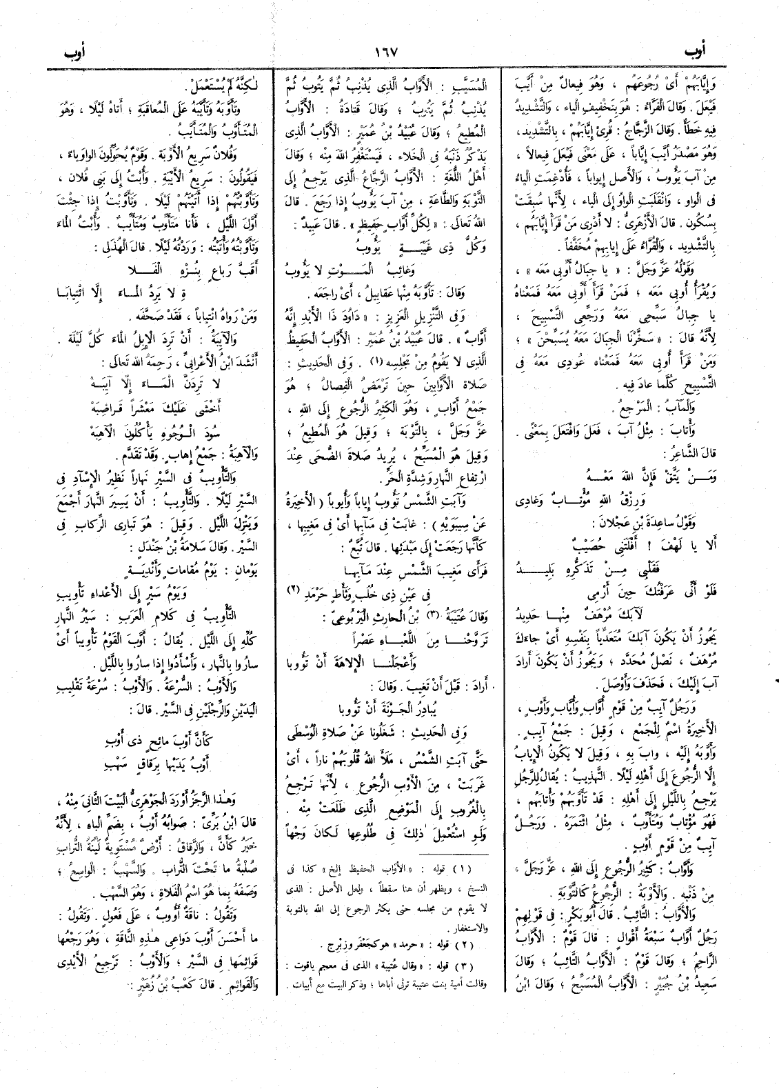 أَراد قيل أَن تَغِيبَ وقال يُبادِرُ الجَوْنَةَ أَن تَؤُوبا وفي الحديث شَغَلُونا عن صَلاَةِ الوُسْطى حتى آبَتِ الشمسُ مَلأَ اللّهُ قُلوبهم ناراً أَي غَرَبَتْ من الأَوْبِ الرُّجوعِ لأَنها تَرجِعُ بالغروب إِلى الموضع الذي طَلَعَتْ منه ولو اسْتُعْمِلَ ذلك في طُلوعِها لكان وجهاً لكنه لم يُسْتَعْمَلْ وتَأَوَّبَه وتَأَيَّبَه على المُعاقَبةِ أَتاه ليلاً وهو المُتَأَوَّبُ والمُتَأَيَّبُ وفلان سَرِيع الأَوْبة وقوم يُحوِّلون الواو ياء فيقولون سريع الأَيْبةِ وأُبْتُ إِلى بني فلان وتَأَوَّبْتُهم إِذا أَتيتَهم ليلاً وتَأَوَّبْتُ إِذا جِئْتُ أَوّل الليل فأَنا مُتَأَوِّبٌ ومُتَأَيِّبٌ وأُبْتُ الماءَ وتَأَوَّبْتُه وأْتَبْتُه وردته ليلاً قال الهذليُّ