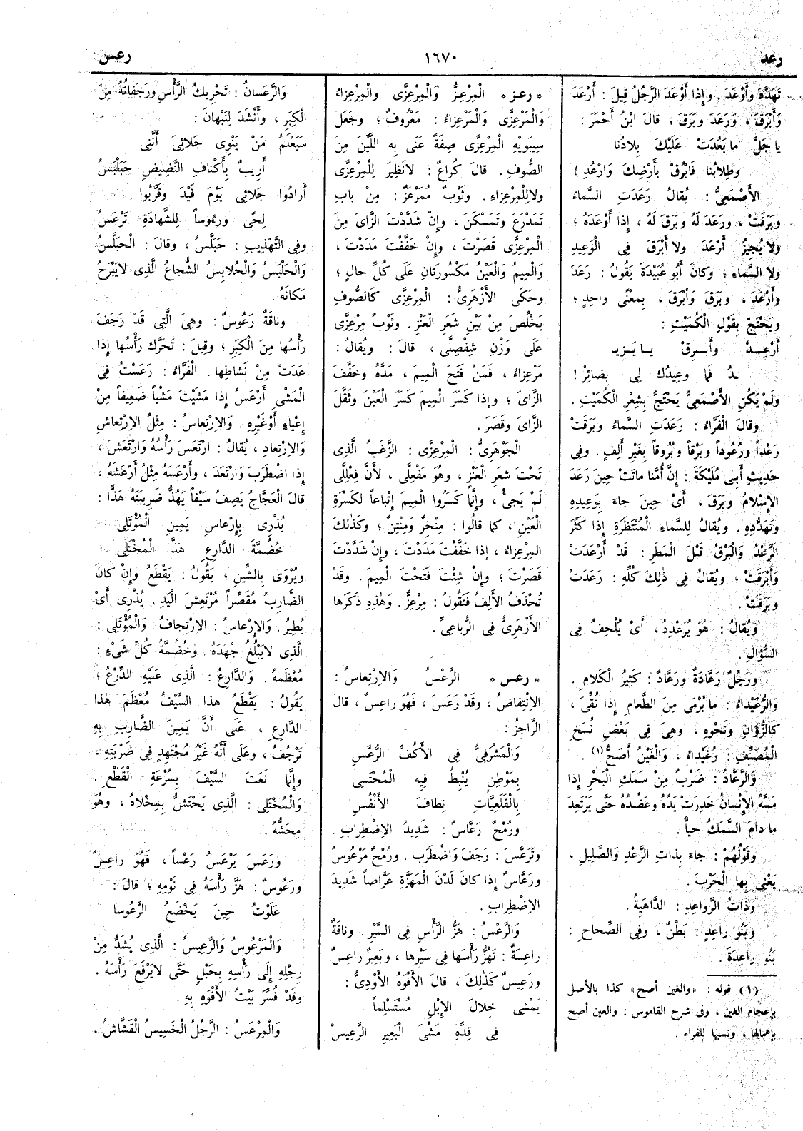 ( رعز ) المِرْعِزُّ والمِرْعِزَّى والمِرْعِزاءُ والمَرْعِزَّى والمَرْعِزَاءُ معروف وجعل سيبويه المِرْعِزَّى صفة عنى به اللَّيِّنَ من الصوف قال كراع لا نظير للمِرْعِزَّى ولا للمِرْعِزاءِ وثوب مُمَرْعَزٌ من باب تَمَدْرَعَ وتَمَسْكَنَ وإِن شدَّدت الزاي من المِرْعِزَّى قَصَرْتَ وإِن خففت مددت والميم والعين مكسورتان على كل حال وحكى الأَزهري المِرْعِزَّى كالصوف يخلص من بين شعر العَنْزِ وثوب مِرْعِزَّى على وزن شِفْصِلَّى قال ويقال مَرْعِزاءُ فمن فتح الميم مدّه وخفف الزاي وإِذا كسر الميم كسر العين وثقل الزاي وقصر الجوهري المِرْعِزَّى الزَّغَبُ الذي تحت شعر العنز وهو مَفْعِلَّى لأَن فَعْلِلَّى لم يجئ وإِنما كسروا الميم إِتباعاً لكسرة العين كما قالوا مِنْخِر ومِنْتِن وكذلك المِرْعِزاءُ إِذا خففت مددت وإِن شددت قصرت وإِن شئت فتحت الميم وقد تحذف الأَلف فتقول مِرْعِزٌّ وهذه ذكرها الأَزهري في الرباعي ( رعس ) الرَّعْسُ والارْتِعاس الانْتِفاض وقد رَعَسَ فهو راعِسٌ قال الراجز والمَشْرَفيُّ في الأَكُفِّ الرُّعَّسِ بمَوْطِنٍ يُنْبِطُ فيه المُحْتَسِي بالقَلَعِيَّاتِ نِطافَ الأَنْفُسِ ورمح رَعَّاسٌ شديد الاضطراب وتَرَعَّس رَجَفَ واضطرب ورمح مَرْعُوس ورَعَّاس إِذا كان لَدْنَ المَهَزَّة عَرَّاصاً شديد الاضطراب والرَّعْسُ هَزُّ الرأْس في السير وناقة راعِسَة تَهُزُّ رأْسها في سيرها وبعير راعِسٌ ورَعِيسٌ كذلك قال الأَفوَه الأَوْديّ يَمْشي خِلالَ الإَِبْلِ مُسْتَسْلِماً في قِدِّهِ مَشْيَ البَعيرِ الرَّعِيسْ والرَّعَسانُ تحريك الرأْس ورَجَفانهُ من الكِبَر وأَنشد لنَبْهانَ سَيَعْلَمُ مَنْ يَنْوي جَلائي أَنني أَريبٌ بأَكْنافِ النَّضِيضِ حَبَلْبَسُ أَرادوا جلائي يومً فَيْدَ وقَرَّبوا لِحًى ورُؤُوساً للشهادةِ تَرْعَسُ وفي التهذيب حَبَلَّسُ وقال الحَبَلَّسُ والحَلْبَسُ والحُلابسُ الشجاع الذي لا يبرح مكانه وناقة رَعُوسٌ وهي التي قد رَجَف رأَسُها من الكِبَر وقيل تحرَّك رأْسها إِذا عَدَتْ من نَشاطها الفراء رَعَسْتُ في المشي أَرْعَسُ إِذا مشيت مشياً ضعيفاً من إِعْياء أَو غيره والارْتِعاسُ مثلُ الارتِعاش والارْتِعادِ يقال ارْتَعَسَ رأْسه وارْتَعَشَ إِذا اضْطرب وارْتَعَدَ وأَرْعَسَه مثل أَرْعَشَة قال العجاج يصف سيفاً يَهُذُّ ضَريبَتَه هَذّاً يُذْري بإِرْعاسِ يَمينِ المُؤْتَلي خُضُمَّةَ الدَّارِع هَّذَّ المُخْتَلي ويروى بالشين يقول يقطع وإِن كان الضارب مُقَصِّراً مُرْتَعِشَ اليدِ يُذْري أَي يُطِير والإِرْعاسُ الارْتِجافُ والمُؤْتَلي الذي لا يبلغ جُهْدَه وخُضُمَّةُ كل شيء معظمُه والدَّارِعُ الذي عليه الدِّرْعُ يقول يقطع هذا السيفُ مُعْظَمَ هذا الدارع على أَن يمين الضارب به تَرْجُف وعلى أَنه غير مجتهد في ضربته وإِنما نعت السيف بسرعة القطع والمُخْتَلي الذي يَحْتَشُّ بمِخْلاه وهو مِحَشُّه ورَعَسَ يَرْعَسُ رَعْساً فهو راعِسٌ ورَعُوسٌ هَزَّ رأْسه في نومه قال عَلَوْت حين يَخْضَعُ الرَّعُوسا والمَرْعُوسُ والرَّعِيسُ الذي يُشدّ من رجاله إِلى رأْسه بحبل حتى لا يرفع رأْسه وقد فسر بيت الأَفوه به والمِرْعَسُ الرجل الخسيس القَشَّاشُ