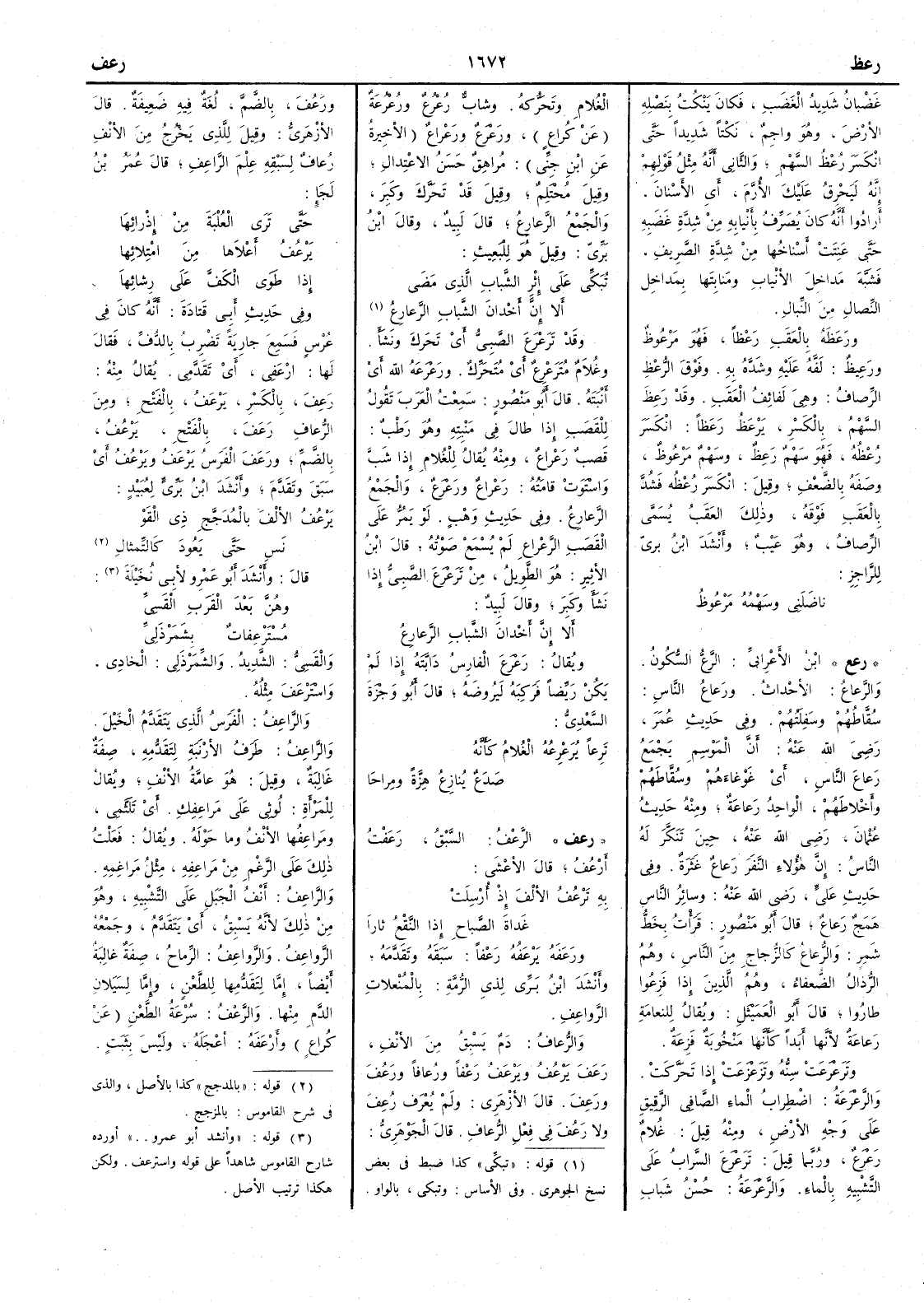 ( رعع ) ابن الأَعرابي الرَّعُّ السكون والرَّعاعُ الأَحداثُ ورَعاعُ الناس سُقّاطُهم وسَفِلَتُهم وفي حديث عمر رضي الله عنه أَن المَوسم يَجمع رَعاع الناس أَي غَوْغاءهم وسُقّاطَهم وأَخلاطَهم الواحد رَعاعة ومنه حديث عثمان رضي الله عنه حين تَنَكَّرَ له الناس إِن هؤلاء النفر رَعاع غَثَرةٌ وفي حديث علي رضي الله عنه وسائر الناسِ هَمَجٌ رَعاعٌ قال أَبو منصور قرأْت بخط شمر والرُّعاعُ كالزجاج من الناس وهم الرُّذال الضُّعفاء وهم الذين إِذا فَزِعوا طاروا قال أَبو العَمَيْثَل ويقال للنعامة رَعاعة لأَنها أَبداً كأَنها مَنْخوبة فَزعةٌ وتَرَعْرعت سِنُّه وتَزَعْزعت إِذا تحركت والرَّعْرعة اضطرابُ الماء الصافي الرقيق على وجه الأَرض ومنه قيل غلام رَعْرعٌ وربما قيل تَرَعْرع السَّراب على التشبيه بالماء والرَّعْرعةُ حسن شَبابِ الغُلام وتحرُّكه وشابٌّ رُعْرُعٌ ورُعْرعة عن كراع ورَعْرَعٌ ورَعْراعٌ الأَخيرة عن ابن جني مُراهِق حسَن الاعْتِدال وقيل مُحْتَلِم وقيل قد تحرّك وكَبِرَ والجمع الرَّعارِعُ قال لبيد وقال ابن بري وقيل هو للبَعِيث تُبَكِّي على إِثْرِ الشَّبابِ الذي مَضَى أَلا إِنّ أَخْدانَ الشَّبابِ الرَّعارِعُ