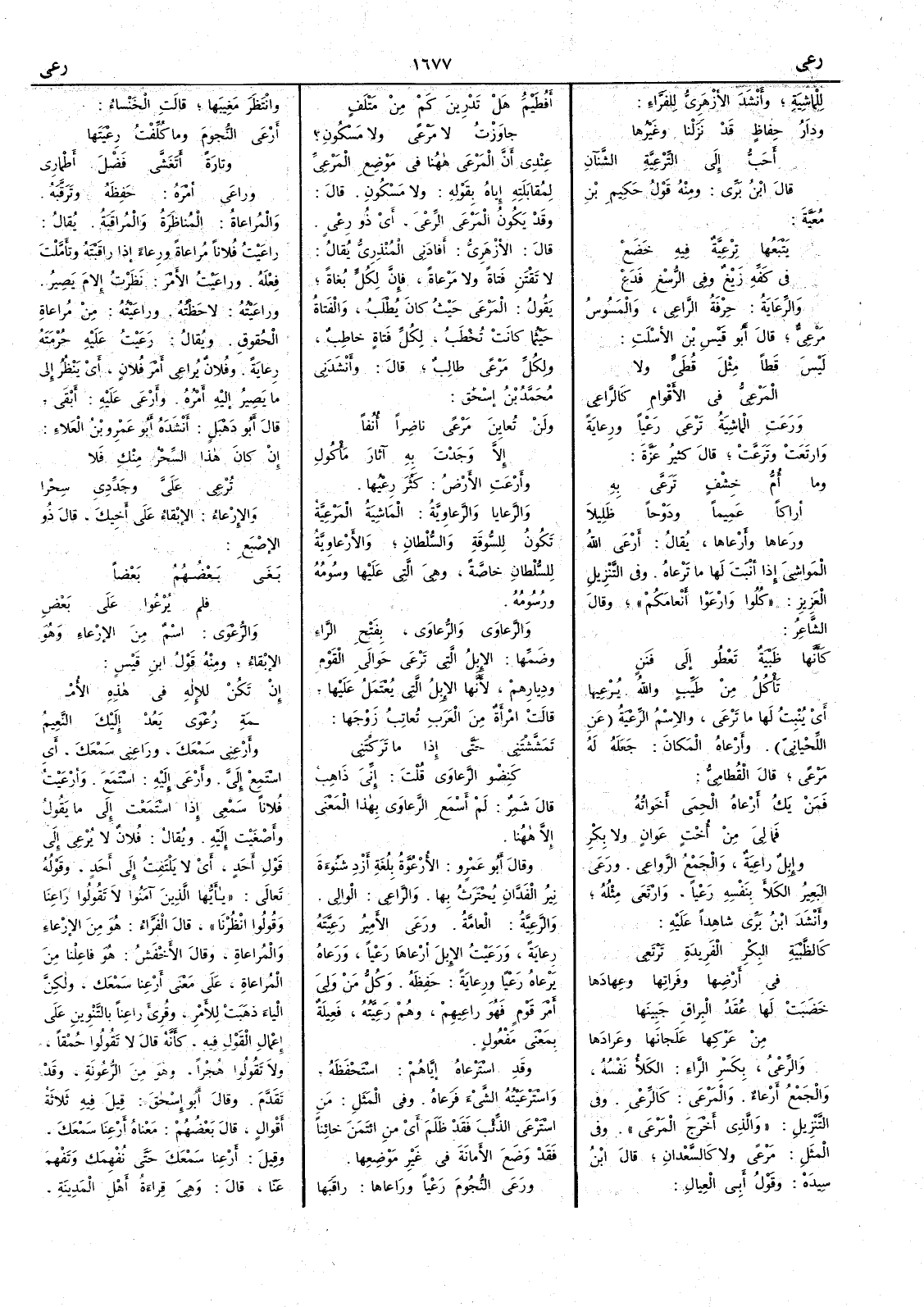 للماشية وأَنشد الأََزهري للفراء ودَار حِفاظٍ قَدْ نَزَلْنَا وغَيرُها أَحبُّ إلى التِّرْعِيَّةِ الشَّنَآنِ قال ابن بري ومنه قول حكيم بن مُعَيَّة يَتْبَعُها تِرْعِيَّةٌ فيه خَضَعْ في كَفِّة زَيْعٌ وفي الرُّسْغِ فَدَعْ والرِّعَايَةُ حِرْفةُ الرَّاعِي والمَسُوسُ مَرْعِيٌّ قال أَبو قيس بن الأَسْلَت لَيس قَطاً مثلَ قُطَيٍّ ولا الْ رْعِيٌّ في الأَقْوامِ كالرَّاعِي وَرَعتِ الماشِيةُ تَرْعَى رَعْياً ورِعايَةً وارْتَعَتْ وتَرَعَّتْ قال كثير عزة وما أُمُّ خِشْفٍ تَرَعَّى به أَراكاً عَمِيماً ودَوْحاً ظَلِيلا ورَعاها وأَرْعاها يقال أَرْعَى اللهُ المَواشِيَ إذا أَنْبَتَ لها ما تَرْعاه وفي التنزيل العزيز كُلُوا وارْعَوْا أَنْعامَكُم وقال الشاعر كأَنَّها ظَبْيةٌ تَعْطُو إلى فَنَنٍ تأْكُلُ مِنْ طَيِّبٍ واللهُ يُرْعِيها أَي يُنْبِتُ لها ما تَرْعَى والاسمُ الرِّعْية عن اللحياني وأَرْعاهُ المكانَ جعلَهَ له مَرْعىً قال القُطامي فَمَنْ يَكُ أَرْعاهُ الحِمَى أَخَواتُه فَما ليَ مِنْ أُخْتٍ عَوانٍ ولا بِكْرِ وإبِلٌ راعِيةٌ والجمع الرَّواعِي ورَعَى البعِيرُ الكلأَ بنَفْسِه رَعْىاً وارْتَعَى مثلُه وأَنشد ابن بري شاهداً عليه كالظَّبْيةِ البِكْرِ الفَرِيدةِ تَرْتَعِي في أَرْضِها وفَراتِها وعِهادَها خَضَبَتْ لها عُقَدُ البِراقِ جَبِينَها من عَرْكِها عَلَجانَها وعَرادَها والرِّعْي بكسر الراء الكَلأُ نَفْسُه والجمع أَرْعاءٌ والمَرْعَى كالرَّعْيِ وفي التنزيل والذي أَخْرَجَ المَرْعَى وفي المثل مَرْعىً ولا كالسَّعْدانِ قال ابن سيده وقول أَبي العِيالِ أَفُطَيْم هل تَدْرِينَ كَمْ مِنْ مَتْلَفٍ جاوَزْتُ لا مرْعىً ولا مَسْكُونِ ؟ عندي أَن المَرْعَى ههنا في موضع المَرْعِيَّ لمقابلته إياه بقوله ولا مَسْكون قال وقد يكون المَرْعَى الرِّعْيَ أَي ذُو رِعْيٍ قال الأَزهري أَفادني المُنْذِرِيُّ يقال لا تَقْتَنِ فَتاةً ولا مَرْعاة فإنَّ لكُلٍّ بُغاةً يقول المَرْعَى حيث كان يُطْلَبُ والفَتاةُ حيثما كانت تُخْطَبُ لكلِّ فتاةٍ خاطِب ولكلِّ مَرْعىً طالب قال وأَنشدني محمد بن إسحق ولَنْ تُعايِنَ مَرْعىً ناضِراً أُنُفاً إلاَّ وجَدْتَ به آثارَ مأْكُولِ وأَرْعَتِ الأَرضُ كثُر رِعْيُها والرَّعايا والرَّعاوِيَّةُ الماشية المَرْعِيَّة تكون للسوقة والسلطان والأَرْعاوِيَّةُ للسلطان خاصة وهي التي عليها وُسومُه ورُسومُه والرَّعاوَى والرُّعاوَى بفتح الراء وضمها الإبل التي تَرْعَى حَوالَى القومِ وديارِهم لأنها الإبل التي يُعْتَمَلُ عليها قالت امرأَة من العرب تُعاتب زوجَها تَمَشَّشْتَني حتى إذا ما تَرَكْتَنِي كنِضْوِ الرَّعاوَى قلتَ إنِّي ذَاهِبُ قال شمر لم أَسمع الرَّعاوَى بهذا المعنى إلاّ ههنا وقال أَبو عمرو الأُرْعُوَّة بلغة أَزْدِ شَنُوأَة نِيرُ الفَدَّان يُحْتَرَثُ بها والراعِي الواليِ والرِّعِيَّة العامَّة ورَعَى الأَمِيرُ رَعِيَّته رِعايةً ورَعَيْتُ الإبلَ أَرْعاها رَعْياً ورَعاه يَرْعاه رَعْياً ورِعايَةً حَفِظَه وكلّ مَنْ وَلِيَ أَمرَ قومٍ فهو راعِيهم وهُم رَعِيَّته فعيلة بمعنى مفعول وقد اسْترعاهُ إيَّاهم اسْتَحْفَظه وإسْتَرْعَيْته الشيءَ فَرَعاه وفي المثل مَن اسْترعى الذئْبَ فقد ظَلَمَ أَي مَنِ ائتَمَنَ خائناً فقد وضع الأَمانة في غيرِ موْضِعِها ورَعى النُّجُوم رَعْياً وراعاها راقَبَها وانْتَظَر مَغِيبَها قالت الخنساء أَرْعى النُّجوم وما كُلِّفْت رِعْيَتَها وتارةً أَتَغَشَّى فَضْلَ أَطْمارِي وراعَى أَمرهَ حَفِظَه وتَرَقَّبَه والمُراعاة المُناظَرة والمُراقَبَة يقال راعَيْتُ فلاناً مراعاةً ورِعاءً إذا راقَبْتَه وتأَمَّلْت فِعْلَه وراعَيْتُ الأَمرَ نَظَرْت إلامَ يصير وراعَيْته لاحَظته وراعَيْته من مُراعاةِ الحُقوق ويقال رَعَيْتُ عليه حُرْمَتَه رِعايَةً وفلانُ يُراعي أَمرَ فُلانٍ أَي ينظر إلى ما يصير إليه أَمره وأَرْعى عليه أَبْ