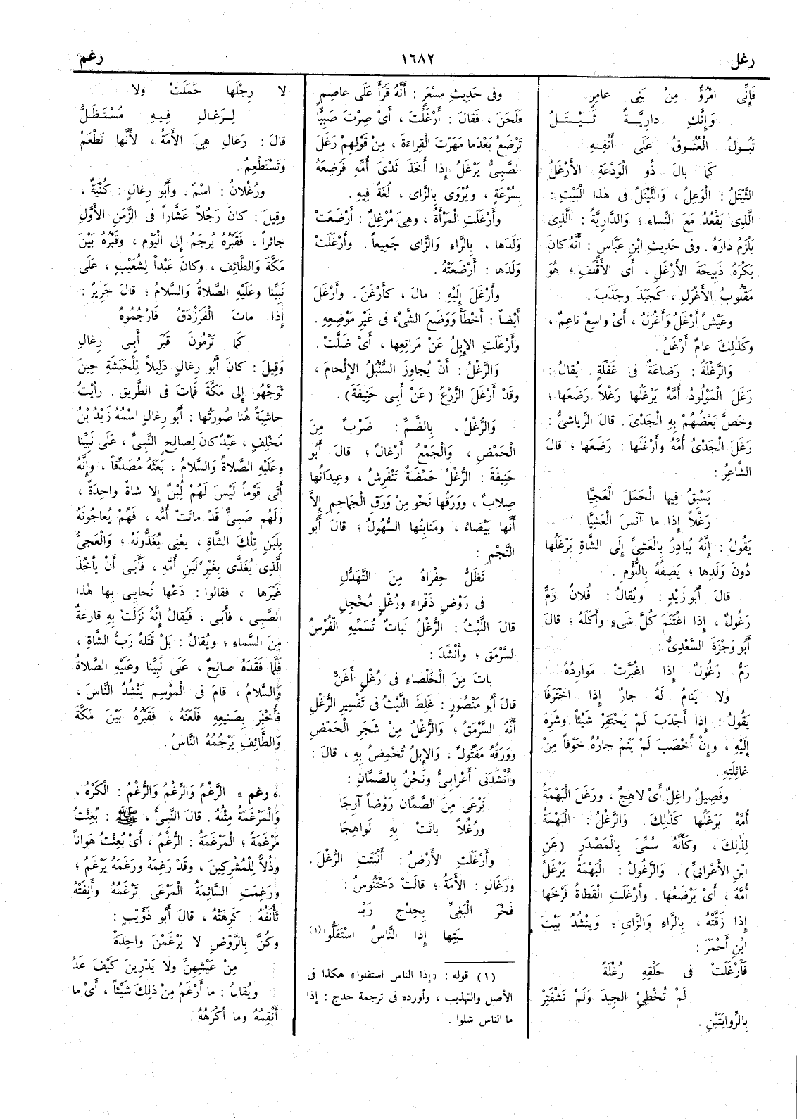لا رِجْلَها حَمَلَتْ ولا لرَغَالِ فيه مُسْتَظَلُّ قال رَغالِ هي الأَمة لأَنها تَطْعَم وتَسْتَطْعِم ورُغْلان اسم وأَبو رِغال كنية وقيل كان رَجُلاً عَشَّاراً في الزمن الأَول جائراً فقَبْره يُرجم إِلى اليوم وقبره بين مكة والطائف وكان عبداً لشُعَيب على نبينا وعليه الصلاة والسلام قال جرير إِذا مات الفرزدق فارجُموه كما تَرْمُون قبر أَبي رِغال وقيل كان أَبو رِغال دليلاً للحبشة حين توجهوا إِلى مكة فمات في الطريق رأَيت حاشية هنا صورتها أَبو رِغال اسمه زيد بن مخلف عَبْدٌ كان لصالح النبي على نبينا وعليه الصلاة والسلام بعثه مُصَدِّقاً وإِنه أَتى قوماً ليس لهم لِبْنٌ إِلا شاة واحدة ولهم صبي قد ماتت أُمُّه فهم يُعاجُونه بلبن تلك الشاة يعني يُغَذُّونه والعَجِيُّ الذي يُغَذَّى بغير لبن أُمه فأَبى أَن يأْخذ غيرها فقالوا دَعْها نُحايي بها هذا الصبيَّ فأَبى فيقال إِنه نزلت به قارعة من السماء ويقال بل قَتَله رَبُّ الشاة فلما فقده صالح على نبينا وعليه الصلاة والسلام قام في الموسم ينشد الناس فأُخْبِر بصنيعه فَلَعَنه فقبره بين مكة والطائف يَرْجُمه الناس