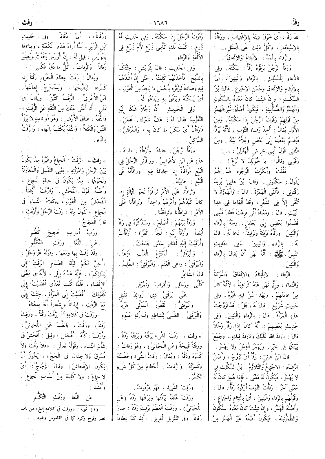 ( رفت ) رَفَتَ الشيءَ يَرْفُتُه ويَرْفِتُه رَفْتاً ورِفْتةً قبيحةً عن اللحياني وهو رُفاتٌ كَسَرَه ودَقَّه ويقال رَفَتُّ الشيءَ وحَطَمْتُه وكَسَرتُه والرُّفاتُ الحُطام من كل شيء تكَسَّر ورُفِتَ الشيءُ فهو مَرْفوتٌ ورَفَتَ عُنُقَه يَرْفُتُها ويَرْفِتُها رَفْتاً عن اللحياني ورَفَتَ العَظْمُ يَرْفِتُ رَفْتاً صار رُفاتاً وفي التنزيل العزيز أَئِذا كنَّا عِظاماً ورُفاتاً أَي دُقاقاً وفي حديث ابن الزبير لما أَراد هَدْمَ الكعبة وبناءَها بالوَرْسِ قيل له إِن الوَرْسَ يَتَفَتَّتُ ويَصير رُفاتاً والرُّفاتُ كل ما دُقَّ فكُسِرَ ويقال رَفَتَ عِظامَ الجَزور رَفْتاً إِذا كِسَرها ليَطْبُخَها ويَسْتَخْرِجَ إِهالَتَها ابن الأَعرابي الرُّفَتُ التِّينُ ويقال في مَثَلٍ أَنا أَغْنى عَنْكَ من التُّفَهِ عن الرُّفَتِ والتُّفَهُ عَناقُ الأَرض وهو ذُو ناب لا يَرْزَأَ التِّبْنَ والكَلأَ والتُّفَه يُكتب بالهاء والرُّفتُ بالتاء ( رفث ) الرَّفَثُ الجماعُ وغيره مما يكون بين الرجل وامرأَته يعني التقبيل والمُغازلة ونحوهما مما يكون في حالة الجماع وأَصله قول الفُحْش والرَّفَثُ أَيضاً الفُحْشُ من القول وكلام النساءِ في الجماع تقول منه رَفَثَ الرجل وأَرْفَثَ قال العجاج ورُبَّ أَسرابِ حَجيجٍ كُظَّمِ عن اللَّغَا ورَفَثِ التَكَلُّم وقد رَفَثَ بها ومَعها وقوله عز وجل أُحِلَّ لكم ليلةَ الصيام الرَّفَثُ إِلى نسائكم فإِنه عدَّاه بإِلى لأَنه في معنة الإِفْضاءِ فلما كُنْتَ تُعَدِّي أَفْضَيْتُ بإِلى كقولك أَفْضَيتُ إِلى المرأَة جئتَ بإِلى مع الرَّفَثِ إِيذاناً وإِشعاراً أَنه بمعناه ورَفَثَ في كلامه
