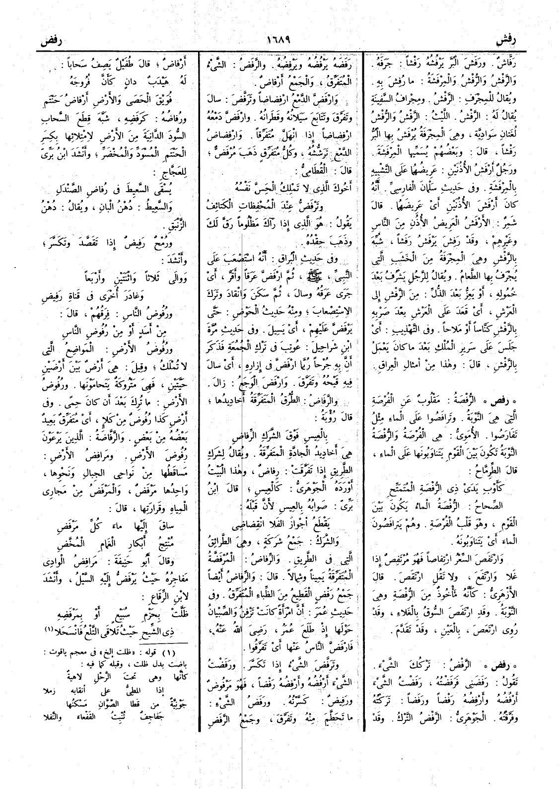 ( رفض ) الرَّفْضُ تركُكَ الشيءَ تقول رَفَضَني فَرَفَضْتُه رَفَضْتُ الشيءَ أَرْفُضُه وأَرفِضُه رَفْضاً ورَفَضاً تركتُه وفَرَّقْتُه الجوهري الرَّفْضُ الترك وقد رَفَضَه يَرْفُضُه ويَرْفِضُه والرَّفَضُ الشيء المُتَفَرِّقُ والجمع أَرفاضٌ وارْفَضَّ الدَّمْعُ ارْفِضاضاً وتَرَفَّض سالَ وتفَرَّق وتتابَعَ سَيَلانُه وقَطَرانُه وارْفَضَّ دَمْعُه ارْفِضاضاً إِذا انهلَّ متفرِّقاً وارْفِضاضُ الدمْع ترشُّشُه وكل متفرِّق ذهب مُرْفَضٌّ قال القطامي أَخُوكَ الذي لا تَمْلِكُ الحَِسَّ نفسُه وتَرْفَضُّ عِنْدَ المُحْفِظاتِ الكَتائِفُ يقول هو الذي إِذا رآكَ مظلوماً رَقّ لك وذهب حِقْده وفي حديث البُراق أَنه استصعب على النبي صلّى اللّه عليه وسلّم ثم ارْفَضَّ عرَقاً وأَقَرَّ أَي جرَى عرَقُه وسالَ ثم سكَنَ وانْقاد وترك الاسْتِصعاب ومنه حديث الحْوض حتى يَرْفَضّ عليهم أَي يَسِيل وفي حديث مُرَّةَ بن شراحِيلَ عوتب في ترك الجمعة فذكر أن به جرحاً ربما ارْفَضّ في إِزاره أَي سال فيه قَيْحُه وتفَرَّق وارْفَضَّ الوَجَعُ زالَ والرِّفاضُ الطُّرُق المتفرِّقةُ أَخادِيدُها قال رؤبة بالعِيسِ فوْقَ الشَّرَكِ الرِّفاض هي أَخاديدُ الجادَّةِ المتفرِّقةُ ويقال لشَرَكِ الطريقِ إِذا تفرّقت رِفاضٌ وهذا البيت أَورده الجوهري كالعِيسِ قال ابن بري صوابه بالعيس لأَن قبله يَقْطَعُ أَجْوازَ الفلا انْقِضاضِي والشَّرَكُ جمع شَرَكةٍ وهي الطرائقُ التي في الطريق والرِّفاضُ المُرْفَضّةُ المتفرّقة يميناً وشمالاً قال والرِّفاضُ أَيضاً جمع رَفْضٍ القَطِيعُ من الظِّباء المتفرِّق وفي حديث عمر أَن امرأَة كانت تَزْفِنُ والصِّبْيانُ حولَها إِذ طلع عمر رضي اللّه عنه فارْفَضَّ الناسُ عنها أَي تفَرّقُوا وتَرَفَّضَ الشيءُ إِذا تكسّر ورَفَضْت الشيء أَرْفُضُه وأَرْفِضُه رَفْضاً فهو مرفوضٌ ورَفِيضٌ كسرته ورَفَضُ الشيء ما تحطّم منه وتفرّق وجمع الرَّفَض أَرْفاض قال طفيل يصف سَحاباً له هَيْدَبٌ دانٍ كأَنَّ فُرُوجَه فُوَيْقَ الحَصى والأَرضِ أَرْفاضُ حَنْتَمِ ورُفاضُه كرَفَضِه شبّه قِطع السحاب السُّود الدانية من الأَرض لامتلائها بِكِسَر الحنتم المُسْوَدّ والمُخْضَرّ وأَنشد ابن بري للعجاج يُسْقى السَّعِيطَ في رُفاضِ الصَّنْدَلِ والسَّعِيطُ دُهْن البانِ ويقال دُهْنُ الزَّنْبَقِ ورُمْحٌ رَفِيضٌ إِذا تَقَصَّد وتكسَّر وأَنشد ووالى ثلاثاً واثْنَتَيْنِ وأَرْبَعاً وَغادَرَ أُخْرى في قَناةِ رَفِيضِ ورُفُوضُ الناسِ فِرَقُهم قال من أَسَدٍ أَوْ مِنْ رُفُوضِ الناس ورُفُوضُ الأَرضِ المَواضِع التي لا تُمْلَك وقيل هي أَرض بين أَرْضَيْنِ حَيَّتَيْنِ فهي متروكة يتَحامَوْنَها ورُفُوضُ الأَرض ما ترك بعد أَن كان حِمىً وفي أَرض كذا رُفُوضٌ من كلإٍ أَي مُتَفَرِّقٌ بَعيدٌ بعضه من بعض والرَّفّاضةُ الذين يَرْعَوْنَ رُفُوضَ الأَرض ومَرافِضُ الأَرضِ مساقِطُها من نواحي الجبال ونحوها واحدها مَرْفَضٌ والمَرْفَضُ من مَجاري المياه وقَرارَتِها قال ساقَ إِليْها ماءَ كلِّ مَرْفَضِ مُنْتِجُ أَبْكارِ الغَمامِ المُخَّضِ وقال أَبو حنيفة مَرافِضُ الوادي مَفاجِرُه حيثُ يَرْفَضُّ إِليه السَّيْلُ وأَنشد لابن الرقاع ظَلَّتْ بِحَزْمِ سُبَيْعٍ أَو بِمَرْفَضِه