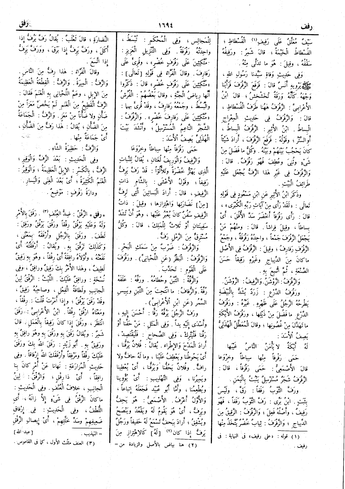 ( * قوله « على رفيف » في النهاية في رفيف ) الفسطاط الفسطاط الخَيْمة قال شمر ورَفِيفُه سَقْفُه وقيل هو ما تدَلَّى منه وفي حديث وفاة سيدنا رسول اللّه صلى اللّه عليه وسلم يرويه أَنس قال فَرَفَعَ الرَّفرَفَ فرأَينا وجْهَه كأَنه ورقة تَخَشْخِشُ قال ابن الأَعرابي الرَّفْرَفُ ههنا طَرَفُ الفُسْطاط قال والرَّفْرَفُ في حديث المِعراج البِساطُ ابن الأَثير الرَّفْرَفُ البِساطُ أَو السِّتر وقوله فَرَفَعَ الرَّفْرَفَ أَراد شيئاً كان يَحْجُبُ بينهم وبينه وكلُّ ما فَضَلَ من شيء وثُنِيَ وعُطِفَ فهو رَفْرَفٌ قال والرَّفْرَفُ في غير هذا الرَّفُّ يُجْعَل عليه طَرائفُ البيت وذكر ابن الأَثير عن ابن مسعود في قوله تعالى لقد رأَى من آيات ربه الكبرى قال رأَى رَفْرَفاً أَخضر سَدَّ الأُفق أَي بِساطاً وقيل فِراشاً قال ومنهم من يجعل الرَّفْرَف جمعاً واحده رَفْرَفَةٌ وجمع الرفْرفِ رَفارِفُ وقيل الرفرف في الأَصل ما كان من الديباج وغيره رَقيقاً حَسَن الصنْعة ثم اتُّسِع به والرَّفْرَفُ الرَّوْشَنُ والرَّفِيفُ الروشن ورَفْرَفُ الدِّرْعِ زَرَدٌ يشد بالبيضة يطرحه الرجل عى ظهره غيره ورَفْرَفُ الدِّرْعِ ما فضلَ من ذَيْلِها ورَفْرَفُ الأَيكةِ ما تَهَدَّلَ من غُصونها وقال المُعَطَّلُ الهُذَليُّ يصف الأَسد له أَيْكَةٌ لا يَأْمَنُ الناسُ غَيْبَها حَمَى رَفْرَفاً منها سِباطاً وخِرْوَعا قال الأَصمعي حمى رَفْرَفاً قال الرَّفْرَفُ شجر مُسْترْسِلٌ ينبت باليمن ورَفَّ الثوبُ رَفَفاً رَقَّ وليس بثبت ابن بري رَفَّ الثوبُ رَفَفاً فهو رَفِيفٌ وأَصله فَعِلَ والرَّفرَفُ الرَّقِيقُ من الدِّيباج والرَّفرَفُ ثياب خُضْرٌ يُتَّخذ منها للمجالس وفي المحكم تُبْسَطُ واحدته رَفْرَفَةٌ وفي التنزيل العزيز متكئين على رَفرَفٍ خُضْر وقرئ على رَفارِفَ وقال الفراء في قوله متكئين على رفرف خضر قال ذكروا أَنها رِياضُ الجنة وقال بعضهم الفُرُشُ والبُسُطُ وجمعه رفارِفُ وقد قرئ بهما متكئين على رَفارِف خُضْرٍ والرَّفرَفُ الشجر الناعم المسترسل وأَنشد بيت الهذلي يصف الأَسد حَمَى رَفْرَفاً منها سِباطاً وخِرْوَعا والرَّفيفُ والوَرِيفُ لغتان يقال للنبات الذي يهْتزُّ خُضْرَةً وتَلأْلُؤاً قد رَفَّ يَرِفُّ رَفيفاً وقول الأَعْشى بالشام ذات الرَّفِيف قال أَراد البساتين التي تَرِفُّ من نَضارتها واهتزازها وقيل ذاتُ الرَّفِيف سُفُنٌ كان يُعْبَر عليها وهو أَن تُشَدَّ سَفِينتانِ أَو ثلاث للملِك قال وكلُّ مُستَرِقٍّ من الرمل رَفٌّ والرَّفْرَفُ ضَرْب من سَمَكِ البحر والرَّفرفُ البَظْرُ عن اللحياني ورَفرف على القوم تَحَدَّب والرُّفَةُ التِّبْنُ وحُطامُه ورَفُّه عَلَفَه رُفَّة والرُّفافُ ما انْتُحِتَ من التبن ويَبِيس السَّمر عن ابن الأَعرابي ورَفَّ الرجلَ يَرُفُّه رَفّاً أَحْسَنَ إليه وأَسْدَى إليه يداً وفي المثل من حَفَّنا أَو رَفّنا فَلْيَتَّرِكْ وفي الصحاح فَليَقْتصد أَراد المدْح والإطْراء يقال فلان يَرُفُّنا أَي يَحُوطُنا ويَعْطِفُ علينا وما له حافٌّ ولا رافٌّ وفلان يَحُفُّنا ويَرُفُّنا أَي يُعْطِينا ويَميرُنا وفي التهذيب أَي يُؤوِينا ويُطْعِمُنا وأَما أَبو عبيد فجعله إتباعاً والأَوّل أَعْرَف الأَصمعي هو يَحِفُّ ويَرِفُّ أَي هو يقوم له ويَقْعُد ويَنْصَح ويُشْفِقُ أَراد بيَحِفُّ تسمع له حفيفاً ورجل يَرِفُّ إذا كان