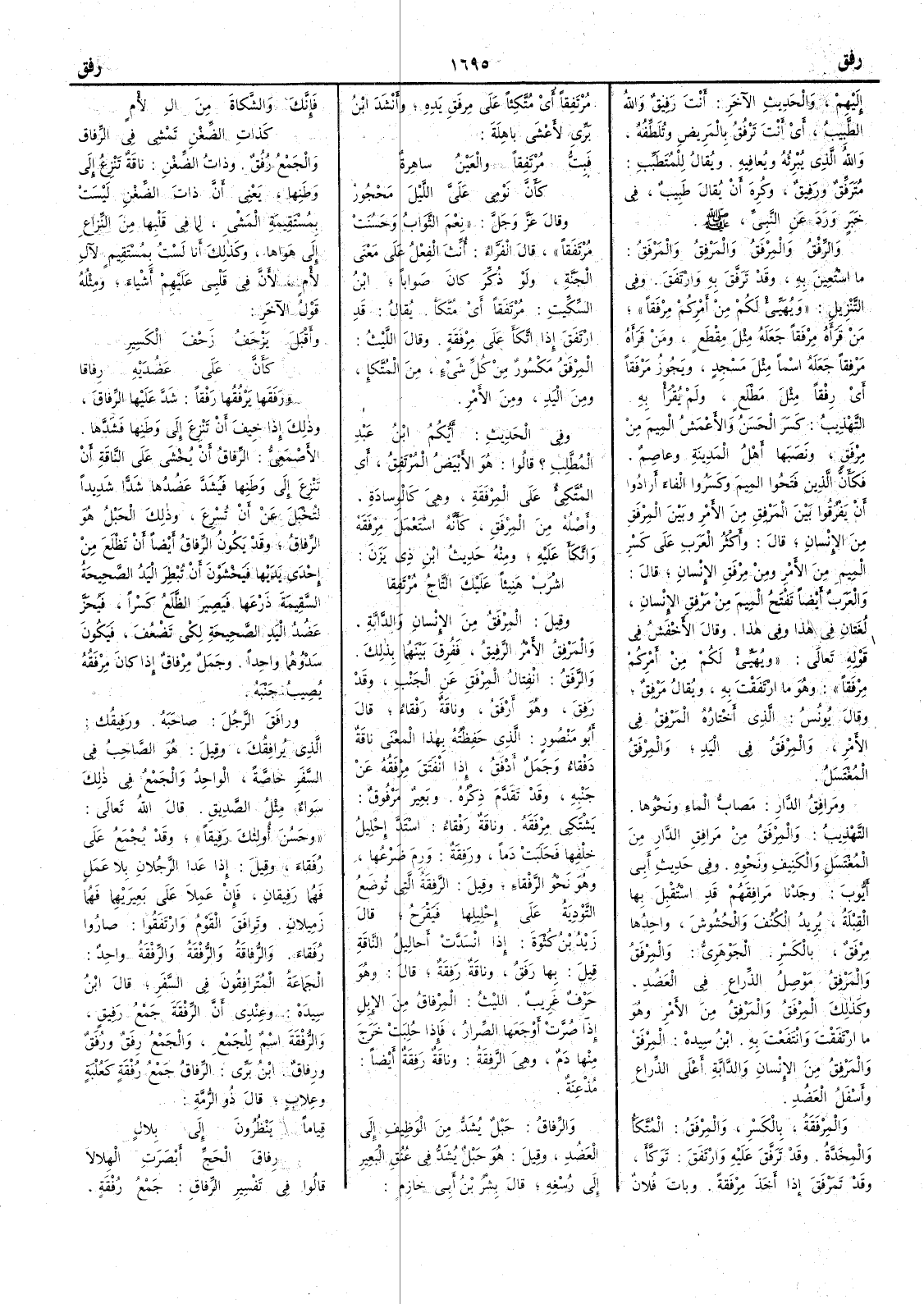 إِليهم والحديثِ الآخر أَنت رَفِيق واللهُ الطَّبِيبِ أَي أَنت تَرفُق بالمريض وتُلَطِّفُه والله الذي يُبْرئه ويُعافِيه ويقال للمُتَطَبِّب مُترفِّق ورَفِيق وكره أَن يقال طبيب في خبر ورد عن النبي صلى الله عليه وسلم والرِّفْقُ والمِرْفَقُ والمَرْفِقُ والمَرفَقُ ما اسْتُعِينَ به وقد تَرَفَّقَ به وارْتفَق وفي التنزيل ويُهَيِّئُ لكم من أَمركم مِرْفَقاً مَن قرأَه مِرْفَقاً جعله مثل مقْطَع ومن قرأَه مَرْفِقاً جعله اسماً مثل مسجد ويجوز مَرْفَقاً أَي رِفْقاً مثل مَطْلَع ولم يُقرأْ به التهذيب كسر الحسنُ والأَعمش الميم من مِرْفَق ونصبَها أَهل المدينة وعاصم فكأَن الذين فتحوا الميم وكسروا الفاء أَرادوا أَن يَفْرقُوا بين المَرفِق من الأَمر وبين المِرْفَق من الإِنسان قال وأَكثر العرب على كسر الميم من الأَمر ومن مِرفَق الإِنسان قال والعرب أَيضاً تفتح الميم من مَرفِق الإِنسان لغتان في هذا وفي هذا وقال الأَخفش في قوله تعالى ويهيِّئ لكم من أَمركم مِرْفَقاً وهو ما ارتفَقْت به ويقال مَرفِق وقال يونس الذي اختاره المَرْفِقُ في الأَمر والمِرْفَقُ في اليد والمِرْفَقُ المُغْتَسَلُ ومَرافِقُ الدار مَصابُّ الماء ونحوُها التهذيب والمِرْفَقُ من مَرافِق الدار من المغتسل والكنيف ونحوه وفي حديث أَبي أَيُّوب وجدْنا مَرافِقَهم قد اسْتُقْبِل بها القِبْلةُ يريد الكُنُفَ والحُشُوشَ واحدها مِرْفَق بالكسر الجوهري والمِرْفَق والمَرْفِقُ مَوْصِلُ الذراع في العَضُد وكذلك المِرفَق والمَرفِقُ من الأَمر وهو ما ارتفقْت وانْتفعْت به ابن سيده المِرفَق والمَرفِق من الإِنسان والدابة أَعلى الذِّراع وأَسفلُ العَضُد والمِرفَقةُ بالكسر والمِرْفَقُ المُتَّكأُ والمِخَدَّةُ وقد تَرفَّق عليه وارْتَفَقَ تَوَكَّأَ وقد تَمَرْفَقَ إِذا أَخذَ مِرْفَقةً وبات فلان مُرتَفِقاً أَي مُتَّكِئاً على مِرفَق يده وأَنشد ابن بري لأَعشى باهِلةَ فبِتُّ مُرْتَفِقاً والعينُ ساهِرةٌ كأَنَّ نَوْمي عليَّ اللَّيلَ مَحْجُورُ وقال عز وجل نِعْمَ الثوابُ وحَسُنَت مُرْتَفَقاً قال الفراء أُنِّثَ الفعل على معنى الجنة ولو ذُكِّرَ كان صواباً ابن السكيت مرتفَقاً أَي مُتَّكأً يقال قد ارْتفَق إِذا اتَّكأَ على مِرْفَقةٍ وقال الليث المِرفق مكسور من كل شيء من المُتَّكَأِ ومن اليد ومن الأَمر وفي الحديث أَيُّكم ابنُ عبد المطلب ؟ قالوا هو الأَبيضُ المُرتفِق أَي المتكِئُ على المِرفَقة وهي كالوِسادة وأَصله من المِرْفَق كأَنه اسْتعملَ مِرفقه واتَّكأَ عليه ومنه حديث ابن ذي يَزَنَ اشْرَبْ هَنيئاً عليكَ التاج مُرْتَفِقا وقيل المِرْفَقُ من الإِنسان والدابة والمَرْفِقُ الأَمر الرَّفيقُ ففُرِقَ بينهما بذلك والرَّفَقُ انْفِتالُ المِرْفَقِ عن الجنب وقد رَفِقَ وهو أَرْفَقُ وناقة رَفْقاء قال أَبو منصور الذي حفظته بهذا المعنى ناقة دَفْقاء وجمل أَدْفَقُ إِذا انْفَتَق مِرفَقُه عن جنبه وقد تقدم ذكره وبعير مَرْفوقٌ يشتكي مِرفَقه وناقة رَفقاء اشْتَدَّ إِحليل خِلْفها فحلَبت دماً ورَفِقةٌ وَرِمَ ضَرْعُها وهو نحو الرَّفْقاء وقيل الرَّفِقةُ التي تُوضع التَّوْدِيةُ على إِحليلها فيَقْرَح قال زيد بن كُثْوَةَ إِذا انْسَدَّت أَحالِيل الناقة قيل بها رَفَقٌ وناقة رَفِقة قال وهو حرف غريب الليث المِرْفاقُ من الإِبل إِذا صُرَّت أَوْجَعها الصِّرار فإِذا حُلِبت خرج منها دم وهي الرَّفِقةُ وناقة رَفِقة أَيضاً مُذْعِنة والرِّفاق حبل يشد من الوَظِيف إِلى العضد وقيل هو حبل يشد في عنق البعير إِلى رُسْغه قال بشر بن أَبي خازم فإِنَّكَ والشَّكاةَ مِن آلِ لأْمٍ كذاتِ الضِّغْنِ تَمْشي في الرِّفاقِ والجمعُ رُفُقٌ وذاتُ الضغن ناقة تَنْزِعُ إِلى وَطَنِها يعني أَنَّ ذات الضغن ليست بمُستقيمة المشي لما في قلبها من النِّزاع إلى هَواها وكذلك أَنا لست بمستقيم لآل لأْم لأَن في قلبي عليهم أَشياء ومثله قول الآخر وأَقْبَلَ يَزْحَفُ زَحْفَ الكَسِير كأَ