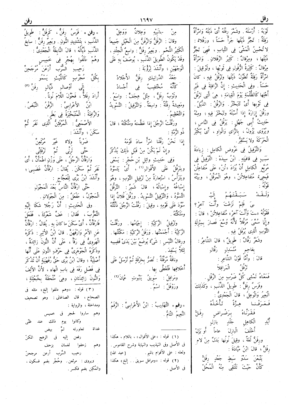 ثوبه أَرسله وشَمَّر رِفْله أَي ذيله وامرأَة رَفِلة تَجُرُّ ذيلها جَرّاً حسناً ورَفْلاء لا تُحْسِن المشي في الثياب فهي تَجُرُّ ذيلها ومِرْفالٌ كثير الرَّفَلان وامرأَة مِرْفالٌ كثيرة الرُّفول في ثوبها ولو قيل امرأَة رَفِلة تُطَوِّل ذيلها وتَرْفُل فيه كان حسناً وفي الحديث إِن الرافلة في غير أَهلها كالظُّلْمة يوم القيامة هي التي تَرْفُل في ثوبها أَي تتبختر والرِّفْل الذيل ورَفَّل إِزاره إِذا أَسبله وتبختر فيه ومنه حديث أَبي جهل يَرْفُل في الناس ويروى يَزُول بالزاي والواو أَي يُكثر الحركة ولا يستقرّ والتَّرْفيل في عروض الكامل زيادة سبب في قافيته ابن سيده الترفيل في مُرَبَّع الكامل أَن يزاد « تُنْ » على مُتَفاعلن فيجيء مُتَفاعِلاتُنْ وهو المُرَفَّل وبيته قوله ولقد سَبَقْتَهُمُ إِليْ يَ فلِمْ نَزَعْتَ وأَنت آخر ؟ فقوله « تَ وَأَنت آخر » متفاعلاتن قال وإِنما سُمِّي مُرَفَّلاً لأَنه وُسِّع فصار بمنزلة الثقوب الذي يُرْفَل فيه وشَعرٌ رَفالٌ طويل قال الشاعر بفاحِمٍ مُنْسدِلٍ رَفال قال وأَما قول الشاعر ترفل المَرافلا فمعناه تمشي كل ضرب من الرَّفْل وفرس رِفَلُّ طويل الذنب وكذلك البعير والوَعِل قال الجعدي فَعَرَفْنا هِزَّةً تأْخُذُه فَقَرَنَّاه برَضْراضٍ رِفَل أَيِّدِ الكاهلِ جَلْدٍ بازلٍ أَخْلَف البازل عاماً أَو بَزَل ورِفَنٌّ لغة وقيل نونها بدل من لام رِفَلّ قال ابن مَيَّادة يَتْبَعْنَ سَدْوَ سَبِط جَعْدٍ رِفَل كأَن حيث تلتقي منه المُحُل من جانبيه وعِلان ووَعِل وقال الرَّفَلُّ والرِّفَنُّ من الخيل جميعاً الكثير اللحم وبعير رِفَلٌّ واسع الجلد وقد يكون الطويل الذنب يوصف به على الوجهين وأَنشد لرؤبة جَعْدُ الدَّرانِيك رِفَلُّ الأَجلاد كأَنه مُخْتَضِبٌ في أَجساد وثوبٌ رِفَلُّ مثل هِجَفٍّ واسعٌ ومعيشة رِفَلَّة واسعة والتَّرفيل التسويد والتعظيم ورَفَّلْت الرجلَ إِذا عَظَّمته ومَلَّكْته قال ذو الرمة إِذا نحن رَفَّلْنا امْرَأً ساد قومَه وإِن لم يكن من قبل ذلك يُذْكَر وفي حديث وائل بن حجر يَسْعى ويَترفَّل على الأَقوال أَي يَتَسَوَّد ويَتَرأْس استعارة من ترفيل الثوب وهو إِسباغه وإِسباله قال شمر الترفُّل التسوّد والترفيل التسويد ورُفِّل فلان إِذا سُوّد على قومه وقيل رَفَّلت الرجل ذَلَّلته ومَلَكْته وترفيل الرَّكِيَّة إِجْمامها ورَفَّلْتُ الركيَّة أَجْممتها ورَفَلُ الرَّكِيَّةِ مَكْلتُها ورِفال التيس شيء يوضع بين يدي قَضِيبه لئلا يَسْفِد وناقة مُرَفَّلة تُصَرُّ بخِرْقة ثم تُرْسَل على أَخْلافها فتُغَطَّى بها ومرافل سَوِيقُ يَنْبُوتِ عُمان ورَوْفَل اسم ( رفم ) التهذيب ابن الأعرابي الرَّفَمُ النعيم التام