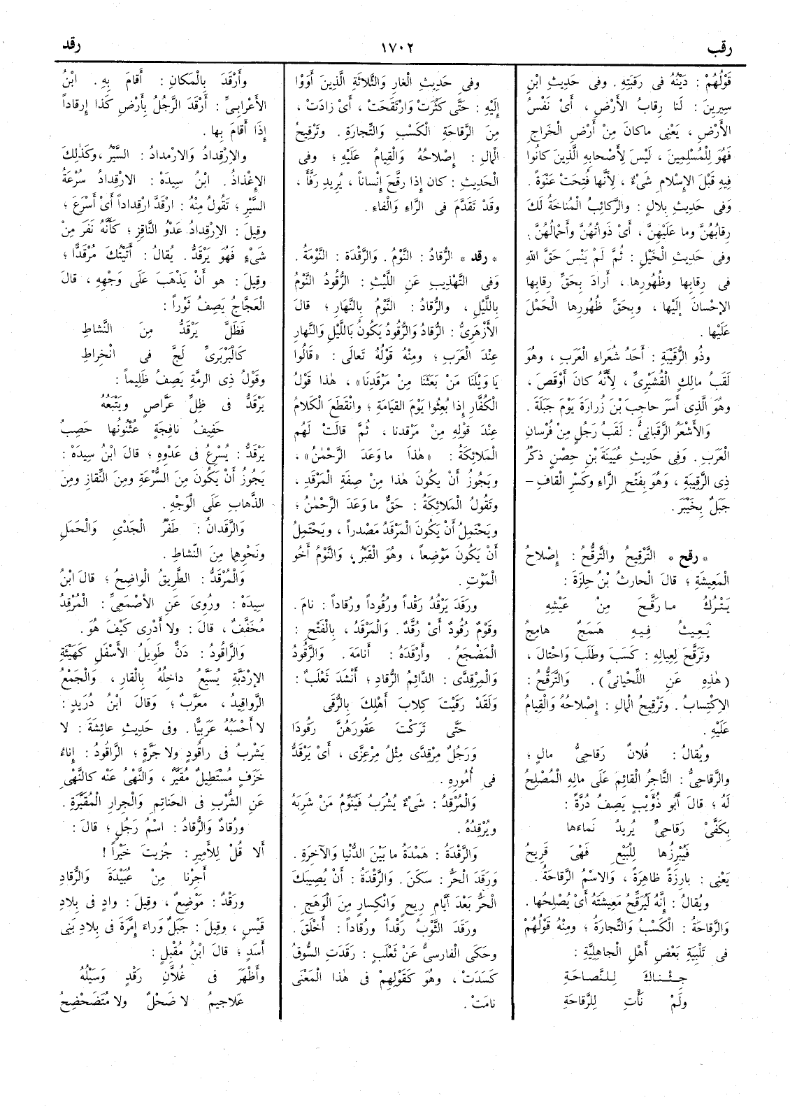قولُهم دَيْنُه في رَقَبَتِه وفي حديث ابنِ سِيرين لَنا رِقابُ الأَرضِ أَي نَفْس الأَرضِ يعني ما كان من أَرضِ الخَراجِ فهو للمسلمين ليس لأَصحابهِ الذين كانوا فيه قَبْلَ الإِسلامِ شيءٌ لأَنها فُتِحَتْ عَنْوَةً وفي حديث بِلالٍ والرَّكائِب المُناخَة لكَ رِقابُهُنَّ وما عليهِنَّ أَي ذَواتُهنَّ وأَحمالُهنّ وفي حديث الخَيْلِ ثم لمْ يَنْسَ حَقَّ اللّه في رِقابِها وظُهورِها أَراد بحَقِّ رِقابِها الإِحْسانَ إِليها وبحَقِّ ظُهورِها الحَمْلَ عليها وذُو الرُّقَيْبة أَحدُ شُعراءِ العرب وهو لَقَب مالِكٍ القُشَيْرِيِّ لأَنه كان أَوْقَصَ وهو الذي أَسَرَ حاجبَ بن زُرارة يَوْمَ جَبَلَة والأَشْعَرُ الرَّقَبانيُّ لَقَبُ رجلٍ من فُرْسانِ العَرَب وفي حديث عُيَينة بنِ حِصْنٍ ذِكْرُ ذي الرَّقِيبة وهو بفتح الراءِ وكسرِ القافِ جَبَل بخَيْبَر