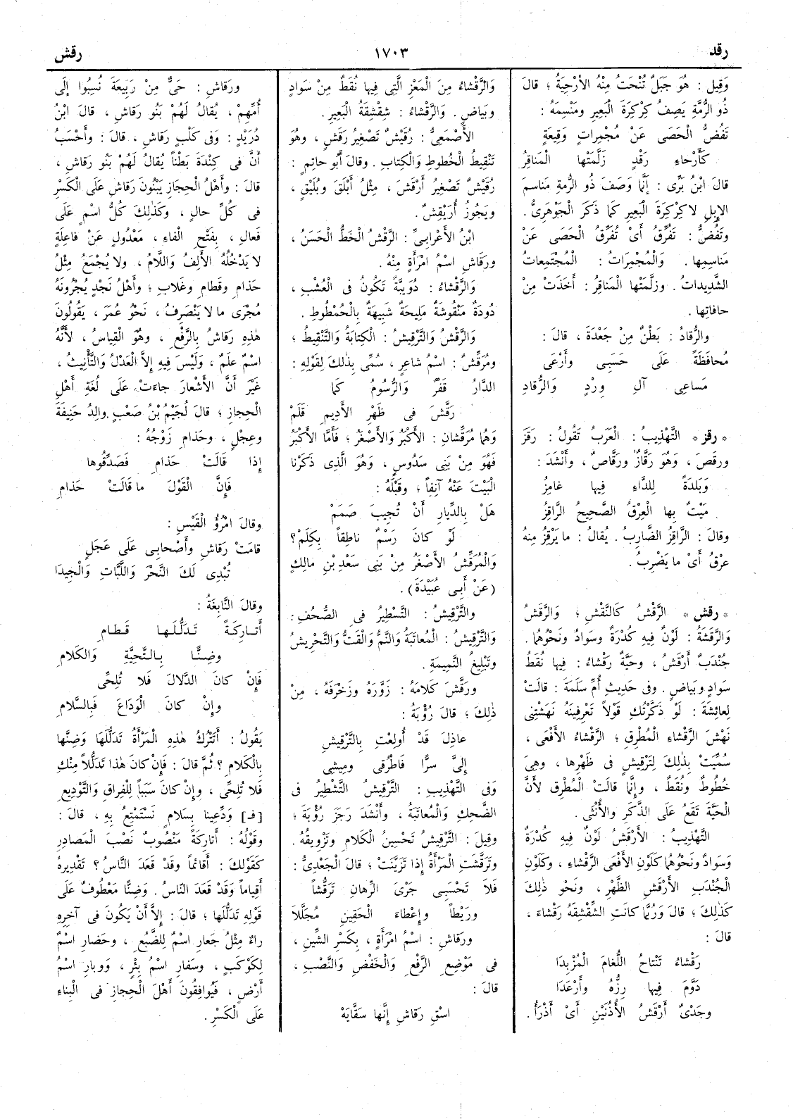 ( رقش ) الرَّقْش كالنقْش والرَّقَشُ والرَّقَشةُ لون فيه كدرة وسواد ونحوهما جُنْدَب أَرْقَشُ وحَيَّة رقْشاء فيها نقط سواد وبياض وفي حديث أُم سلمة قالت لعائشة لو ذكَّرْتُكِ قولاً تَعْرِفينه نهشتني نَهْشَ الرَّقَشاء المُطْرِق الرَقشاء الأَفعى سميت بذلك لترقيش في ظَهرها وهي خطوط ونقط وإِنما قالت المطرق لأَن الحية تقع على الذكر والأُنثى التهذيب الأَرْقَشُ لون فيه كدرة وسواد ونحوُهما كلون الأَفعى الرَّقشاء وكلون الجُنْدَب الأَرْقَشِ الظهر ونحو ذلك كذلك قال وربما كانت الشِّقْشِقةُ رقْشاءَ قال رقشاءُ تَنْتاحُ اللُّغامَ المُزْبِدا دَوَّمَ فيها رِزُّه وأَرْعَدا وجَدْيٌ أَرْقَشُ الأُذنين أُ أَذْرَأُ والرقْشاء من المعز التي فيها نقط من سواد وبياض والرقْشاء شِقْشِقَةُ البعير الأَصمعي رُقَيْش تصغير رَقَش وهو تنقيط الخطوط والكتاب وقال أَبو حاتم رُقَيش تصغير أَرْقَش مثل أَبْلَق وبُلَيق ويجوز أُرَيْقِش ابن الأَعرابي الرَّقْش الخطّ الحسنُ ورَقَاشِ اسم امرأَة منه والرَّقْشاءُ دُوَيْبَّة تكون في العُشْب دُودةٌ منقوشة مَلِيحة شبيهة بالحُمْطُوطِ والرَّقْشُ والترْقِيشُ الكتابةُ والتنقيط ومُرَقِّشٌ اسم شاعر سمي بذلك لقوله الدارُ قَفْرُ والرُّسُوم كما رَقَّشَ في ظَهْر الأَدِيم قَلَمْ وهما مُرَقِّشانِ الأَكْبرُ والأَصْغر فأَما الأَكبر فهو من بني سَدُوسٍ وهو الذي ذكرنا البيتَ عنه آنفاً وقبله هل بالديار أَن تُجِيبَ صَمَمْ لو كان رَسْمٌ ناطقاً بِكِلَمْ ؟ والمُرَقَّشُ الأَصْغر من بني سعد بن مالك عن أَبي عبيدة والترْقِيشُ التسطير في الصحف والترْقِيشُ المُعاتبةُ والنَّمّ والقَتّ والتحريش وتَبْليغ النَّمِيمة ورَقَّشَ كلامَه زَوّرَه وزَخْرَفه من ذلك قال رؤبة عاذِلَ قد أُولِعْتِ بالترْقِيشِ إِليَّ سرّاً فاطْرُفي ومِيشِي وفي التهذيب الترْقِيشُ التشْطِير في الضحك والمُعاتبةُ وأَنشد رجز رؤبة وقيل الترْقِيشُ تَحْسين الكلام وتَزْويقُه وتَرَفَّشَت المرأَةُ إِذا تزيّنت قال الجعدي فلا تحسَبي جَرْيَ الرِّهان ترقُّشاً ورَيْطاً وإِعطاءَ الحَقِينِ مُجَلّلا ورَقاشِ اسم امرأَة بكسر الشين في موضع الرفع والخفض والنصب قال اسْقِ رَقاشِ إِنّها سَقَّايَه ورَقاشِ حيٌّ من رَبيعةَ نُسِبوا إِلى أُمّهم يقال لهم بنو رَقاشِ قال ابن دريد وفي كلبٍ رَقاشٍ قال وأَحسَب أَن في كِنْدة بطْناً يقال لهم بنو رَقاشِ قال وأَهل الحجاز يَبْنون رَقاشِ على الكسر في كل حال وكذلك كل اسم على فَعالِ بفتح الفاء معدول عن فاعلة لا يدخله الأَلف واللام ولا يُجْمع مثل حَذامِ وقَطامِ وغَلابِ وأَهل نجد يُجْرونه مُجْرى ما لا ينصرف نحو عُمَرَ يقولون هذه رَقاشُ بالرفع وهو القياس لأَنه اسم علَم وليس فيه إِلا العدل والتأْنيث غير أَن الأَشعار جاءت على لغة أَهل الحجاز قال لُجَيم بن صَعْب والد حَنيفة وعِجْل وحذامِ زوجُه إِذا قالت حَذامِ فصدِّقوها فإِن القولَ ما قالت حذامِ وقال امرؤ القيس قامت رَقاشِ وأَصحابي على عَجَلٍ تُبْدي لك النحْرَ واللّبَّاتِ والجِيدا وقال النابغة أَتاركةً تَدَلُّلَها قَطامِ وضِنّاً بالتحية والكلامِ فإِن كان الدلالَ فلا تُلِحِّي وإِن كان الودَاعَ فبالسلامِ يقول أَتترك هذه المرأَةُ تدلُّلَها وضِنَّها بالكلام ؟ ثم قال فإِن كان هذا تدلّلاً منك فلا تُلِحِّي وإِن كان سبباً للفراق والتوديع ودّعِينا بسلام نَسْتمتع به قال وقولُه أَتاركةً منصوبٌ نَصْبَ المصادر كقولك أَقائماً وقد قعد الناسُ ؟ تقديره أَقِياماً وقد قعد الناسُ وضِنّاً معطوفٌ على قوله تدلُّلَها قال إِلا أَن يكون في آخره راء مثل جَعارِ اسم للضبُع وحَضارِ اسمٌ لكوكب وسَفارِ اسم بئر ووَبارِ اسم أَرض فيوافقون أَهلَ الحجاز في البناء على الكسر