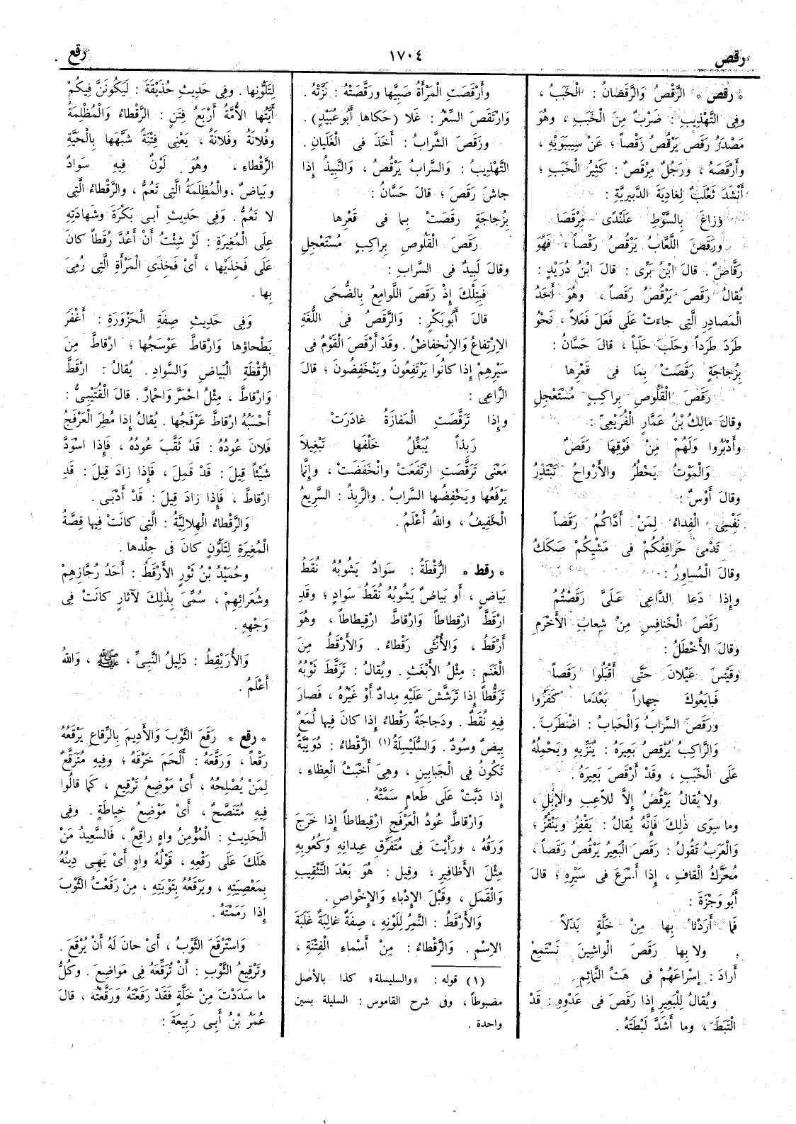 ( رقص ) الرَّقْصُ والرَّقَصانُ الخَبَبُ وفي التهذيب ضَرْبٌ من الخَبَب وهو مصدر رَقَصَ يَرْقُص رَقْصاً عن سيبويه وأَرْقَصَه ورجل مِرْقَصٌ كثير الخبب أَنشد ثعلب لغادية الدبيرية وزاغ بالسَّوْطِ عَلَنْدىً مِرْقَصا ورَقَصَ اللَّعَّابُ يَرْقُص رَقْصاً فهو رقَّاصٌ قال ابن بري قال ابن دريد يقال رَقَصَ يَرْقُص رَقَصاً وهو أَحد المصادر التي جاءت على فَعَلَ فَعَلاً نحو طَرَدَ طَرَداً وحَلَبَ حَلَباً قال حسان بِزُجاجةٍ رَقَصَت بما في قَعْرِها رَقَصَ القَلُوصِ بِراكبٍ مُسْتَعْجِلِ وقال مالك بن عمار الفُرَيْعِيّ وأَدْبَرُوا ولَهُمْ من فَوْقِها رَقَصٌ والموتُ يَخْطُرُ والأَرْواحُ تَبْتَدِرُ وقال أَوس نَفْسي الفِداءُ لِمَنْ أَدّاكُمُ رَقَصاً تَدْمَى حَراقِفُكم في مَشْيِكم صَكَكُ وقال المساور وإِذا دَعا الداعِي عَلَيّ رَقَصتُمُ رَقَصَ الخَنافِس من شِعابِ الأَخْرَم وقال الأَخطل وقَيْس عَيْلانَ حتى أَقْبَلُوا رَقَصاً فبايَعُوك جِهاراً بَعدما كَفَرُوا ورَقَصَ السَّرابُ والحَبابُ اضطرب والراكب يُرقِصُ بَعِيرَهُ يُنَزِّيه ويَحْمِلُه على الخَبَبِ وقد أَرْقَصَ بَعِيرَه ولا يقال يَرْقُص إِلا لِلأعِب والإِبلِ وما سوى ذلك فإِنه يقال يَقْفِزُ ويَنْقُزُ والعرب تقول رَقَصَ البعيرُ يَرْقُصُ رَقَصاً مُحرك القاف إِذا أَسرع في سيره قال أَبو وجزة فما أَرَدْنا بها مِنْ خَلَّةٍ بدَلاً ولا بها رَقَصَ الواشِين نَسْتَمِعُ أَراد إِسراعهم في هَتِّ النَّمائم ويقال للبعير إِذا رَقَصَ في عَدْوِه قد الْتَبَطَ وما أَشدَّ لَبْطَتَه وأَرْقَصَت المرأَة صبِيَّها ورَقَّصَته نَزَّتْه وارْتَقَصَ السِّعْرُ غلا حكاها أَبو عبيد ورَقَصَ الشرابُ أَخَذَ في الغَلَيَانِ التهذيب والشرابُ يَرْقُصُ والنبِيذُ إِذا جاشَ رَقَصَ قال حسان بِزُجاجةٍ رقَصَتْ بما في قَعْرِها رَقَصَ القَلُوصِ براكبٍ مُسْتَعْجِل وقال لَبِيد في السراب فبِتِلْكَ إِذ رَقَصَ اللوامِعُ بالضُّحَى قال أَبو بكر والرَّقَصُ في اللغة الارتفاع والانخفاض وقد أَرْقَصَ القومُ في سَيْرِهم إِذا كانوا يَرْتَفِعُون ويَنْخَفِضُون قال الراعي وإِذا ترَقَّصَت المَفازةُ غادَرَتْ رَبِذاً يُبَغِّلُ خَلْفَها تَبْغِيلا معنى تَرَقَّصَت ارتفعت وانخفضت وإِنما يرفعها ويخفضها السرابُ والرَّبِذُ السريعُ الخفيف واللّه أَعلم ( رقط ) الرُّقْطةُ سواد يشوبُه نُقَطُ بَياضٍ أَو بياضٌ يشوبُه نُقَطُ سوادٍ وقد ارْقَطَّ ارْقِطاطاً وارْقاطَّ ارْقِيطاطاً وهو أَرْقَطُ والأُنثى رَقْطاء والأَرْقَطُ من الغنم مثل الأَبْغَثِ ويقال تَرَقَّطَ ثوبه تَرَقُّطاً إِذا تَرَشَّشَ عليه مِداد أَو غيره فصار فيه نُقط ودجاجة رَقْطاء إِذا كان فيها لُمَعٌ بِيضٌ وسُود والسُّلَيْسِلَة