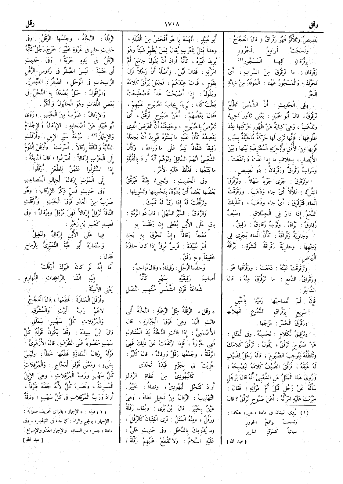 بَصيص وتلأْلُؤ فهو رَقْراق قال العجاج ونَسَجَتْ لَوامِعُ الحَرُورِ بِرَقْرقانِ آلِها المَسْجُورِِ رَقْرقان ما تَرَقْرَق من السراب أَي تحرَّك والمَسْجُور ههنا المُوقد من شدَّة الحَرّ وفي الحديث أَن الشمسَ تَطْلُع تَرَقْرَقُ قال أَبو عبيد يعني تَدُور تجيء وتذهب وهي كناية عن ظُهور حركتها عند طلوعها فإِنها تُرى لها حركةٌ مُتَخَيَّلة بسبب قُربها من الأُفُق وأَبْخِرته المُعْتَرِضة بينها وبين الأَبصار بخلاف ما إِذا علَتْ وارتفعت وسراب رَقْراقٌ ورَقرقانٌ ذو بَصيصٍ وتَرَقرَقَ جرَى جَرْياً سَهلاً وترَقْرق الشيءُ تلأْلأ أَي جاء وذهبَ ورقْرقْت الماء فترقْرقَ أَي جاء وذهب وكذلك الدَّمعُ إِذا دار في الحِملاق وسيفٌ رُقارِقٌ برّاق وثوب رُقارِق رَقيق وجارية رَقْراقة كأَنّ الماء يجري في وجهها وجارية رَقْراقةُ البشَرة برّاقة البياضِ وترَقْرقَت عينه دَمَعت ورَقْرَقَها هو ورَقْراقُ الدمع ما ترَقْرقَ منه قال الشاعر فإِنْ لم تُصاحِبْها رَمَيْنا بأَعْيُنٍ سَريعٍ برَقْراقِ الدُّمُوعِ انْهِلالُها ورَقْرقَ الخمرَ مَزَجَها وتَرْقِيقُ الكلام تحسينه وفي المثل عن صَبُوحٍ تُرَقِّقُ يقول تُرَقِّق كلامك وتُلطِّفه لتوجب الصَّبُوح قاله رجل لضيف له غَبَقَه فرقّق الضيفُ كلامَه ليُصْبِحه وروي هذا المثل عن الشعبي أَنه قال لرجل سأَله عن رجل قبَّل أُمَّ امرأَته فقال حَرُمت عليه امرأَته أَعن صَبوح تُرَقِّق ؟ قال أَبو عبيد اتَّهمه بما هو أَفْحش من القُبلة وهذا مثل للعرب يقال لمن يُظهر شيئاً وهو يريد غيره كأَنه أَراد أَن يقول جامَع أُمَّ امرأَته فقال قَبَّل وأَصله أَن رجلاً نزل بقوم فبات عندهم فجعل يُرقّق كلامه ويقول إِذا أَصبحت غداً فاصْطبحت فعلت كذا يريد إِيجاب الصَّبُوح عليهم فقال بعضهم أَعن صَبُوح تُرقِّق أَي تُعرّض بالصَّبُوح وحقيقته أَنّ الغَرض الذي يَقْصِده كأَنّ عليه ما يستُره فيريد أَن يجعله رَقِيقاً شَفّافاً يَنِمُّ على ما وَراءه وكأَنَّ الشعبي اتَّهم السائل وتوهّم أَنه أَراد بالقُبلة ما يَتْبَعُها فغَلّظ عليه الأَمرَ وفي الحديث وتجيء فِتْنةٌ فيُرَقّقُ بعضُها بَعْضاً أَي يُشَوِّق بتَحسينها وتَسْوِيلها وترقَّقْتَ له إِذا رَقَّ له قلبُك والرَّقاقُ السَّيْر السَّهل قال ذو الرمة باقٍ على الأَيْنِ يُعْطي إِن رَفَقْتَ به مَعْجاً رَقاقاً وإِن تَخْرُقْ به يَخِدِ أَبو عبيدة فرس مُرِقٌّ إِذا كان حافره خفيفاً وبه رَقَقٌ وحِضْنا الرجل رَقيقاه وقال مُزاحِم أَصابَ رَقِيقَيْهِ بِمَهْوٍ كأَنه شُعاعةُ قَرْنِ الشمس مُلْتَهِبِ النَّصْلِ ( رقل ) الرَّقْلة مثل الرَّعْلة النخلةُ التي فاتت اليد وهي فوق الجَبَّارة قال الأَصمعي إِذا فاتت النخلةُ يَد المتناوِل فهي جَبَّارة فإِذا ارتفعت عن ذلك فهي الرَّقْلة وجمعها رَقْلٌ ورِقالٌ قال كثير حُزيَتْ لي بحَزْم فَيْدة تُحْدى كاليَهُودِيِّ من نَطاة الرِّقال أَراد كنخل اليهودي ونَطاةُ خيبرُ التهذيب الرِّقال من نخيل نَطاة وهي عين بخيبر قال ابن بري ويقال رَقْلة ورَقْل ومنه المثل تَرى الفتْيان كالرَّقْل وما يُدْريك بالدَّخْل وفي حديث علي عليه السلام ولا تَقْطَعْ عليهم رَقْلة الرَّقْلة النخلة وجنسها الرَّقْل وفي حديث جابر في غزوة خيبر خرج رجل كأَنه الرَّقْل في يده حربة وفي حديث أَبي حثمة ليس الصَّقْر في رؤوس الرَّقْل الراسخات في الوَحْل الصَّقْرُ الدِّبسُ والرَّاقول حَبْل يُصْعَد به النخل في بعض اللغات وهو الحابُول والكَرُّ والإِرْقال ضرب من الخَبَب وروى أَبو عبيد عن أَصحابه الإِرْقال والإِجْذام والإِجْماز سرعة سير الإِبل وأَرْقَلَت الدابةُ والناقةُ إِرقالاً أَسرعت وأَرْقَل القومُ إِلى الحرب إِرْقالاً أَسرعوا قال النابغة إِذا اسْتُنْزِلوا عنهنَّ للطَّعْن أَرْقَلوا إِلى الموت إِرْقالَ الجِمالِ المَصاعِب وفي حديث قُسٍّ ذكر الإِرْقال وهو ضرب من العَدْو فوق الخَبَب وأَرْقَلَتِ الناقةُ تُرْقِل إِرقالاً فهي مُرْقِل ومِرْ